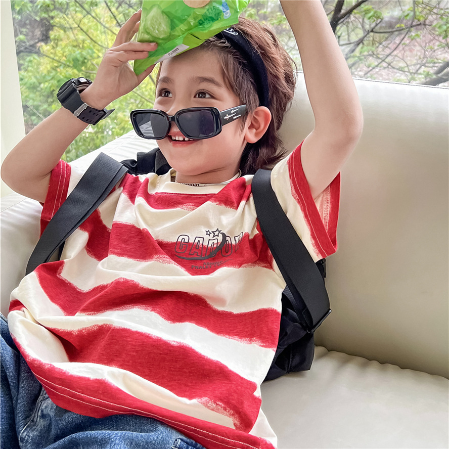 2025 여름 어린이 순면 반팔 소년과 소녀를위한 간단한 유행 타이 염색 가로 줄무늬 반팔 베이비 스타일 티셔츠 탑