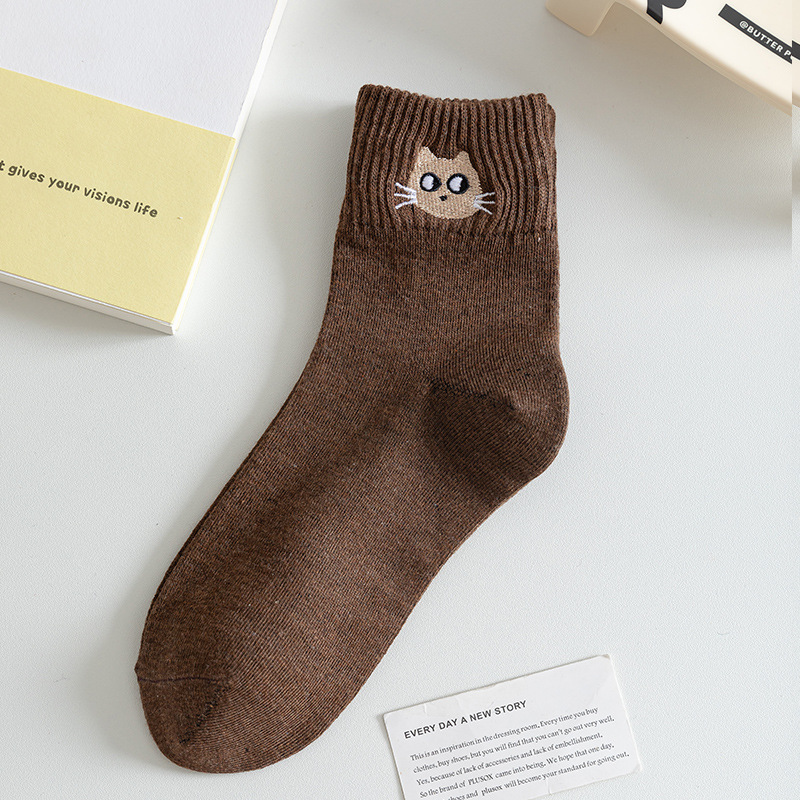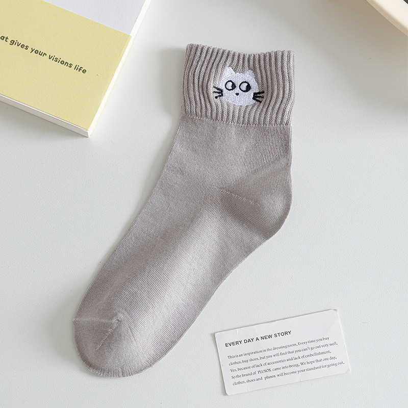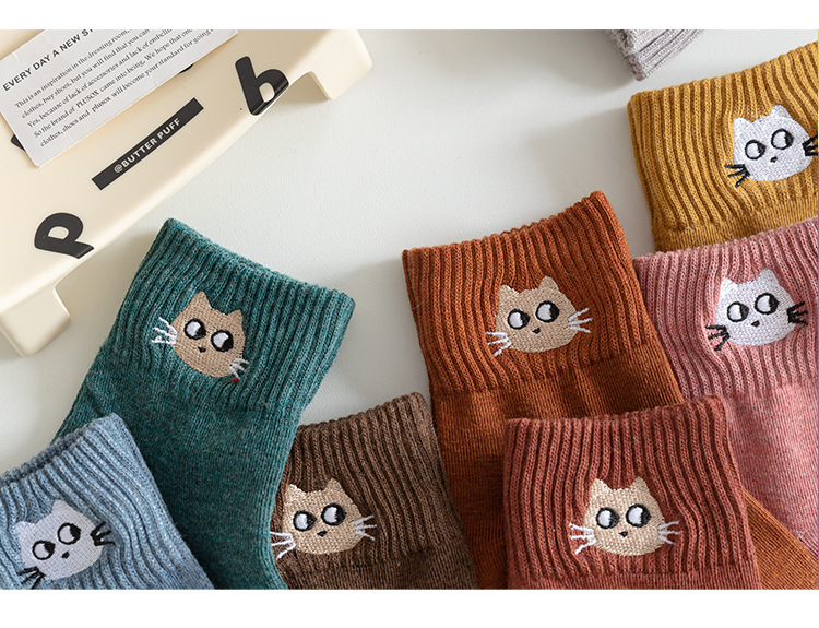 중목 양말 여성용 봄 가을 단색 면 양말 귀여운 고양이 자수 롱 양말 여성용 양말 도매
