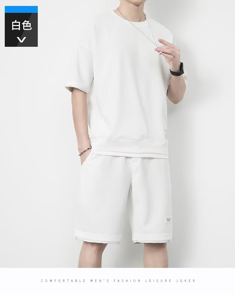 여름 반팔 티셔츠 캐주얼 스포츠 세트 남성 와플 가짜 투피스 느슨한 반팔 티셔츠 반바지 투피스 세트