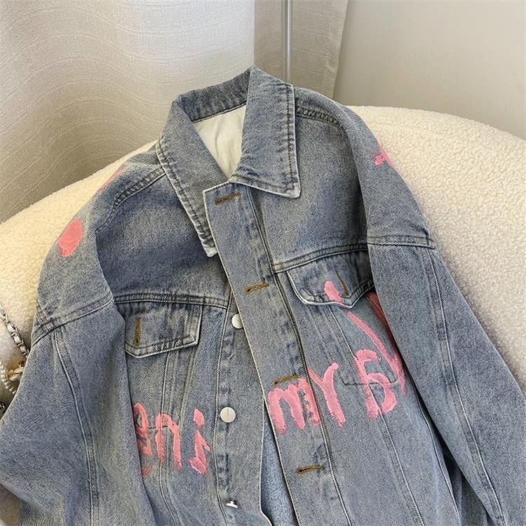 유럽 역 봄과 가을 편지 인쇄 낙서 데님 코트 여자의 디자인 감각 틈새 느슨한 긴팔 재킷 트렌디 탑스토어 가기