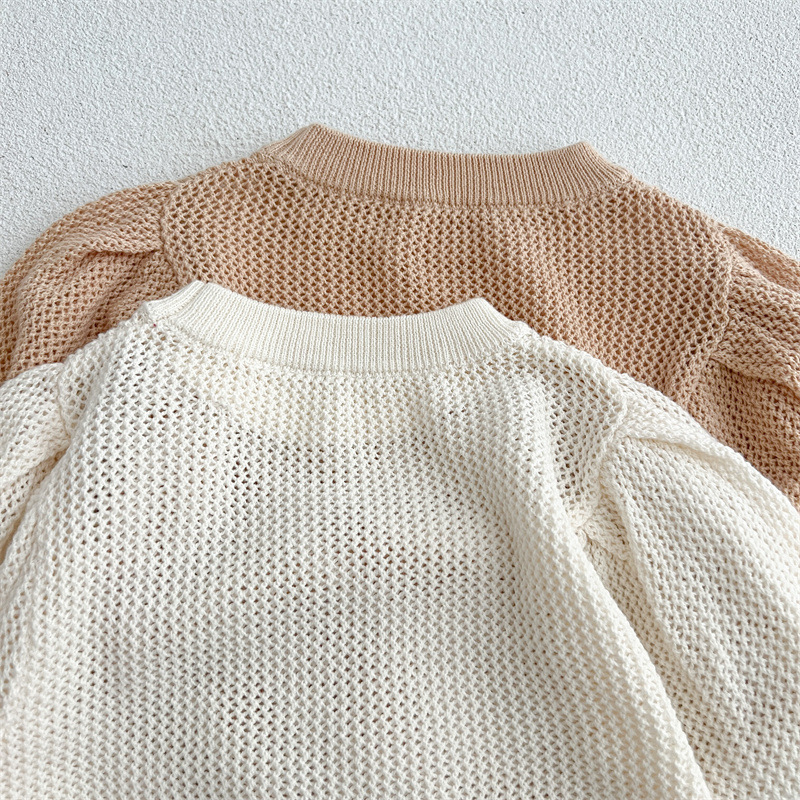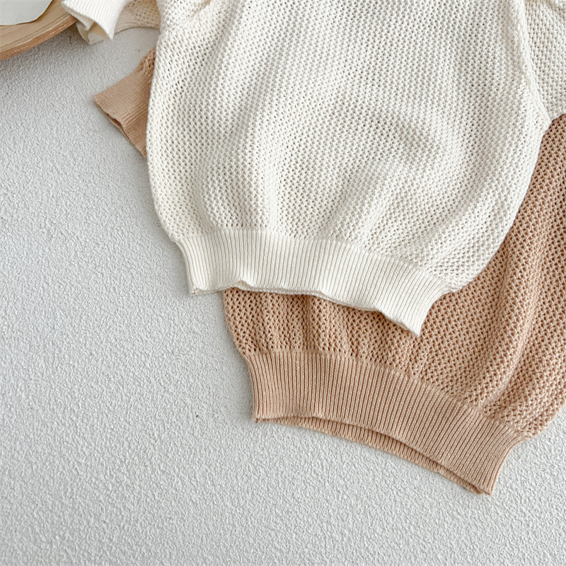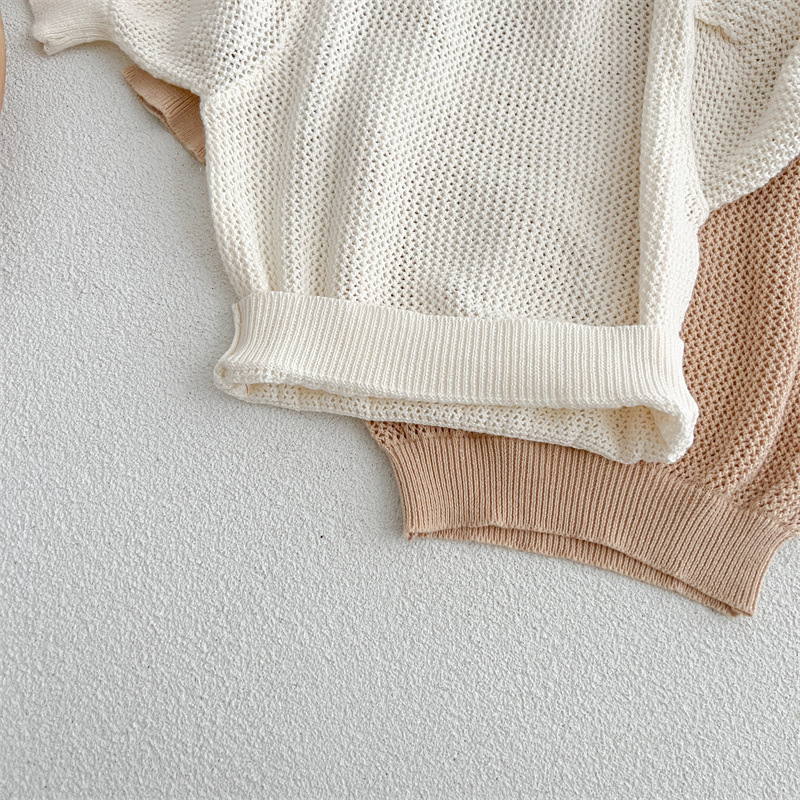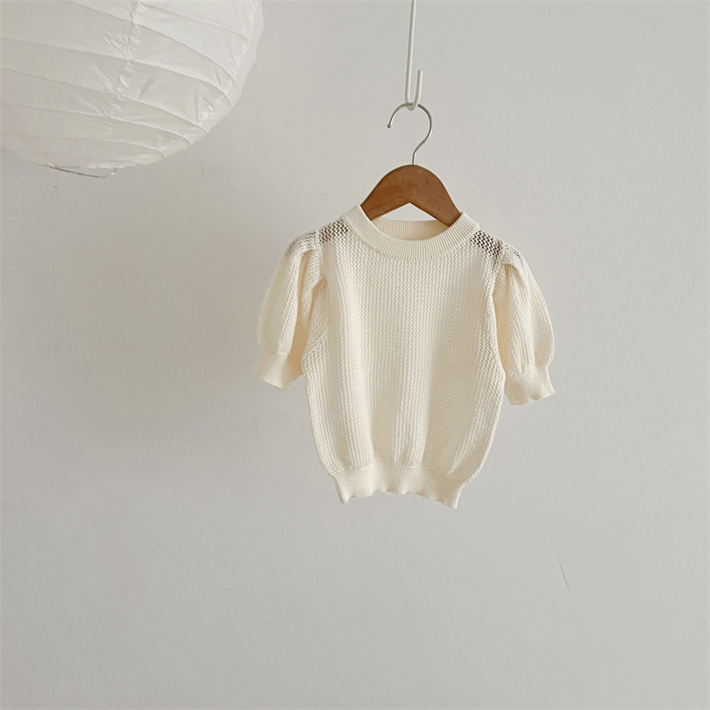 Ins 뜨거운 판매 여름 니트 티셔츠 아기 소녀를위한 일본과 한국 스타일 간단한 중공 부드러운 왁스 반팔 라운드 넥 퍼프 슬리브 탑