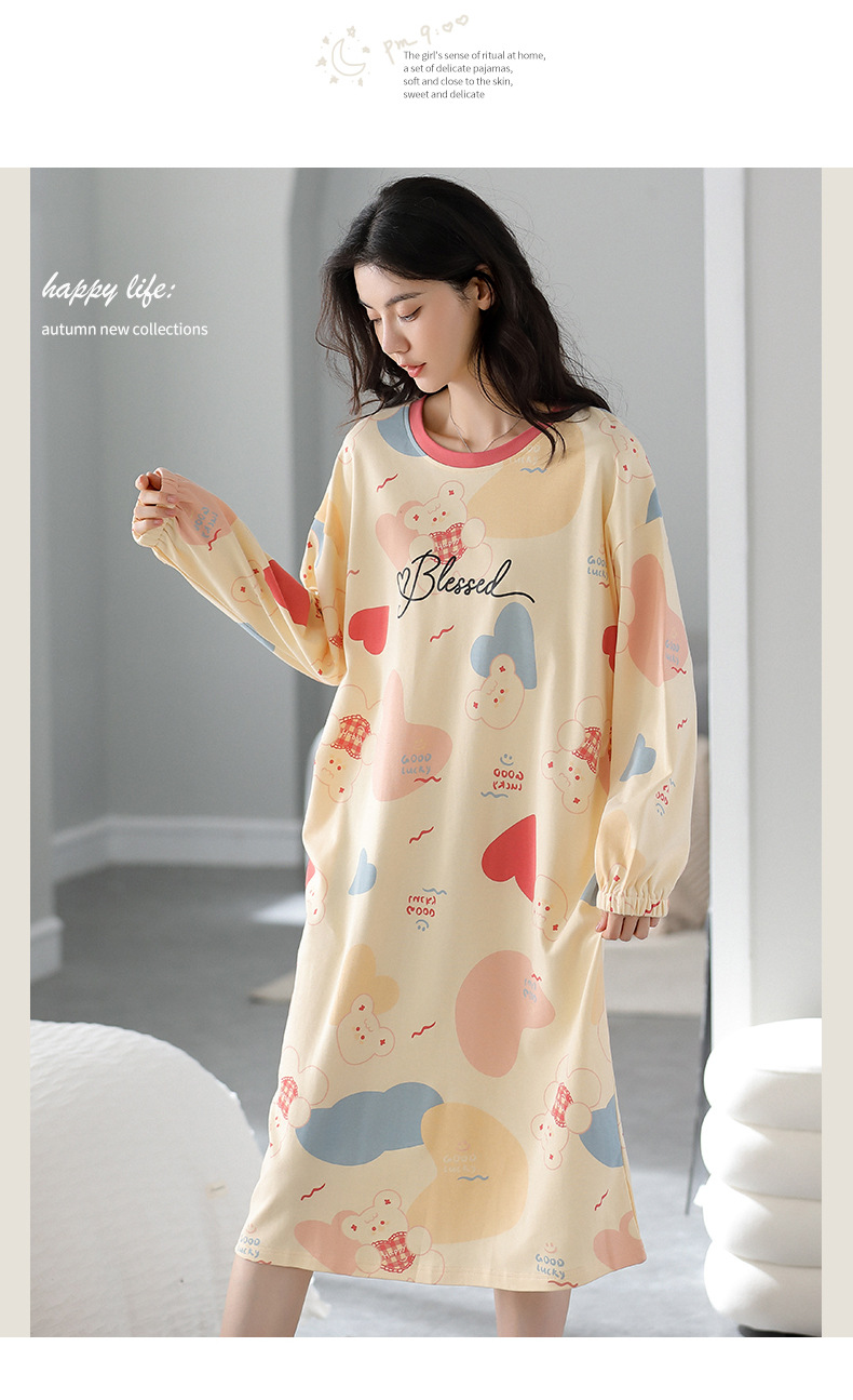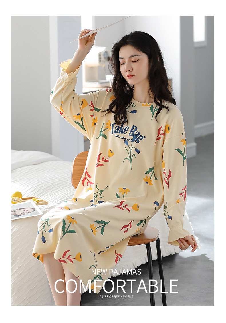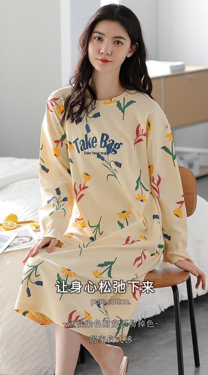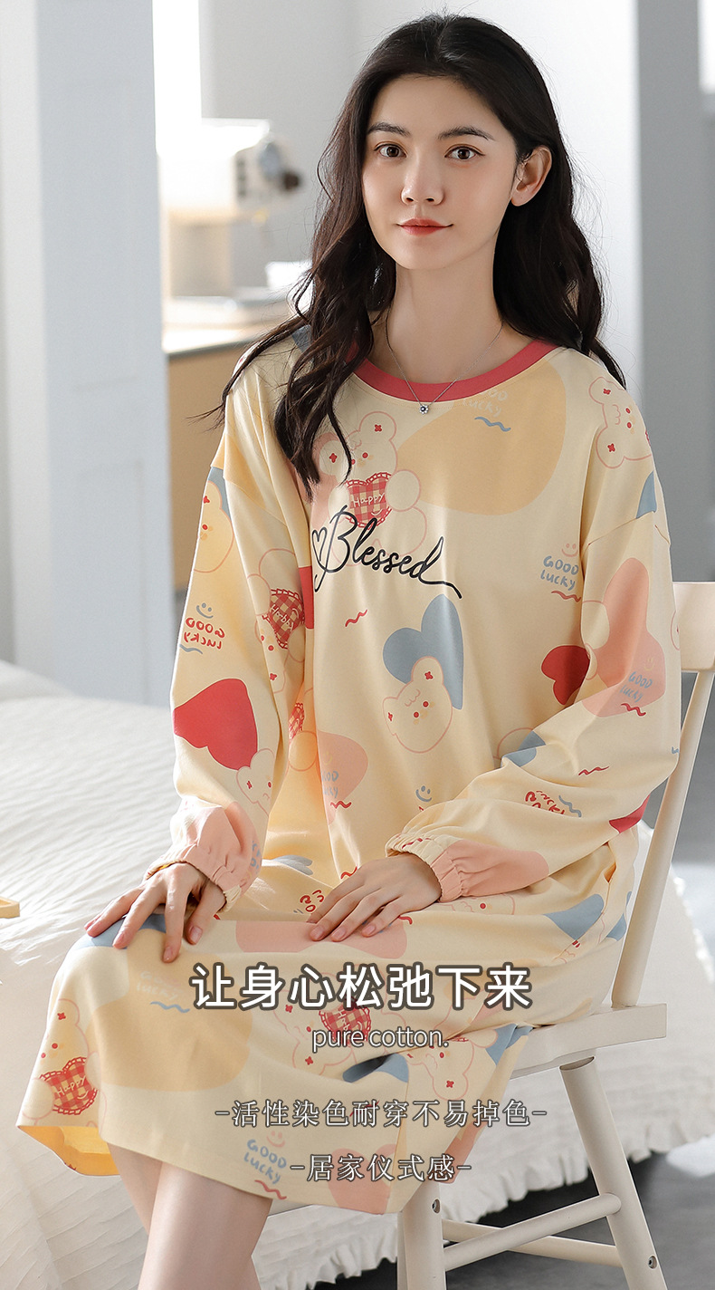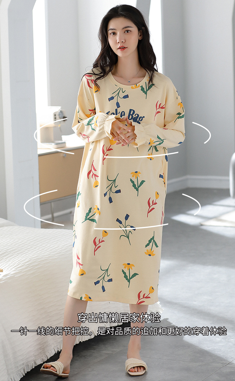 중간 길이 순면 긴팔 잠옷 여자의 봄과 가을 느슨한 라운드 넥 원피스 잠옷 얇은 가정 옷 세트