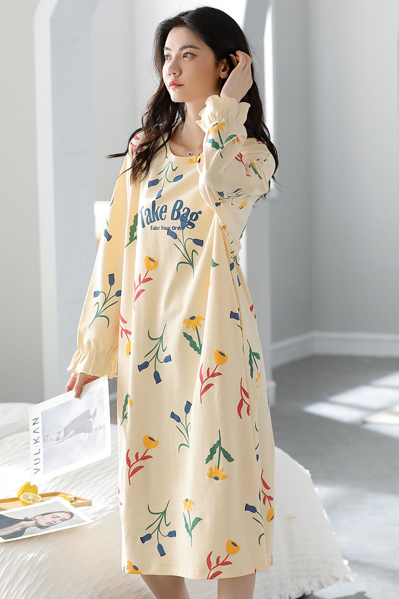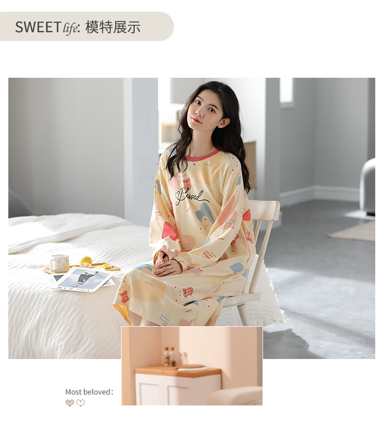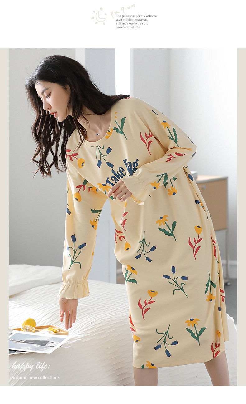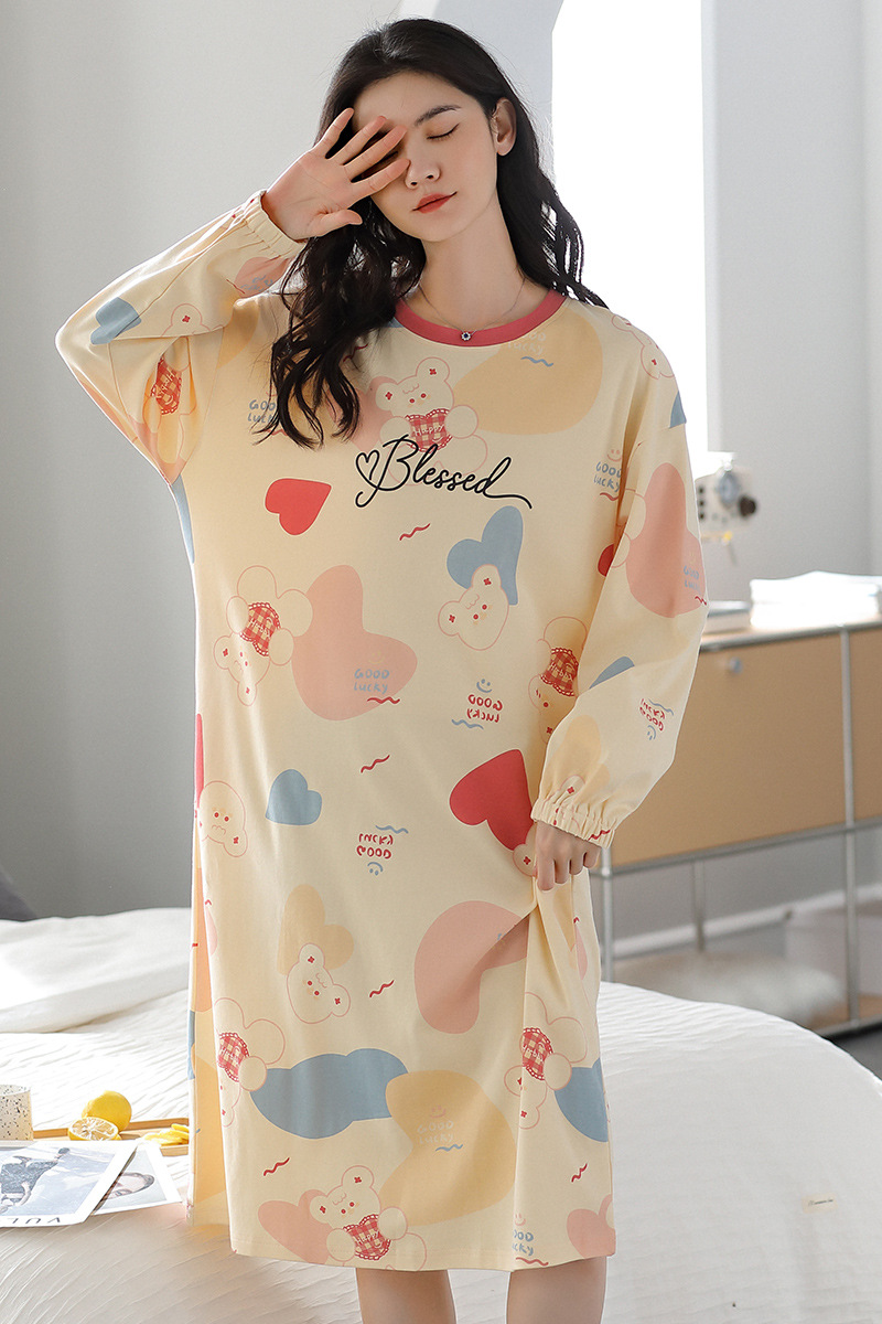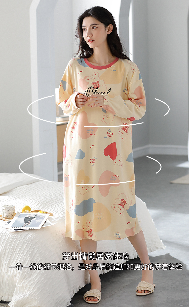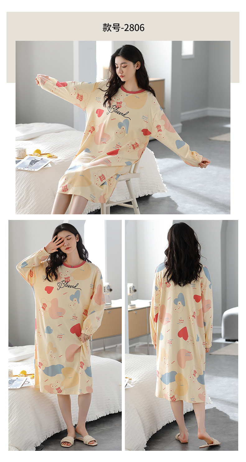 중간 길이 순면 긴팔 잠옷 여자의 봄과 가을 느슨한 라운드 넥 원피스 잠옷 얇은 가정 옷 세트