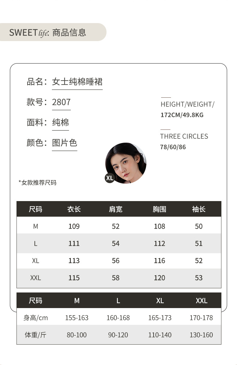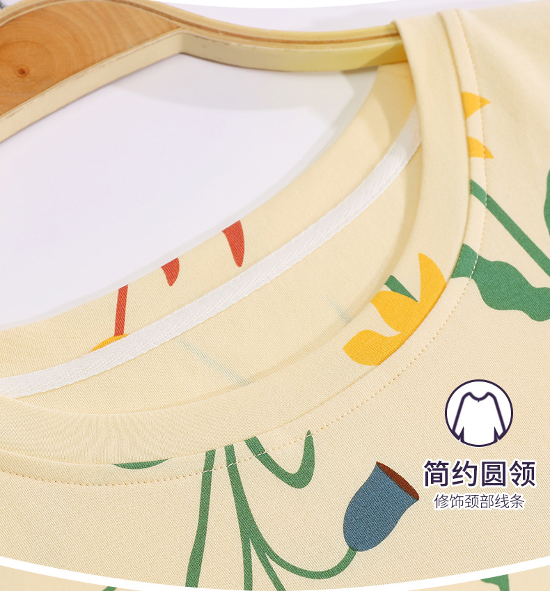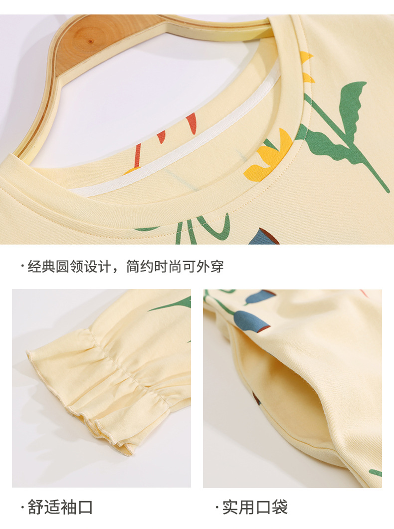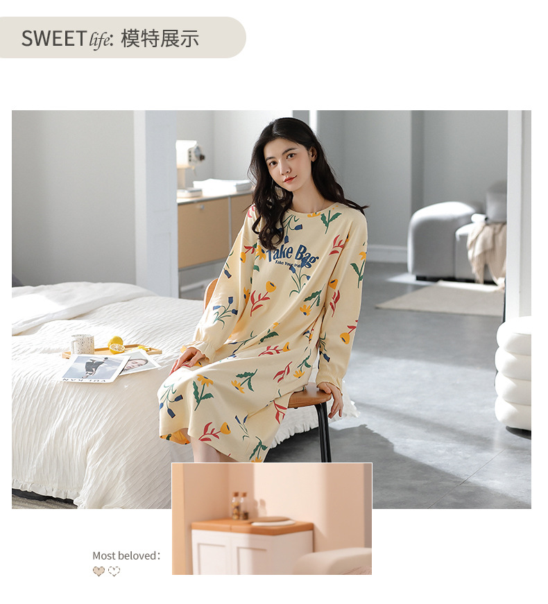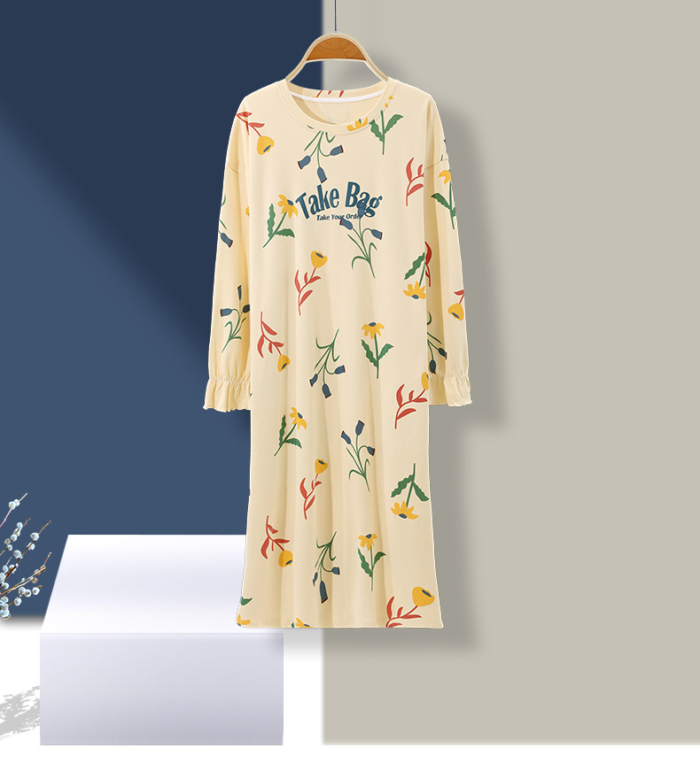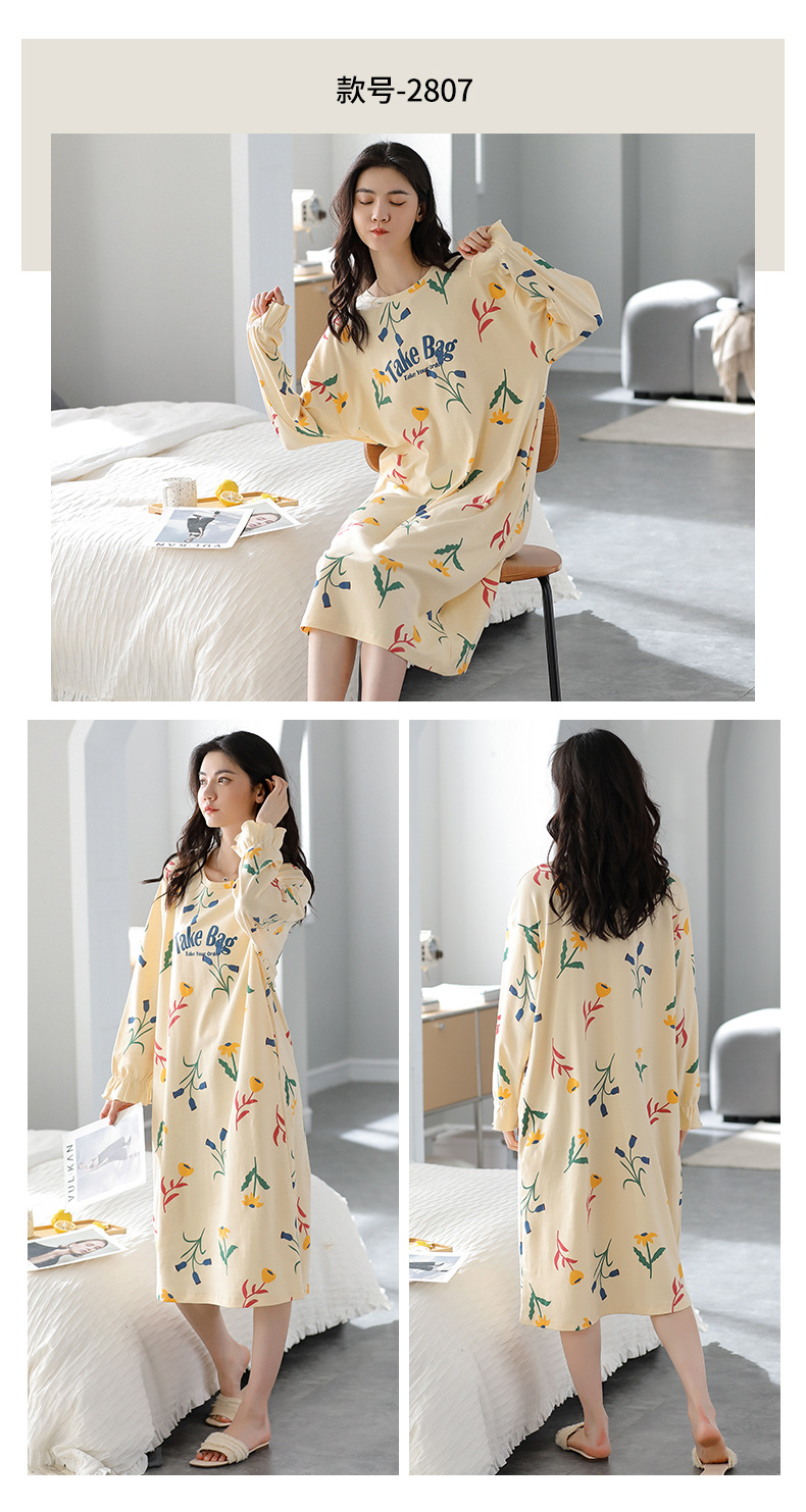 중간 길이 순면 긴팔 잠옷 여자의 봄과 가을 느슨한 라운드 넥 원피스 잠옷 얇은 가정 옷 세트