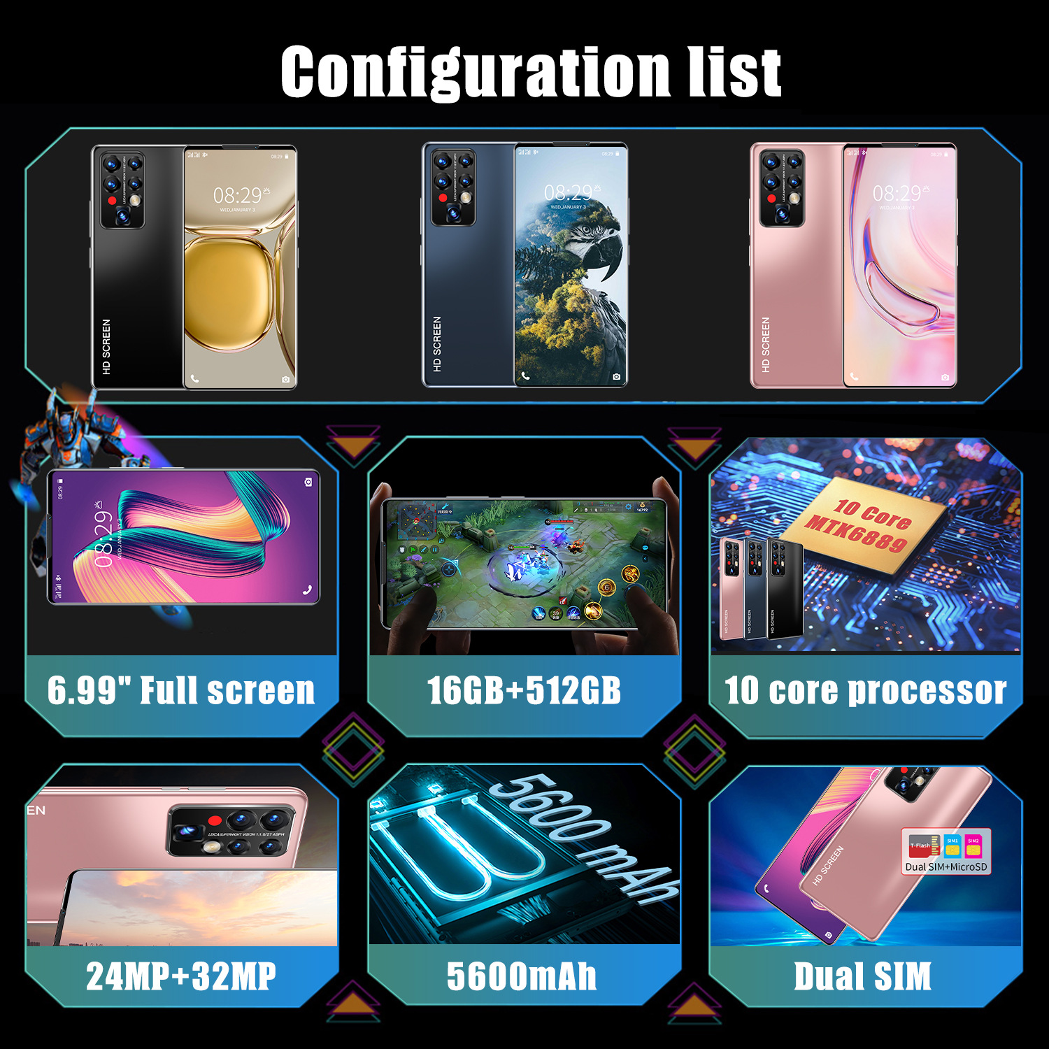국경 간 전자 상거래 휴대 전화 P50PRO 스마트 안드로이드 2 + 16G 메모리 6.517 인치 화면 휴대 전화 지원 세대