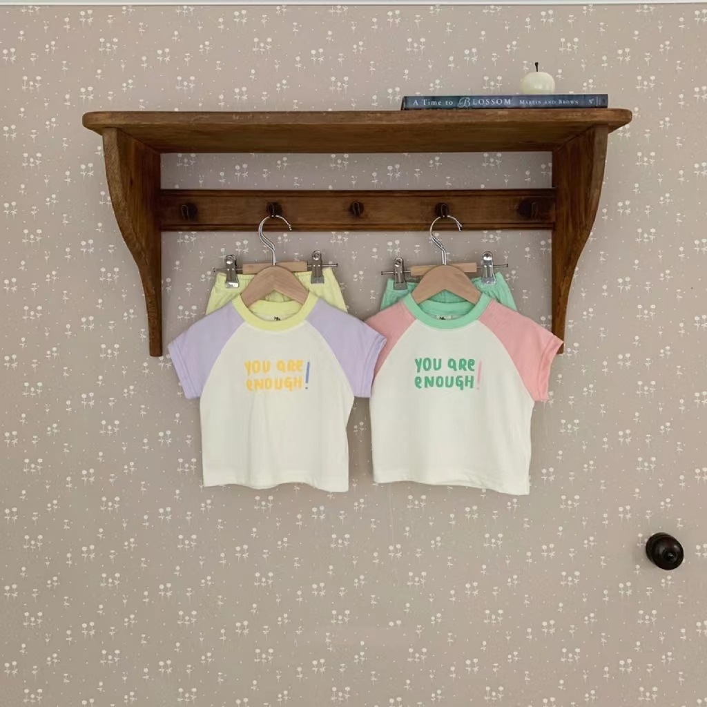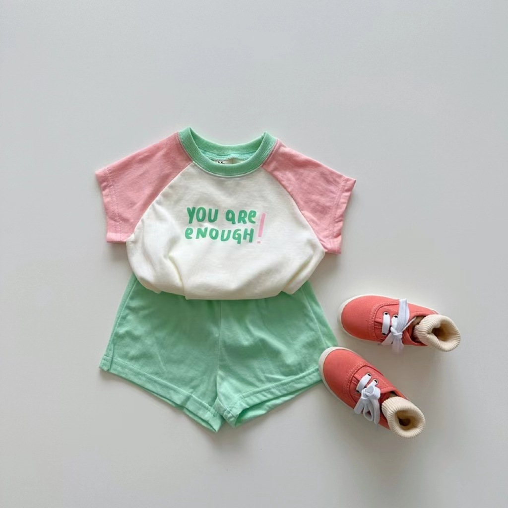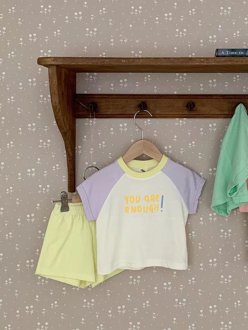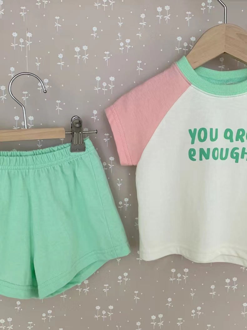 한국식 인 베이비 여름 스티칭 컬러 매칭 3 색 세트 레터 탑 라운드 넥 캔디 올매치 투피스 세트