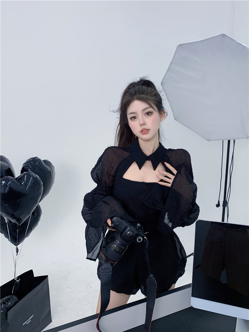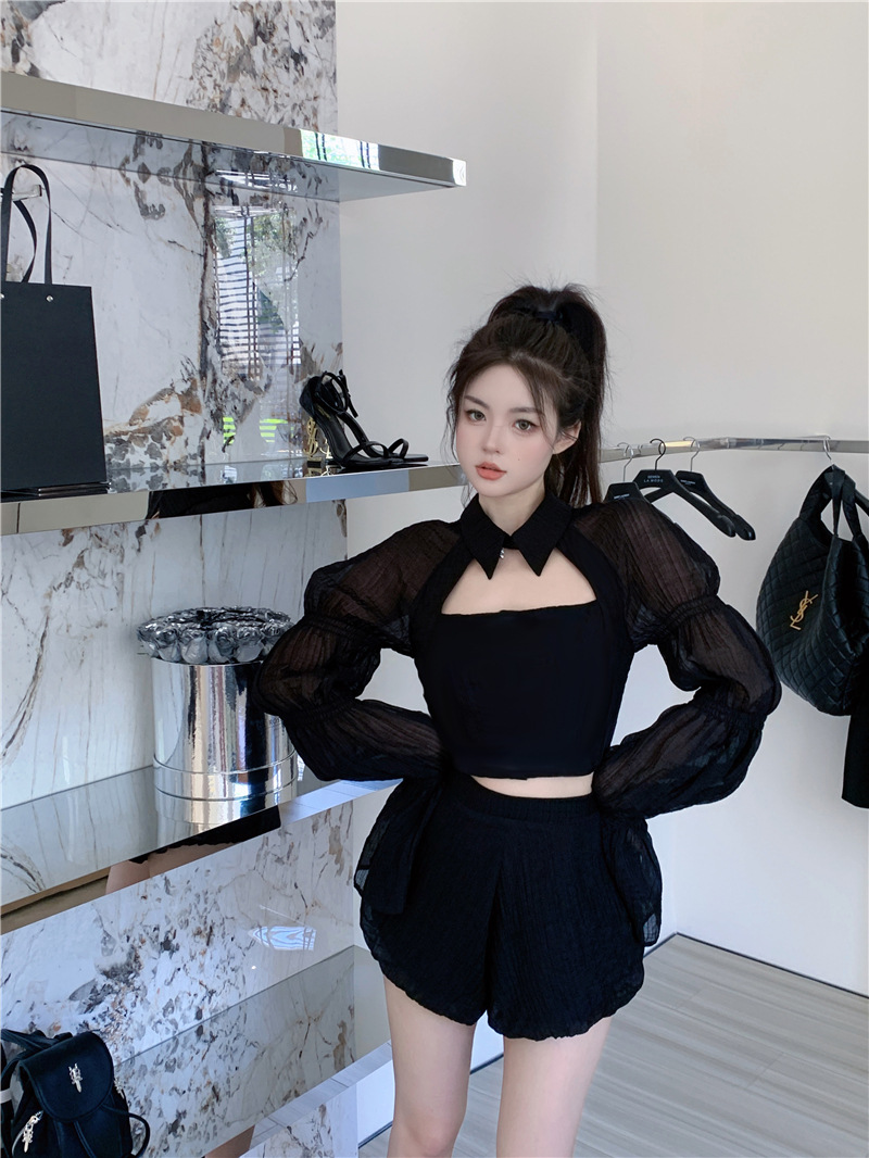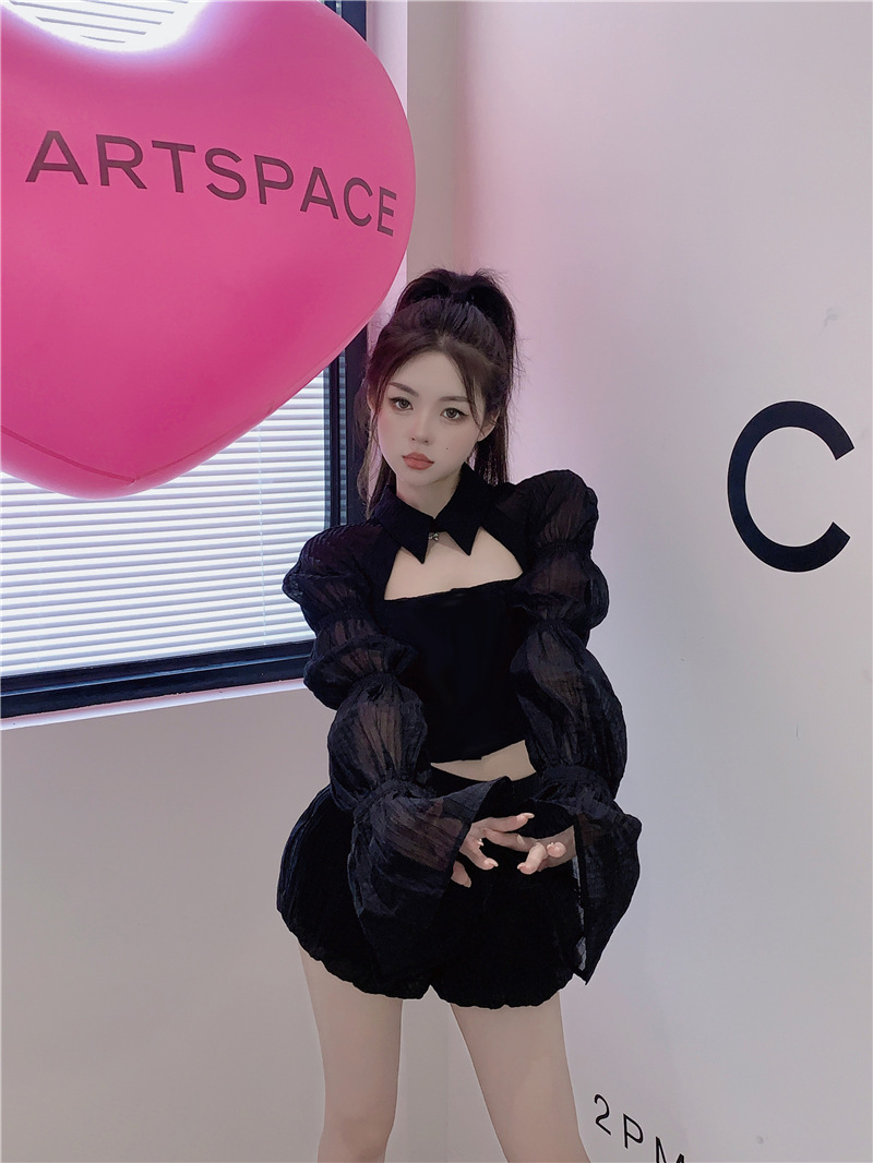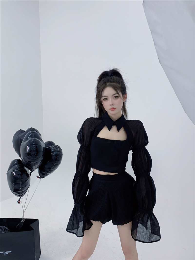 袖子整体是雪纺的   领子有加朴   不会变形  修身短款
