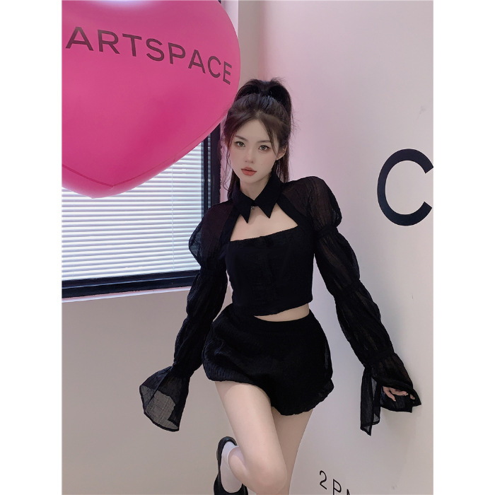 시폰 스티칭 스파이스 소녀 빈 디자인 감각 하트 작은 셔츠 2024 봄과 여름 새로운 폴로 칼라 짧은 긴 소매 셔츠