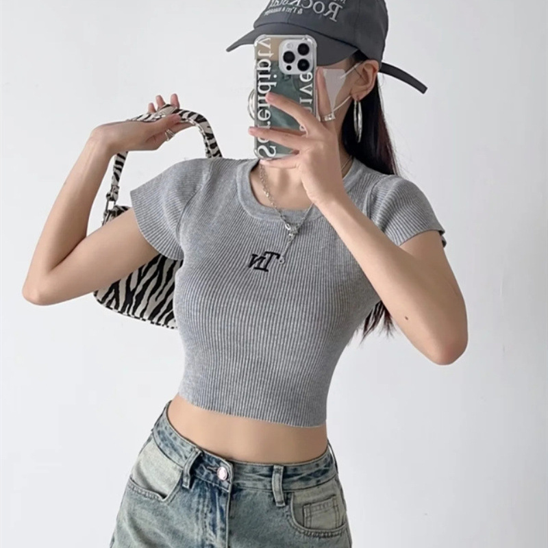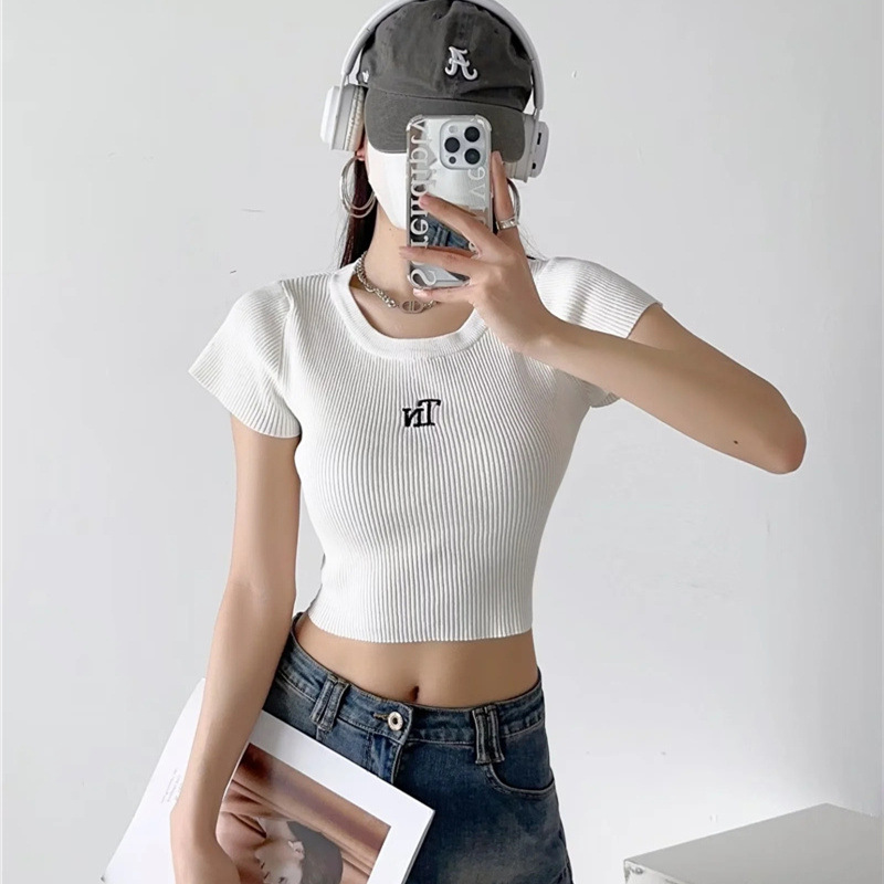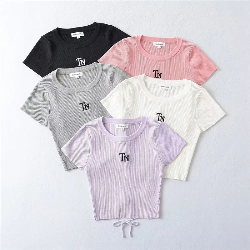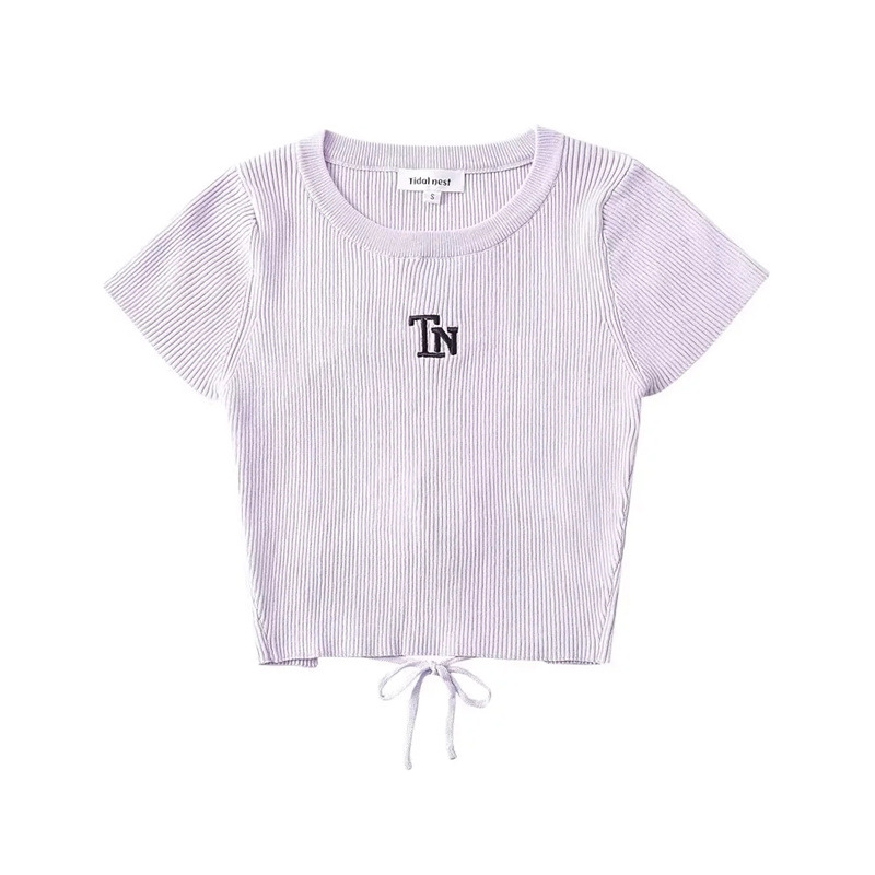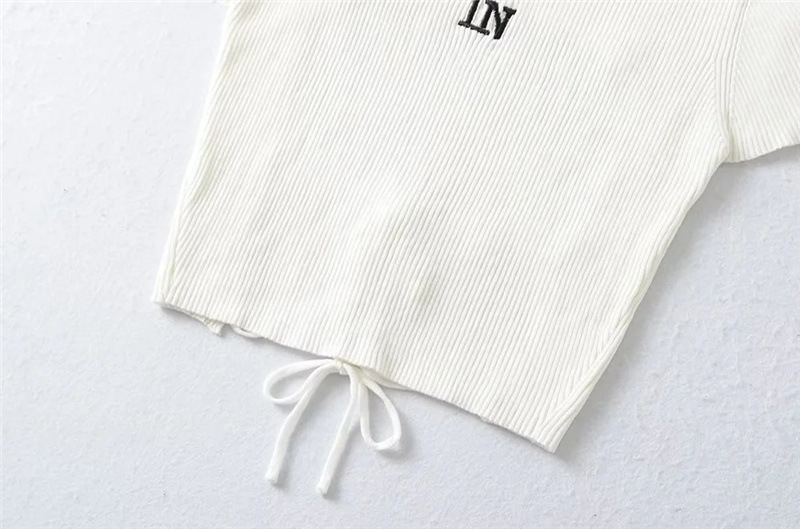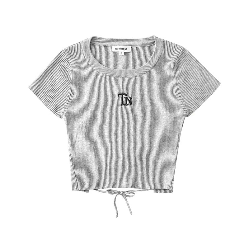아메리칸 스타일 레트로 섹시한 등이없는 레이스 업 하이 웨이스트 배꼽 핫 걸스 반팔 티셔츠 여름 슬림핏 편지 자수 탑스토어 가기