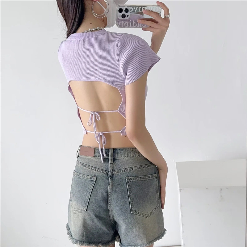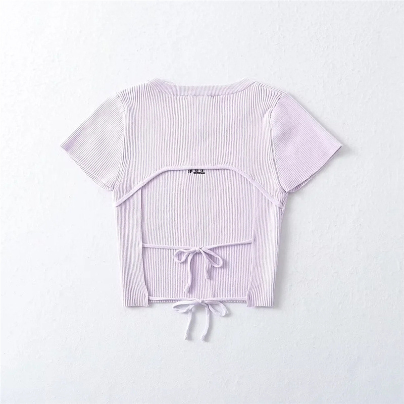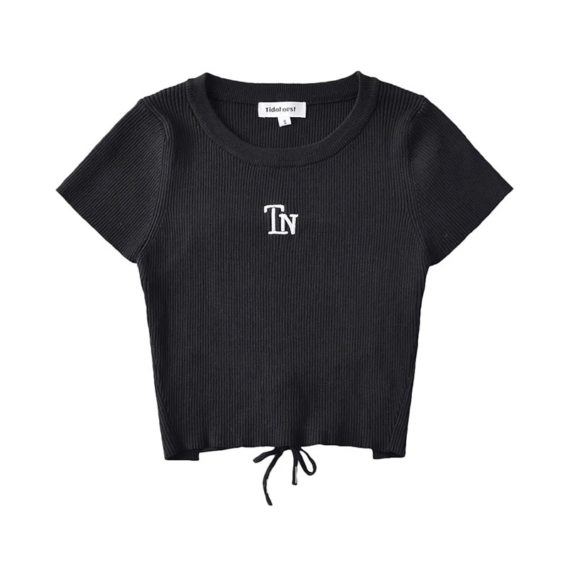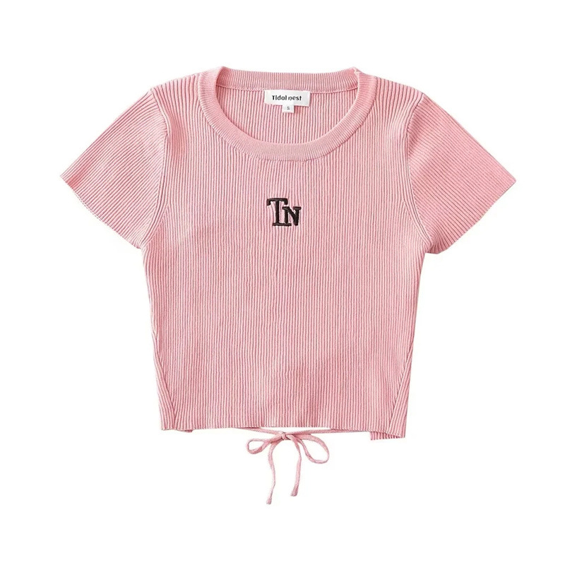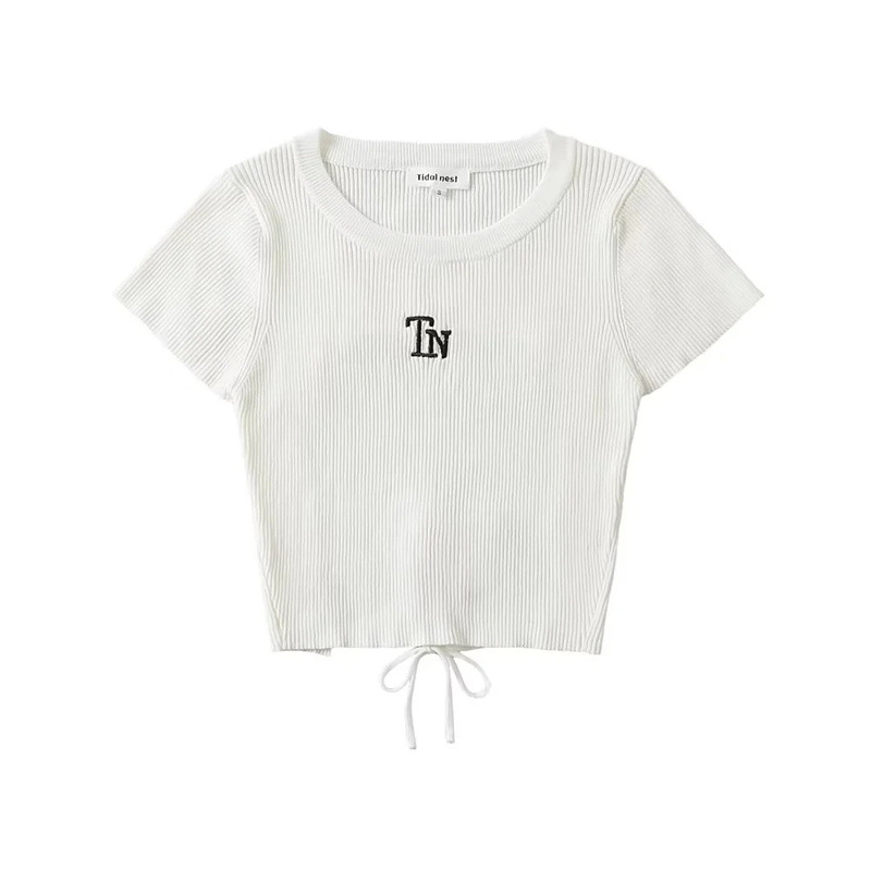 아메리칸 스타일 레트로 섹시한 등이없는 레이스 업 하이 웨이스트 배꼽 핫 걸스 반팔 티셔츠 여름 슬림핏 편지 자수 탑
