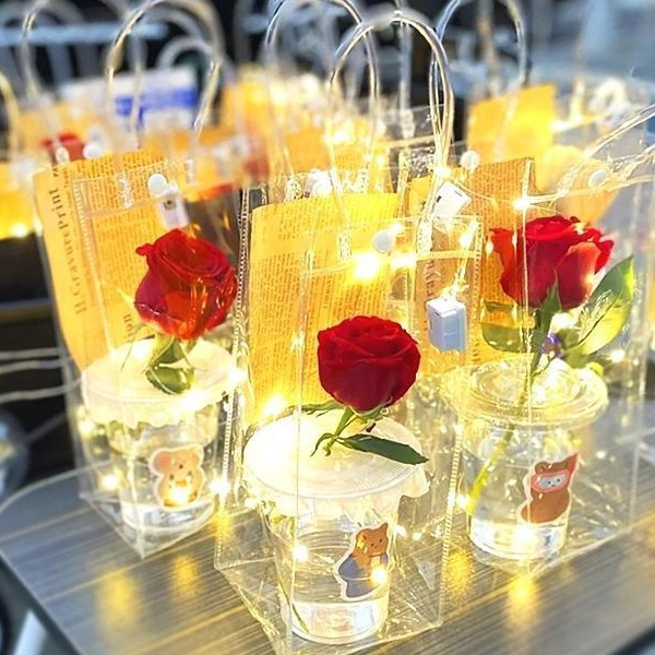 리틀 레드 북 컵 플라워 백 pvc 투명 가방 도매 야시장 노점 그물 레드 핸드백 컵 + 뚜껑 라이트 스트링스토어 가기