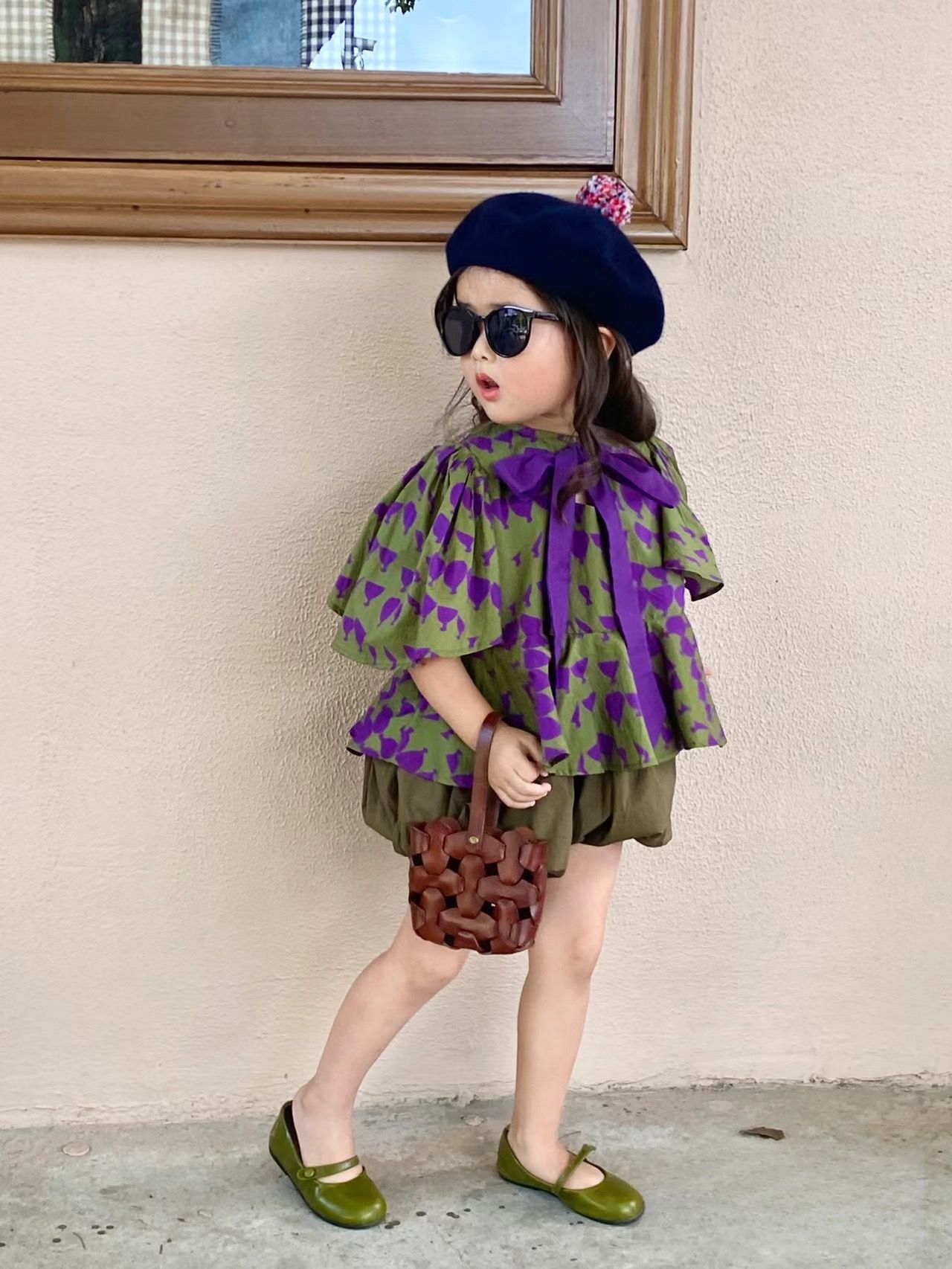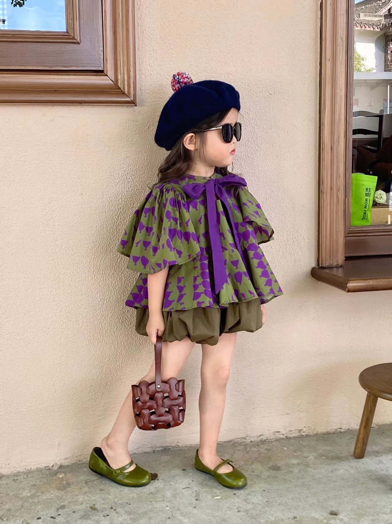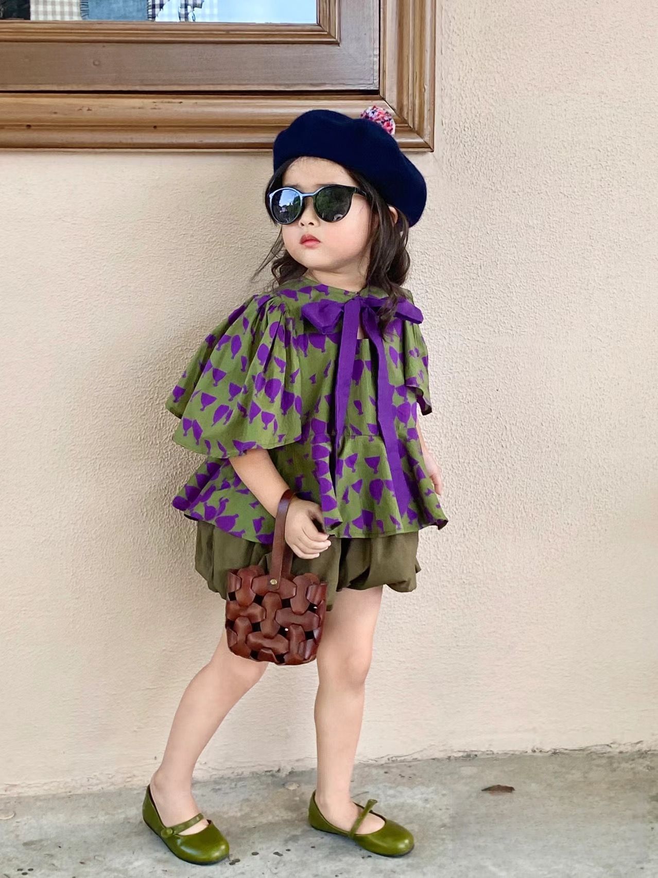 한국 소녀 여름 전체 인쇄 보라색 풍선 활 인형 셔츠 + 다크 그린 새싹 반바지 세트 별도스토어 가기