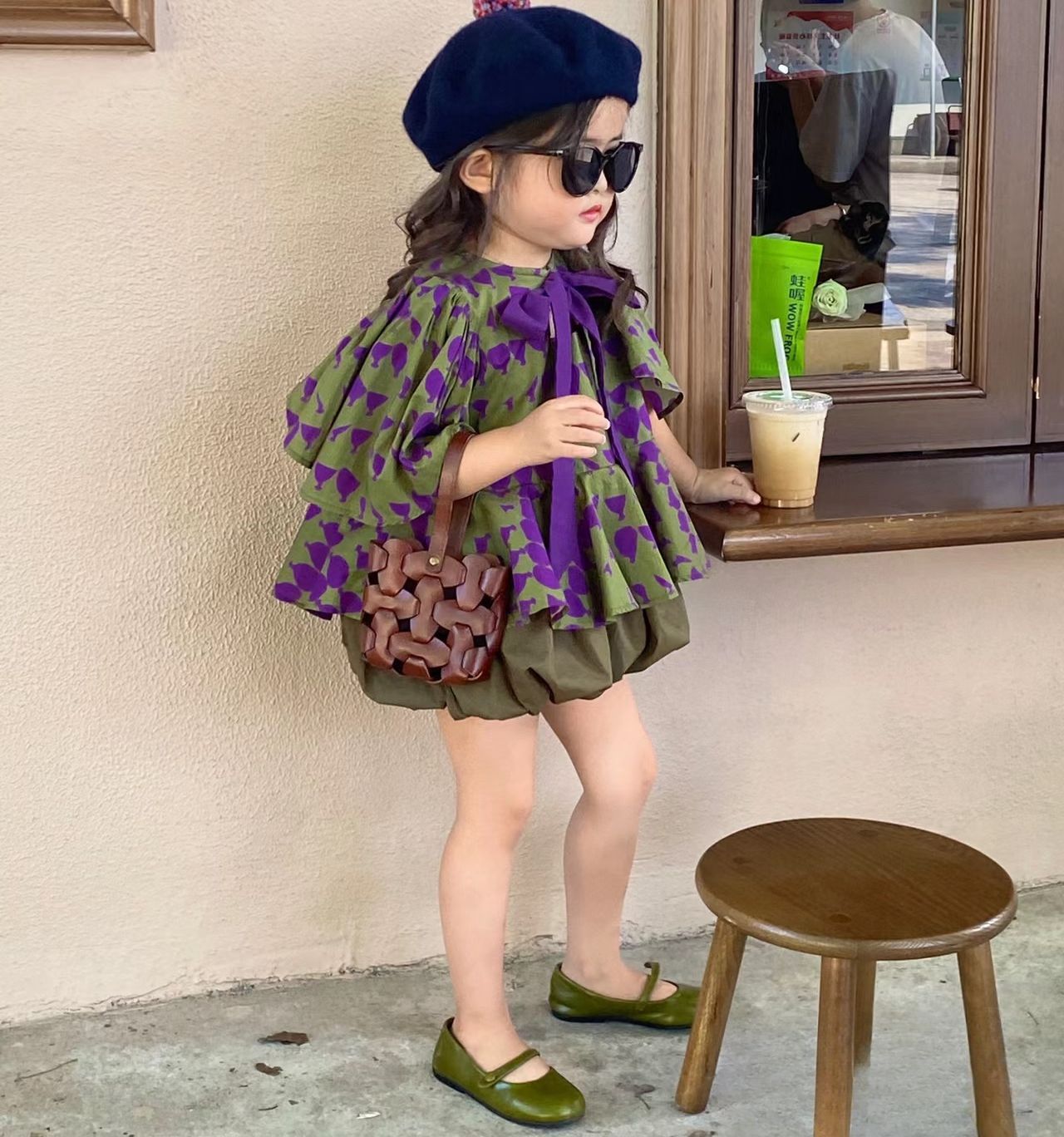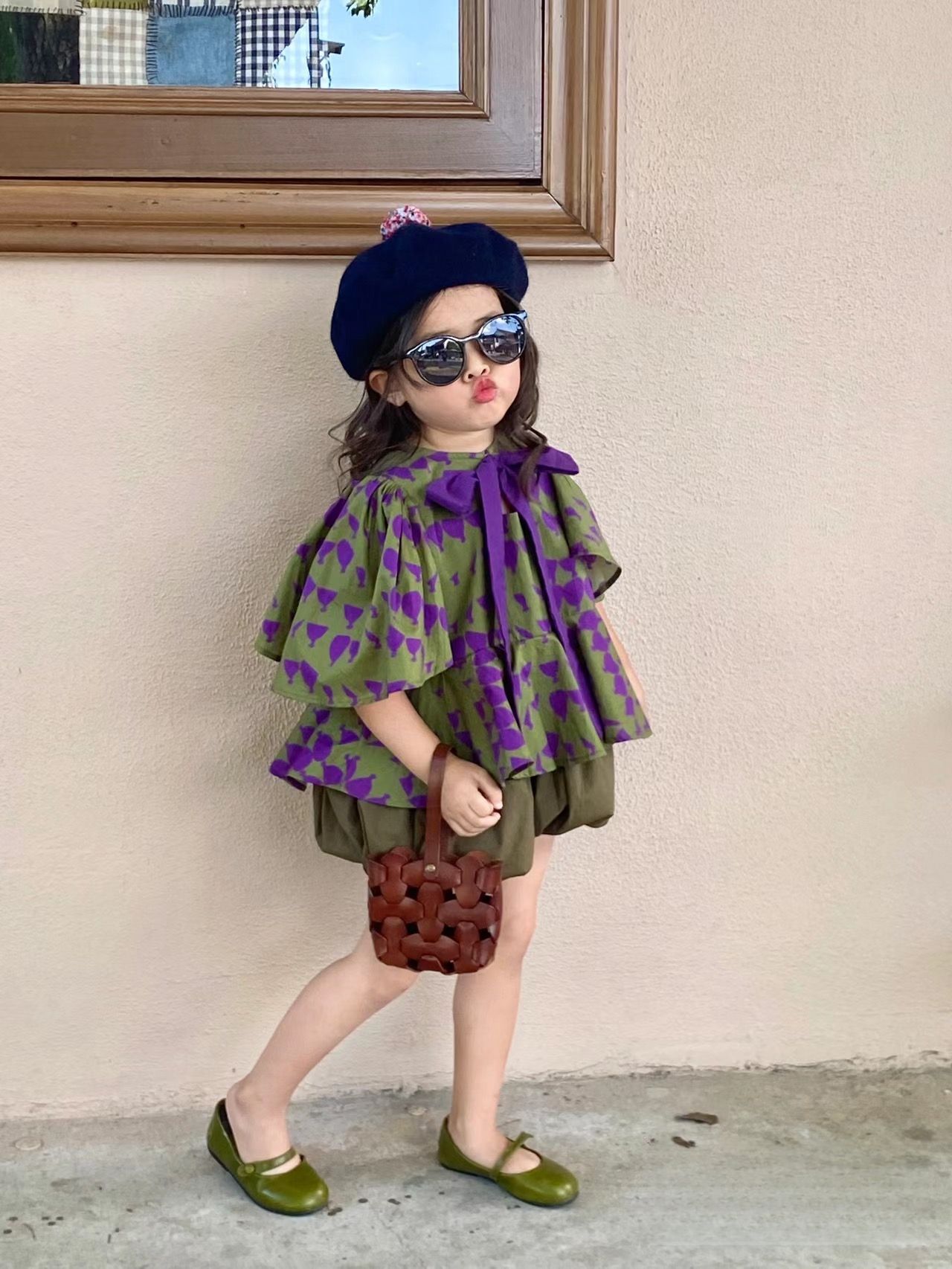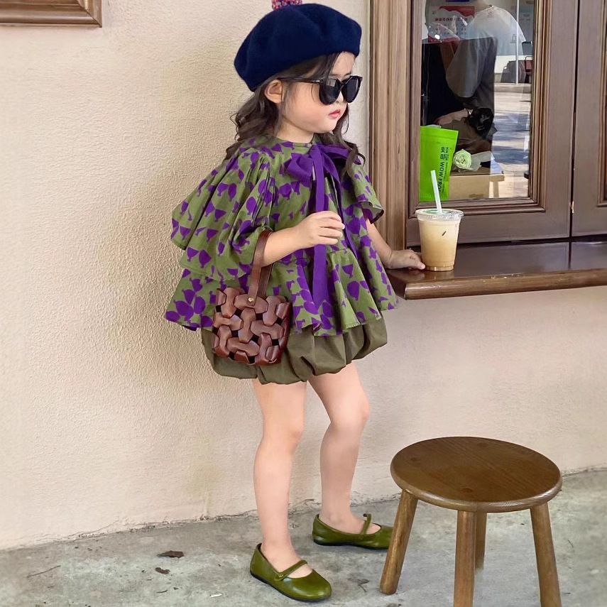 한국 소녀 여름 전체 인쇄 보라색 풍선 활 인형 셔츠 + 다크 그린 새싹 반바지 세트 별도스토어 가기