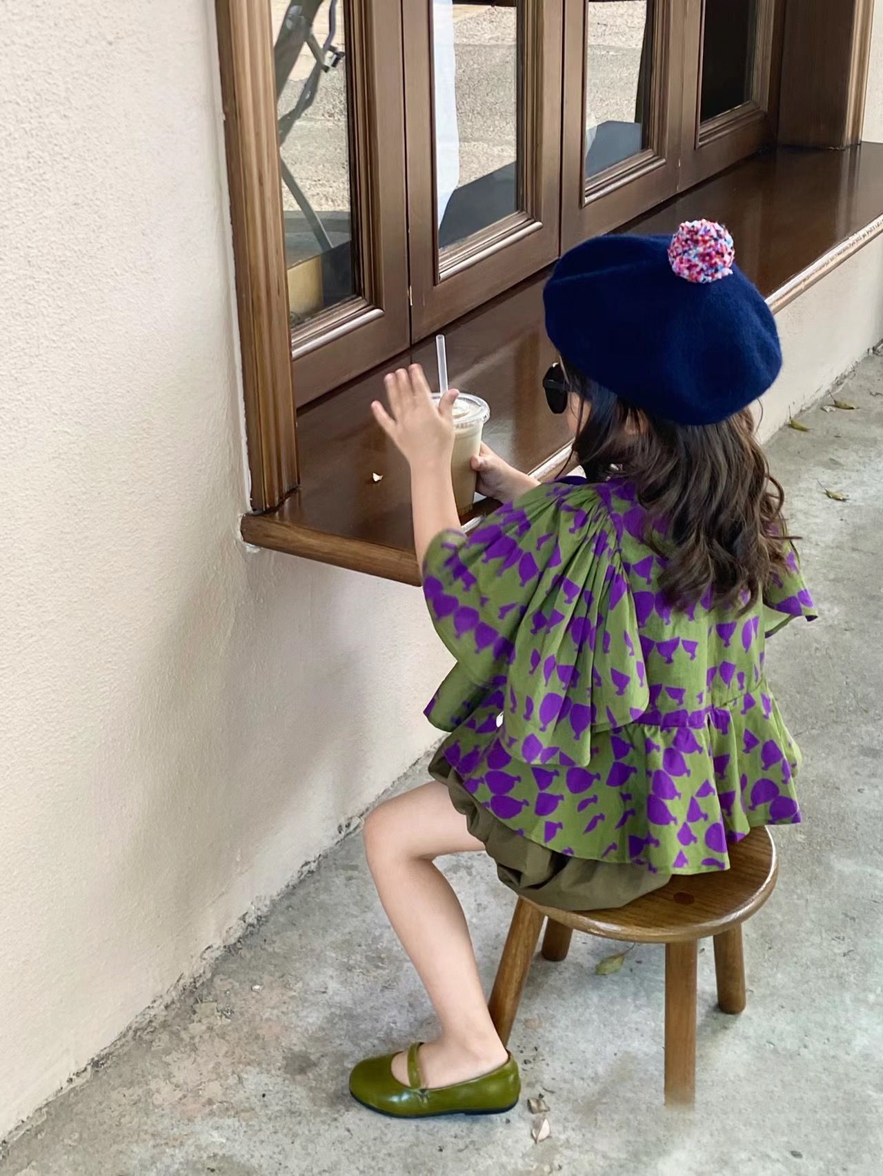 한국 소녀 여름 전체 인쇄 보라색 풍선 활 인형 셔츠 + 다크 그린 새싹 반바지 세트 별도