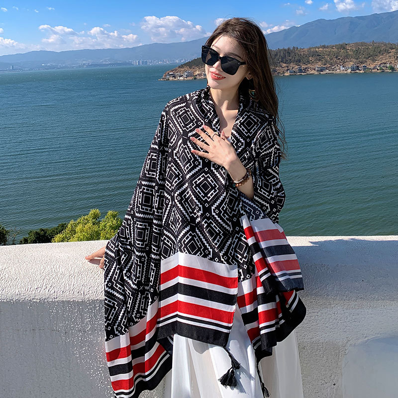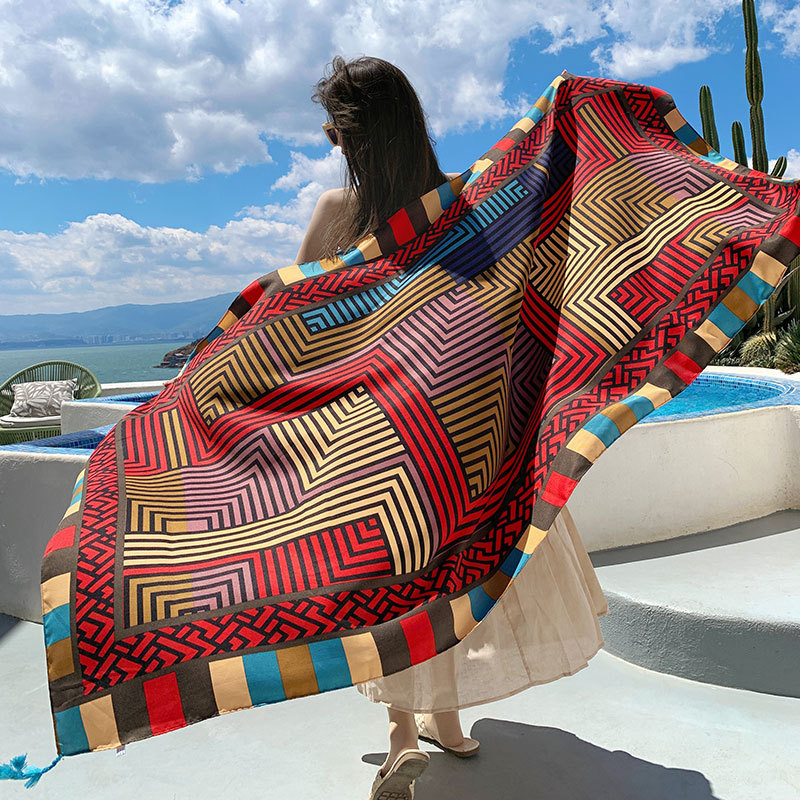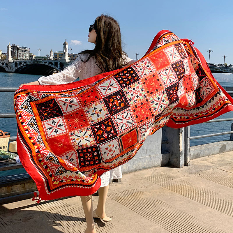 여름 새로운 실크 스카프 여성용 자외선 차단제 숄 해변 이중 사용 외부 비치 스카프 에스닉 스타일 여행 사진 얇은 스카프