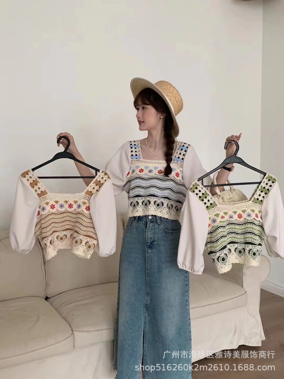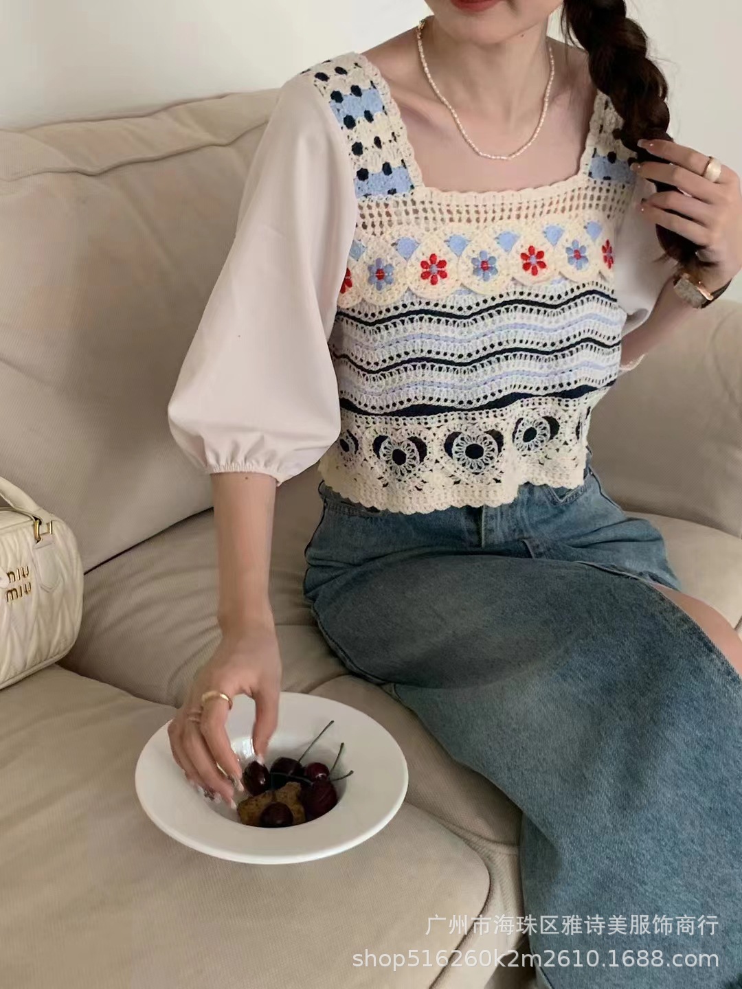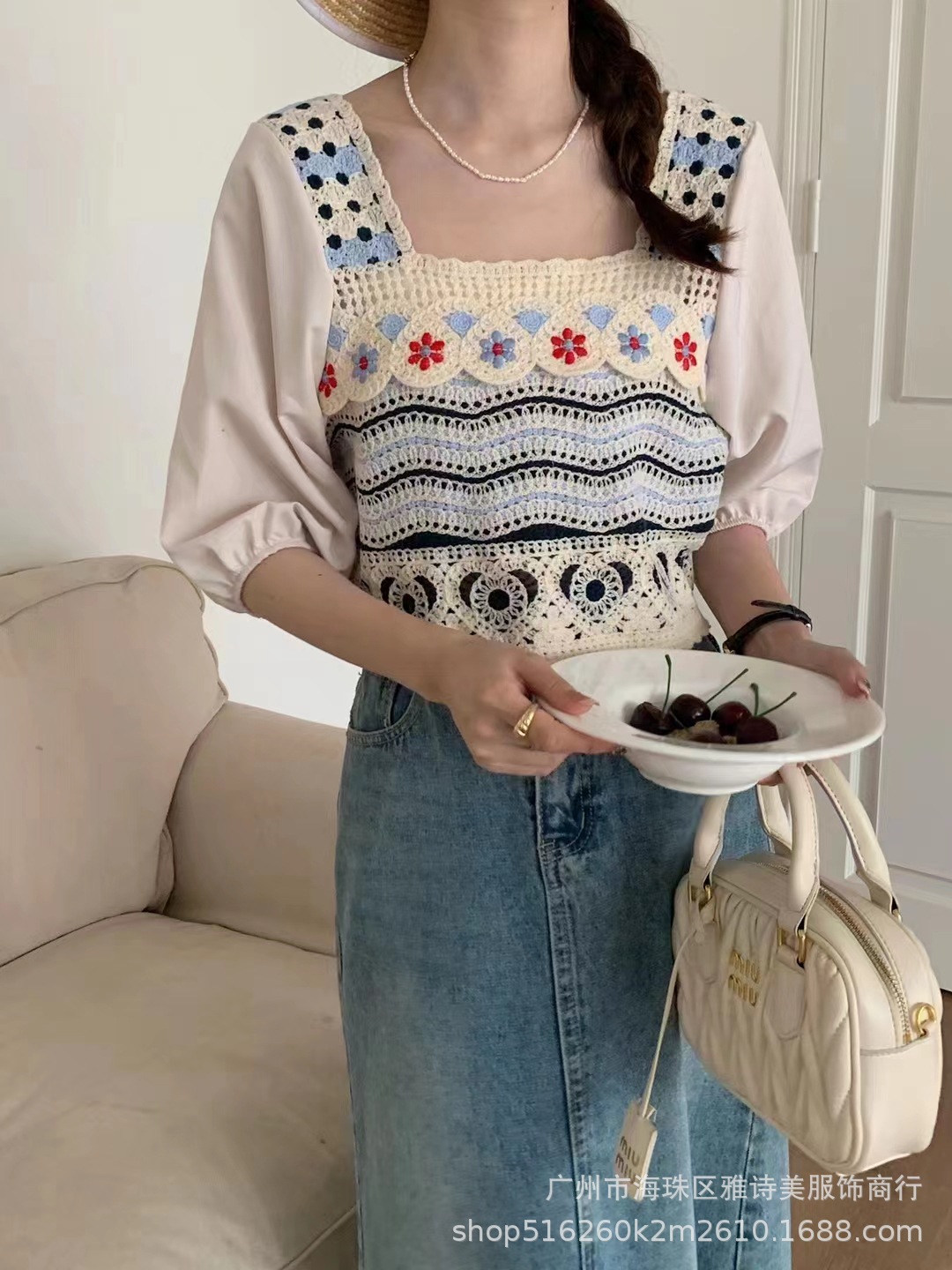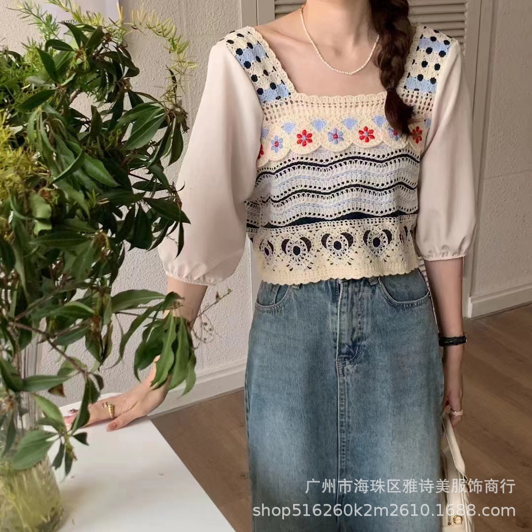 프렌치 스퀘어 칼라 중공 크로 셰 뜨개질 반팔 니트 쉬폰 셔츠 여성의 여름 새로운 신선한 달콤한 짧은 탑 유행