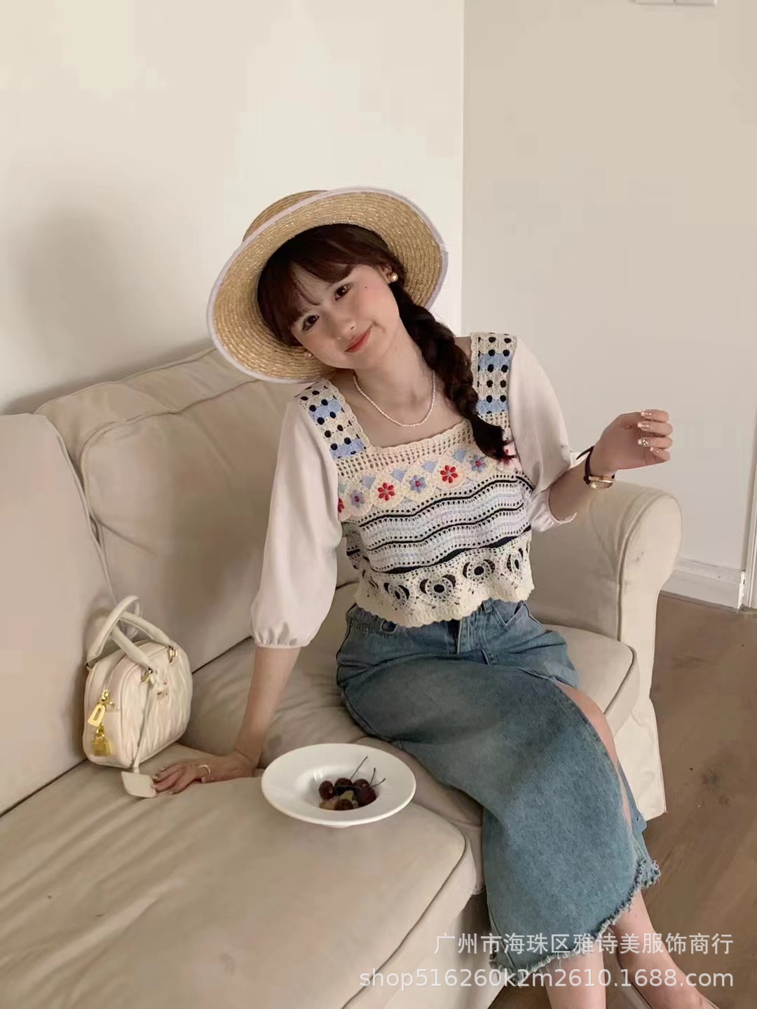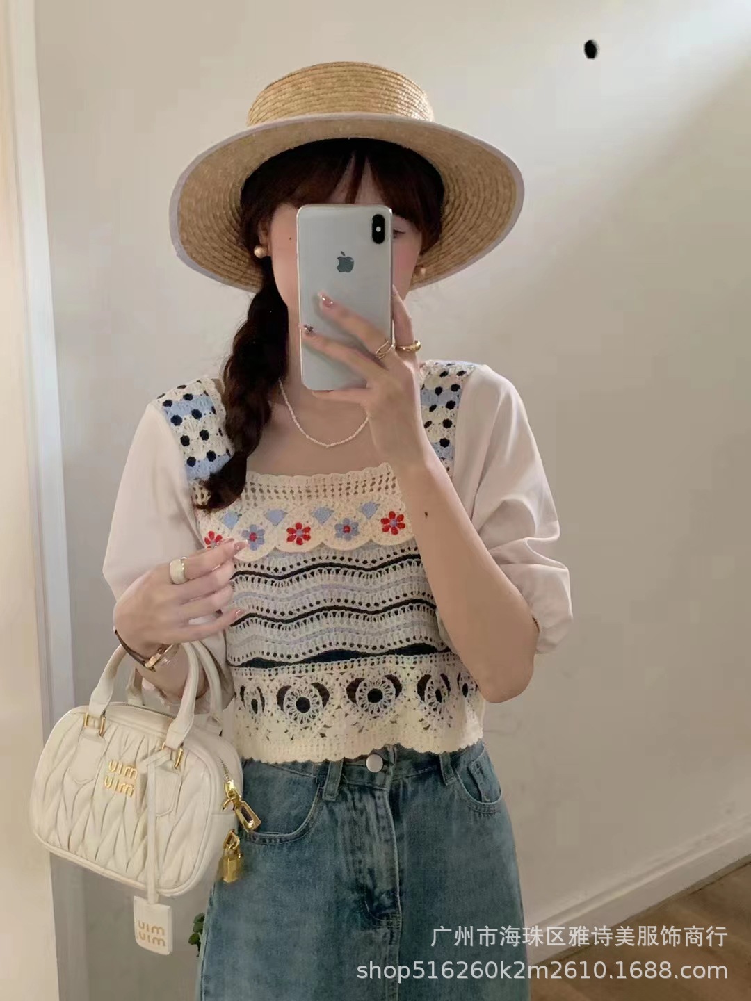프렌치 스퀘어 칼라 중공 크로 셰 뜨개질 반팔 니트 쉬폰 셔츠 여성의 여름 새로운 신선한 달콤한 짧은 탑 유행스토어 가기