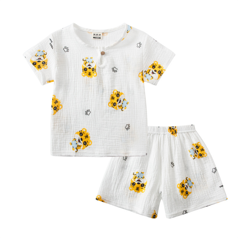 어린이 인쇄 코튼 리넨 반팔 세트 여름 아기의 경량 느슨한 더블 레이어 주름진 코튼 거즈 반바지 투피스 세트
