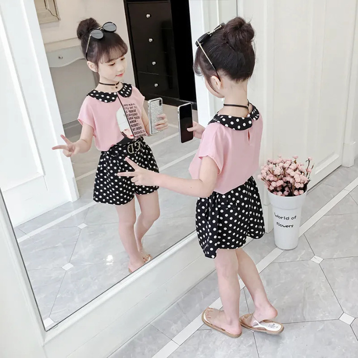 여자 정장 여름 옷 2024 새로운 한국 스타일 아동복 어린 소녀 쉬폰 유행 투피스 반바지 유행