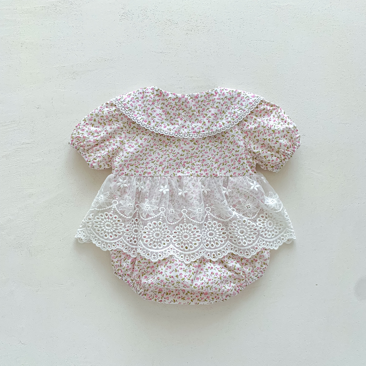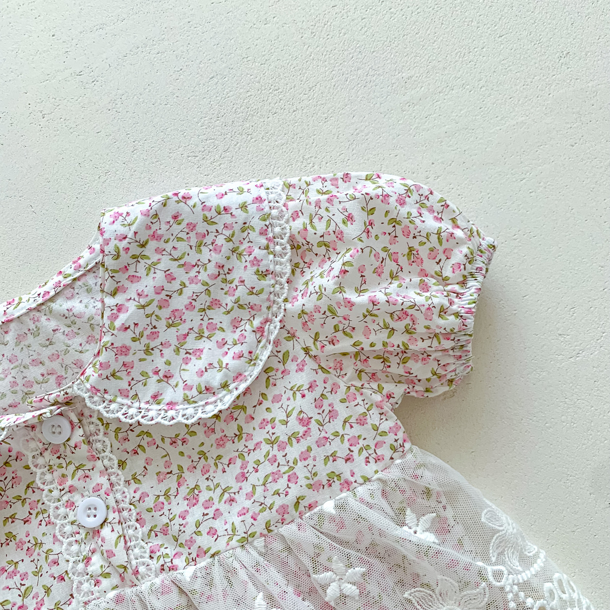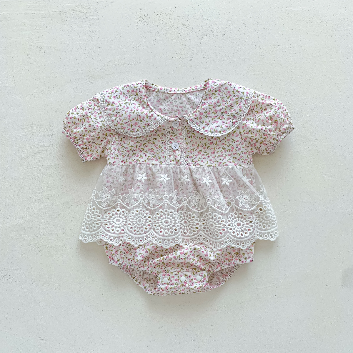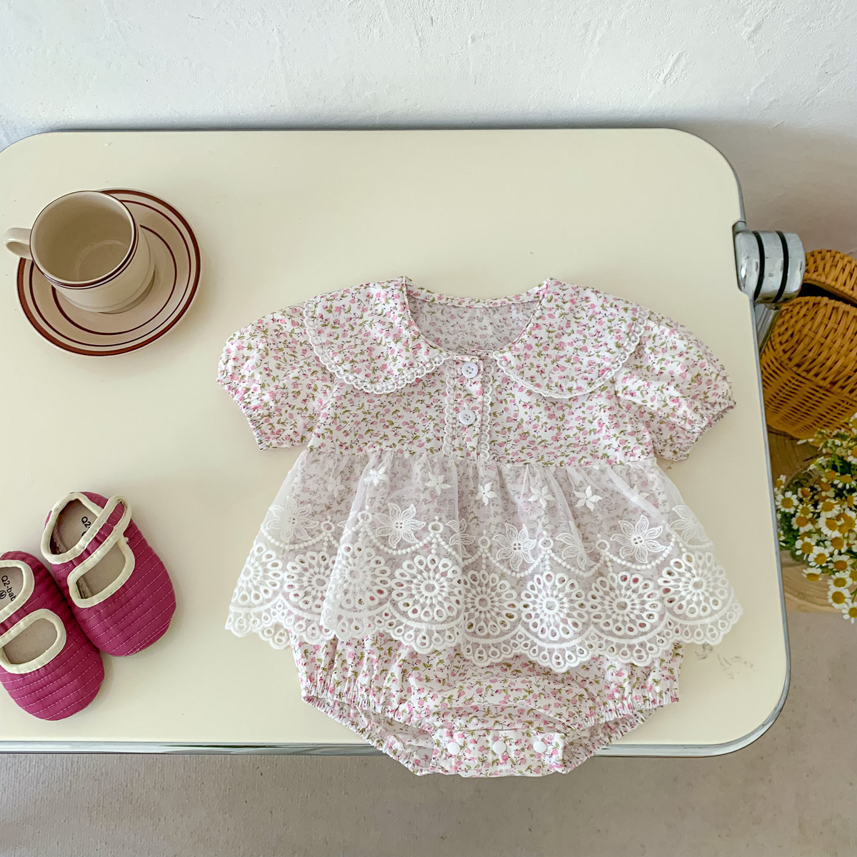 In 여름 아기 소녀 꽃 토끼 반팔 인형 칼라 가짜 투피스 백 뚱뚱한 옷 아기 레이스 집 밖 등산 의류