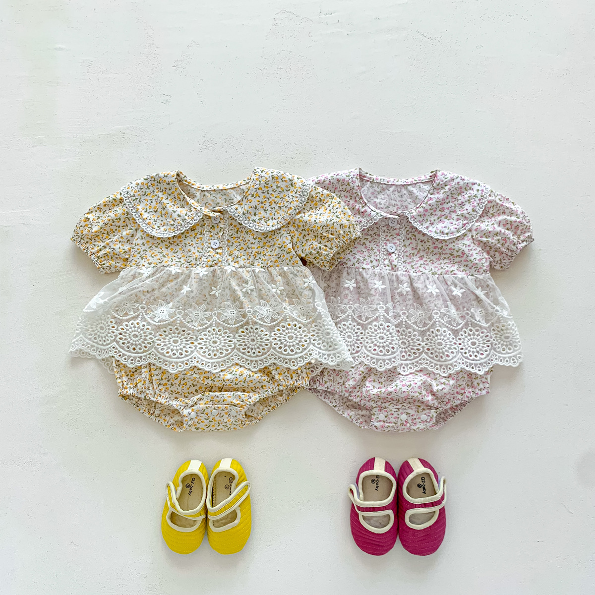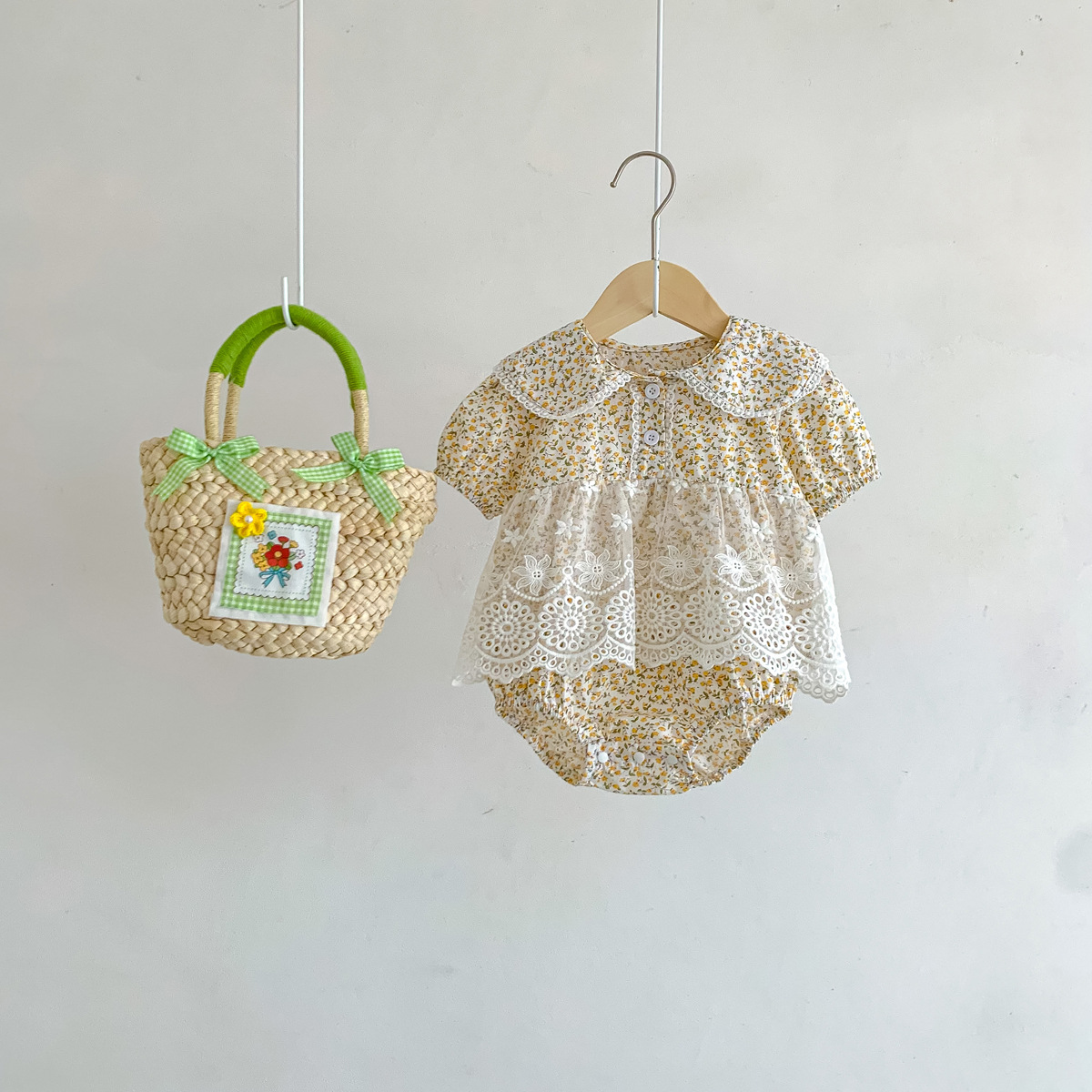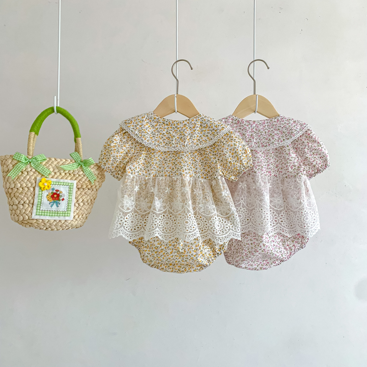In 여름 아기 소녀 꽃 토끼 반팔 인형 칼라 가짜 투피스 백 뚱뚱한 옷 아기 레이스 집 밖 등산 의류스토어 가기