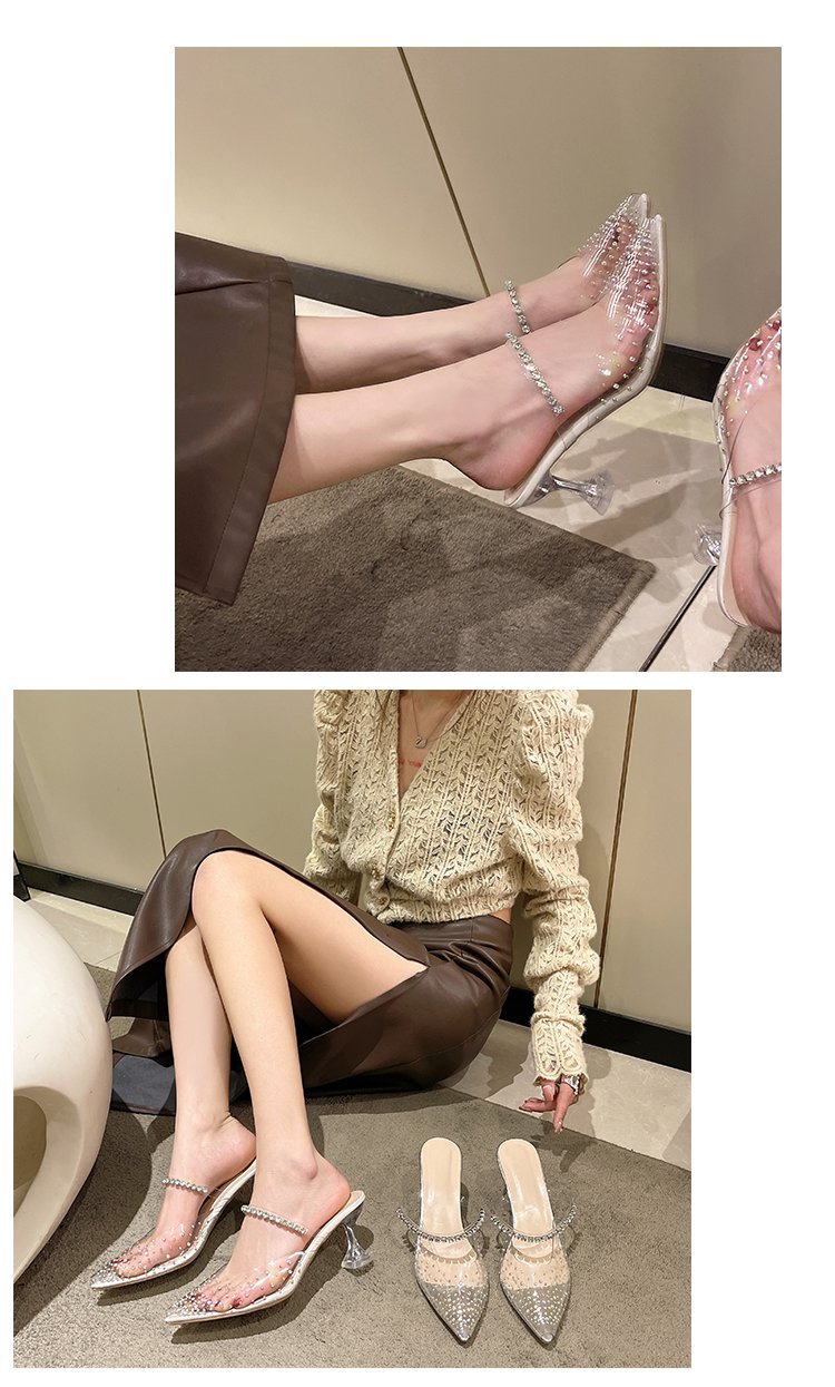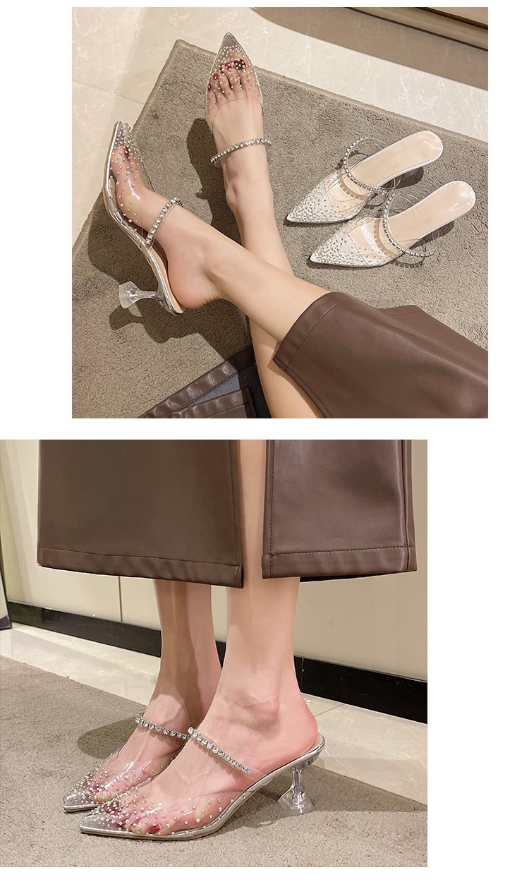 2023 여름 패션 의상 뾰족한 라인 석 사각 버클 하이힐 얇은 뒤꿈치가있는 페어리 스타일 투명 슬라이드 슬라이드스토어 가기