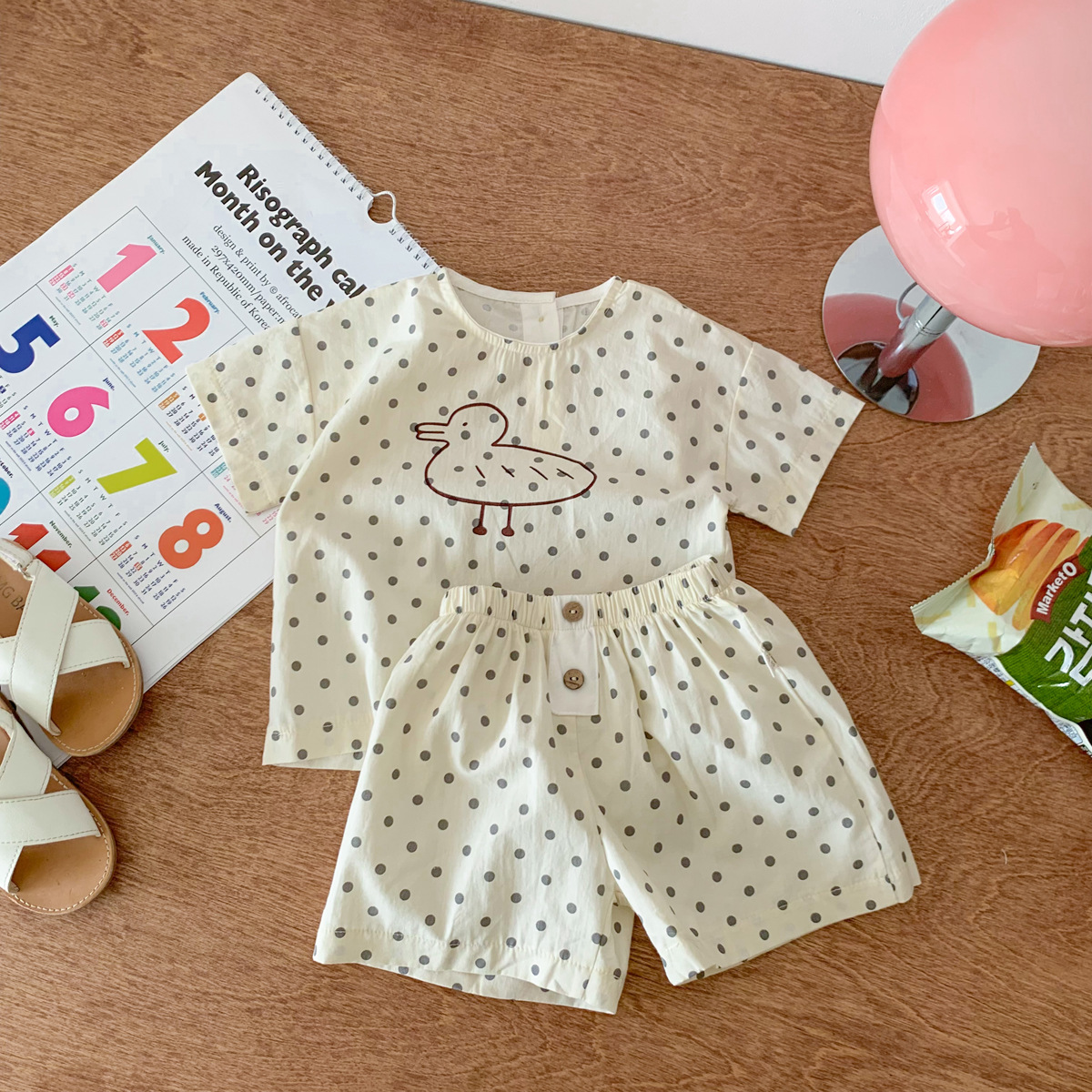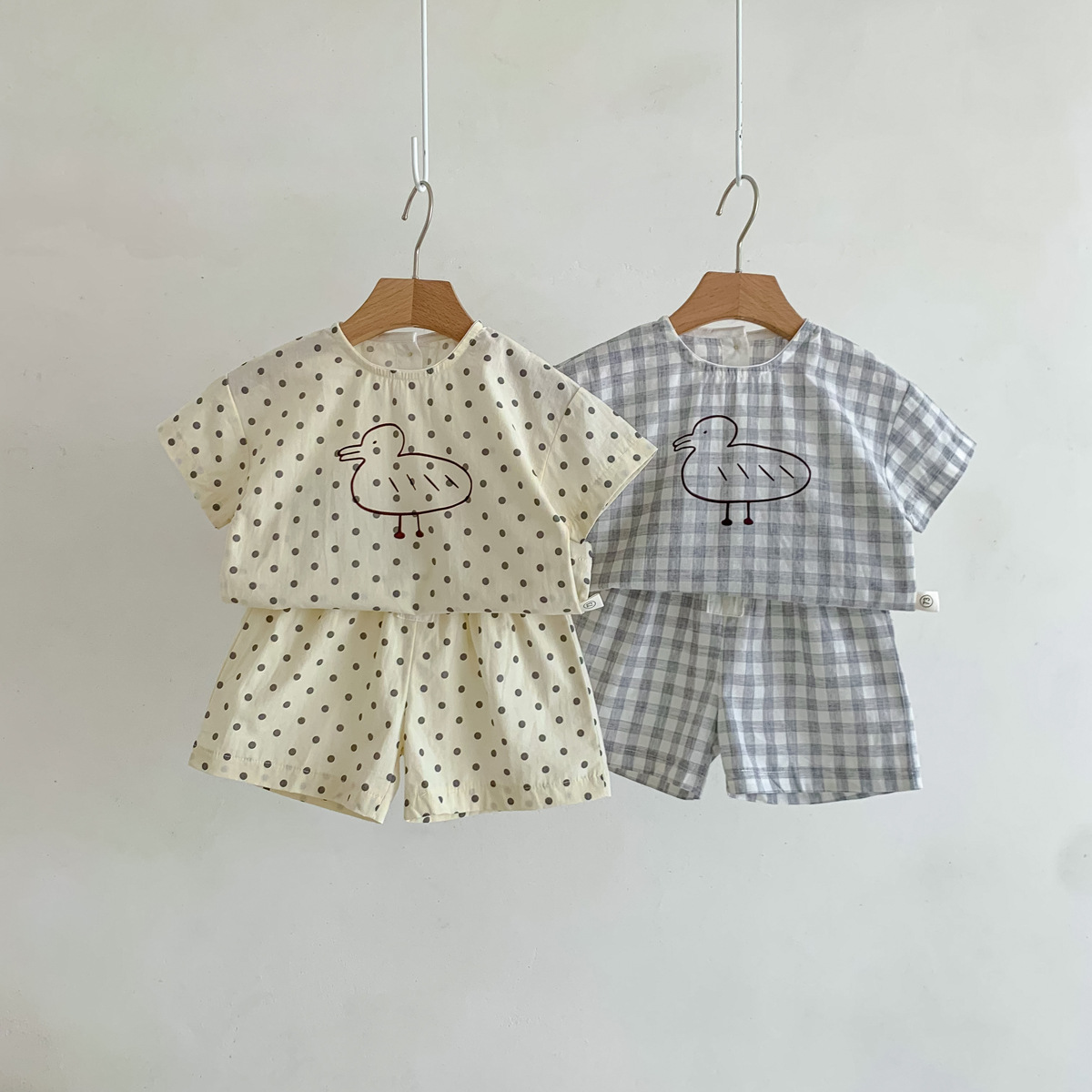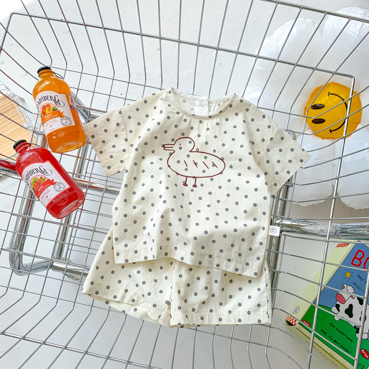 아동복 한국식 여름 어린이 오리 프린트 세트 in 유아 면 얇은 반팔 반바지 투피스 세트