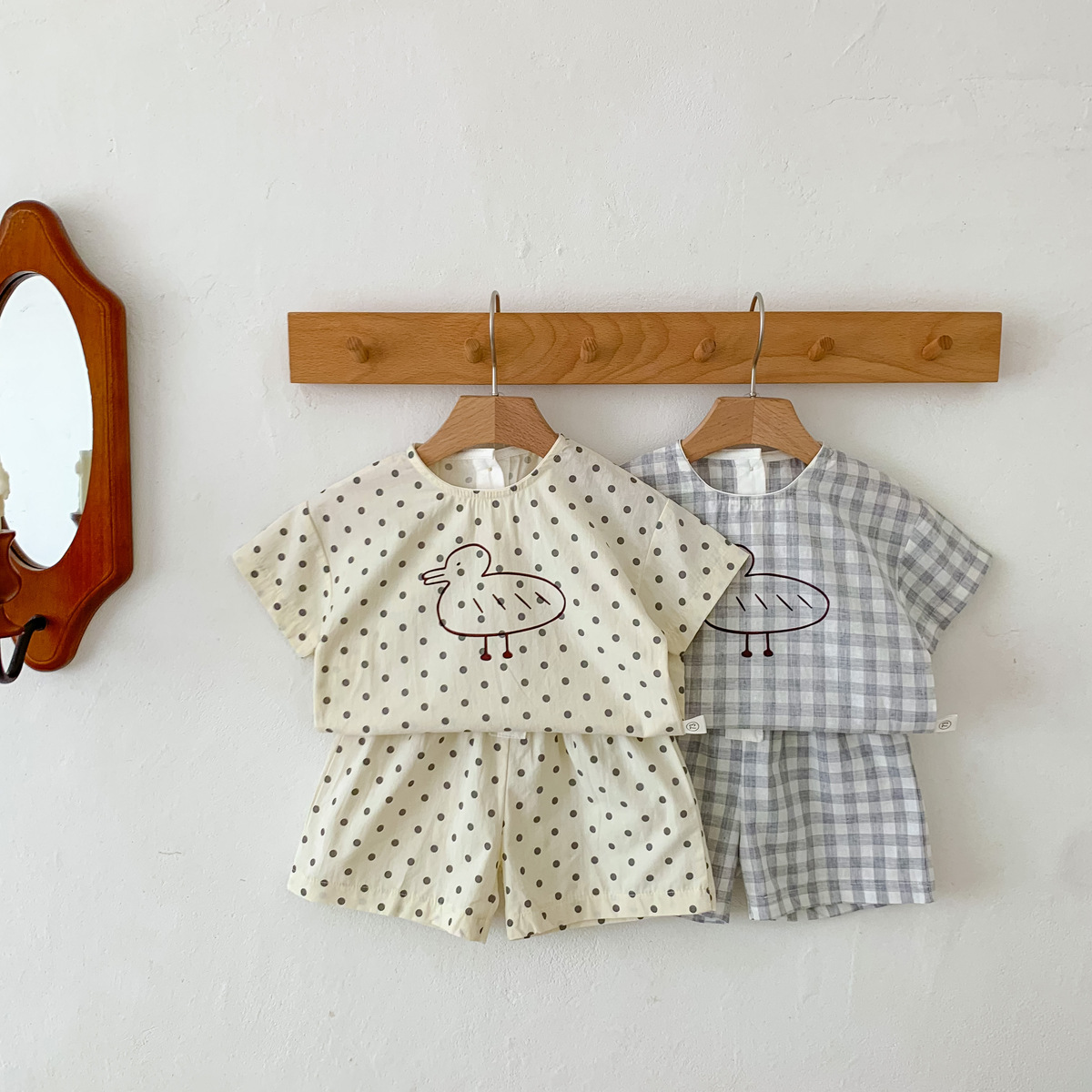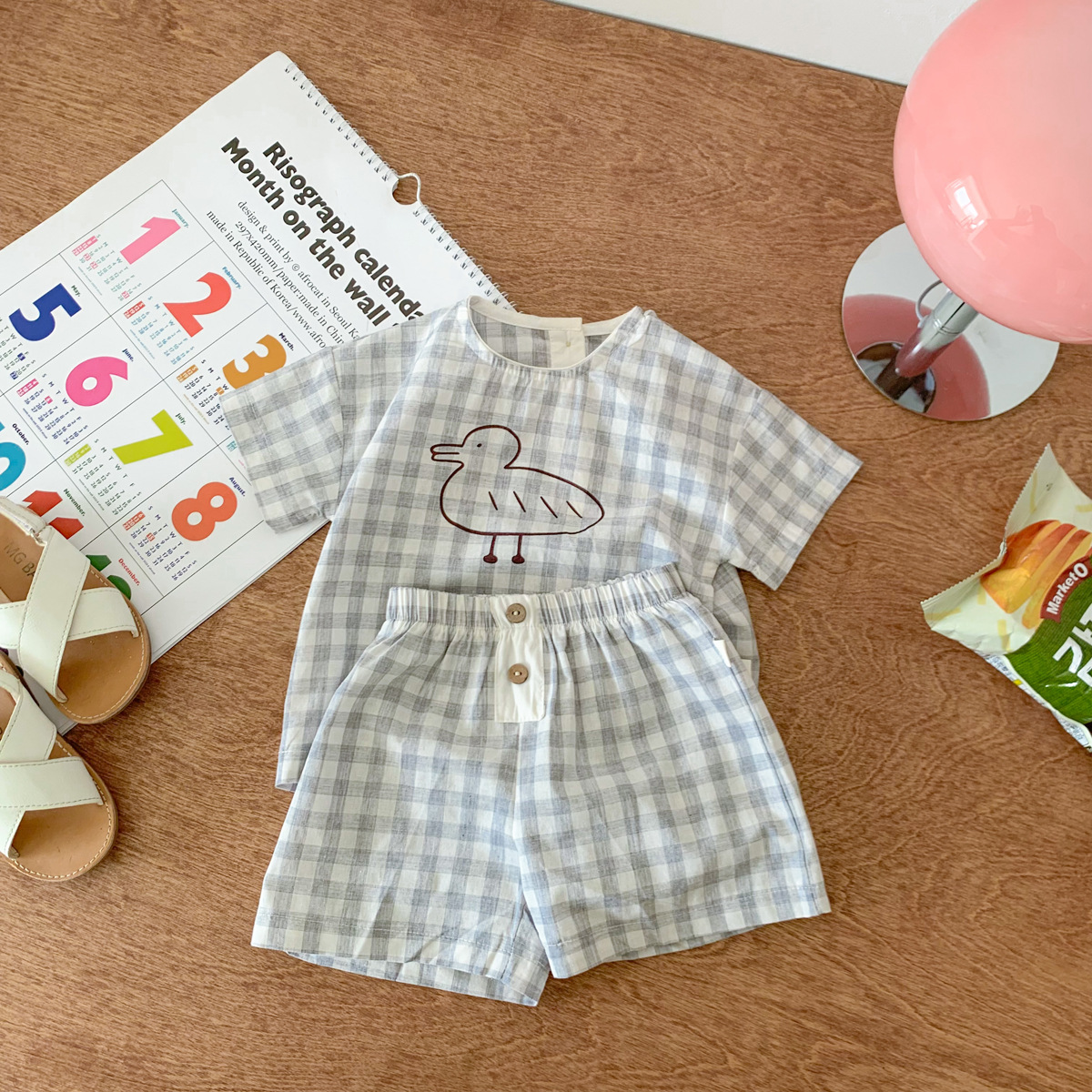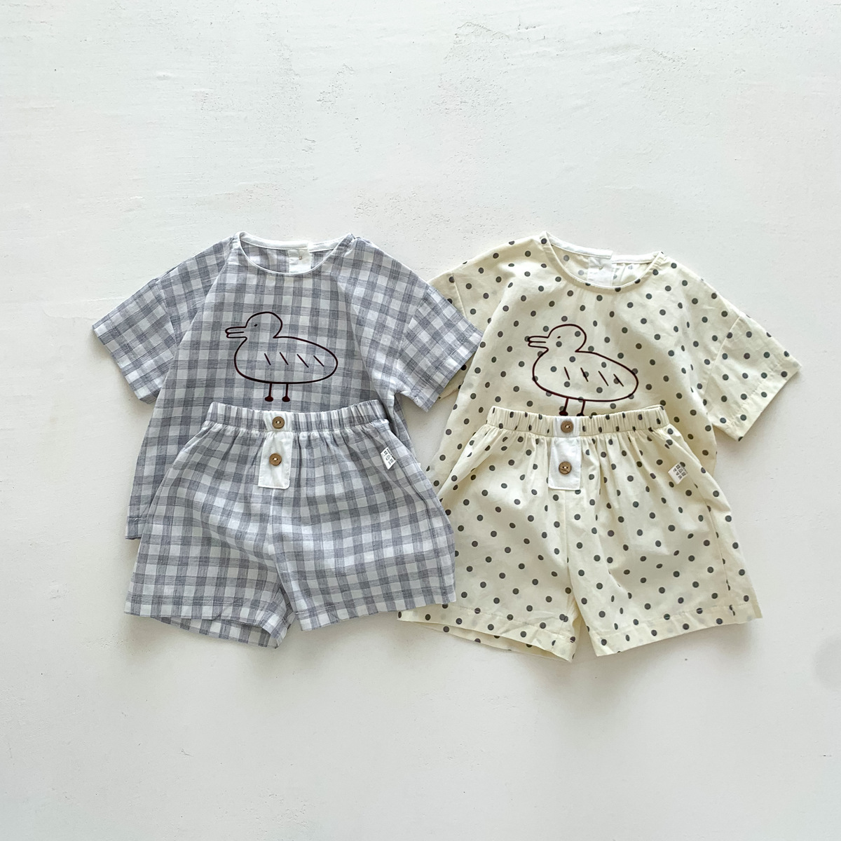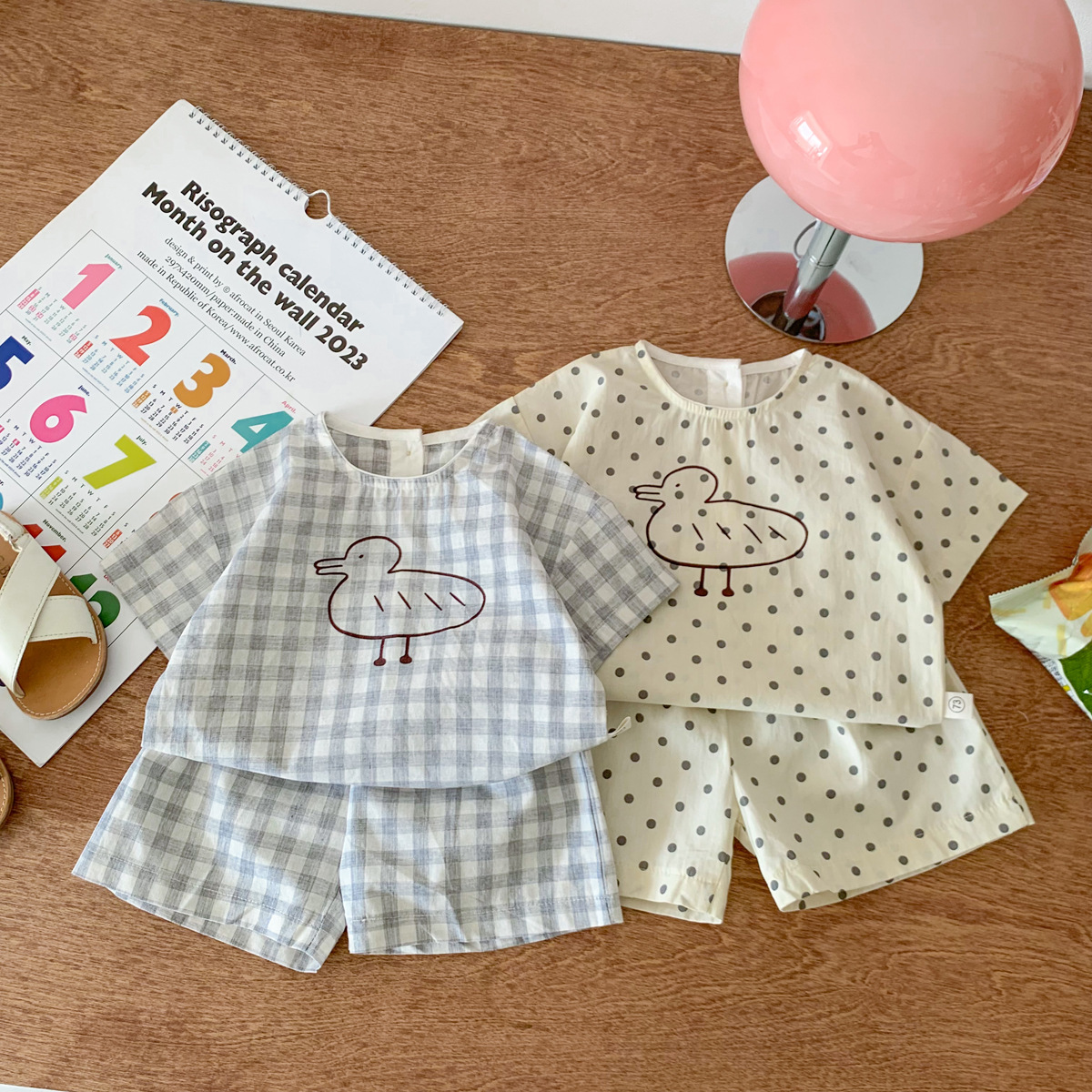 아동복 한국식 여름 어린이 오리 프린트 세트 in 유아 면 얇은 반팔 반바지 투피스 세트
