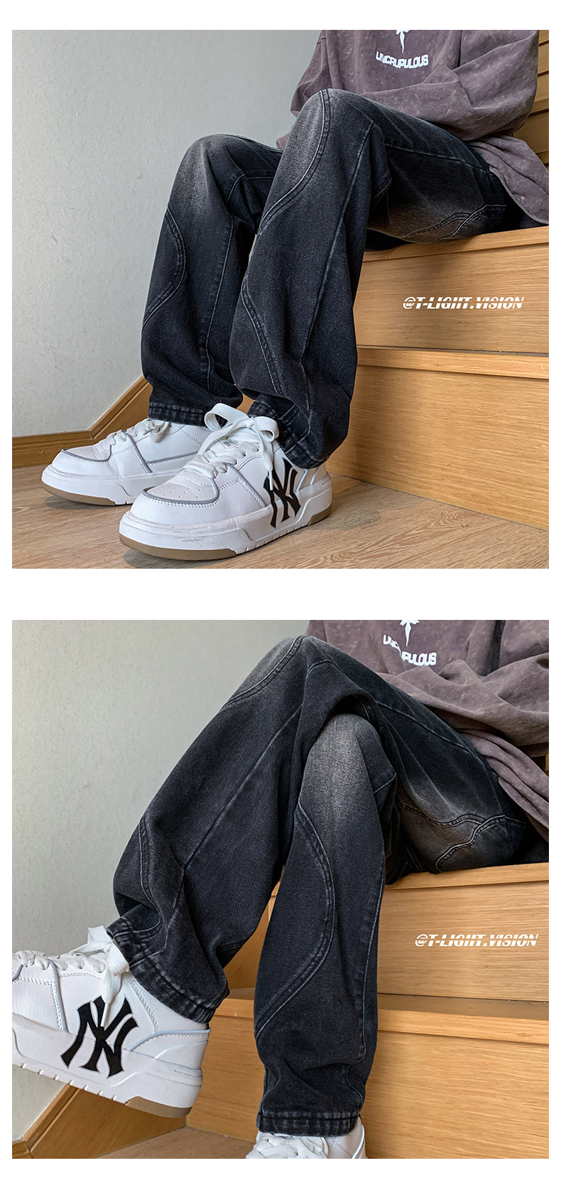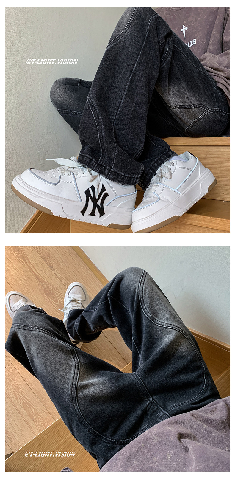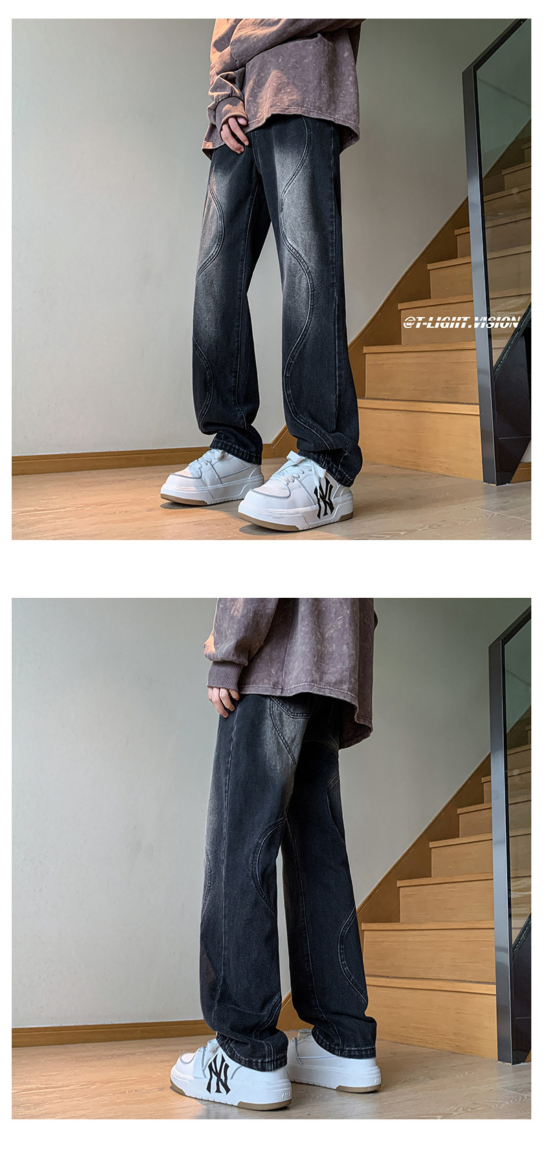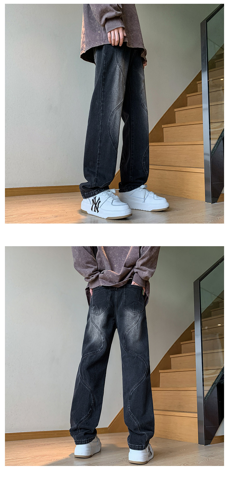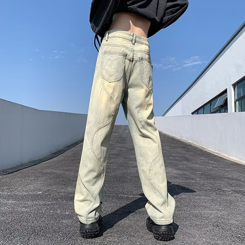 国潮美式vibe裤子高街水洗做旧黑灰色牛仔裤男宽松直筒垂感阔腿裤