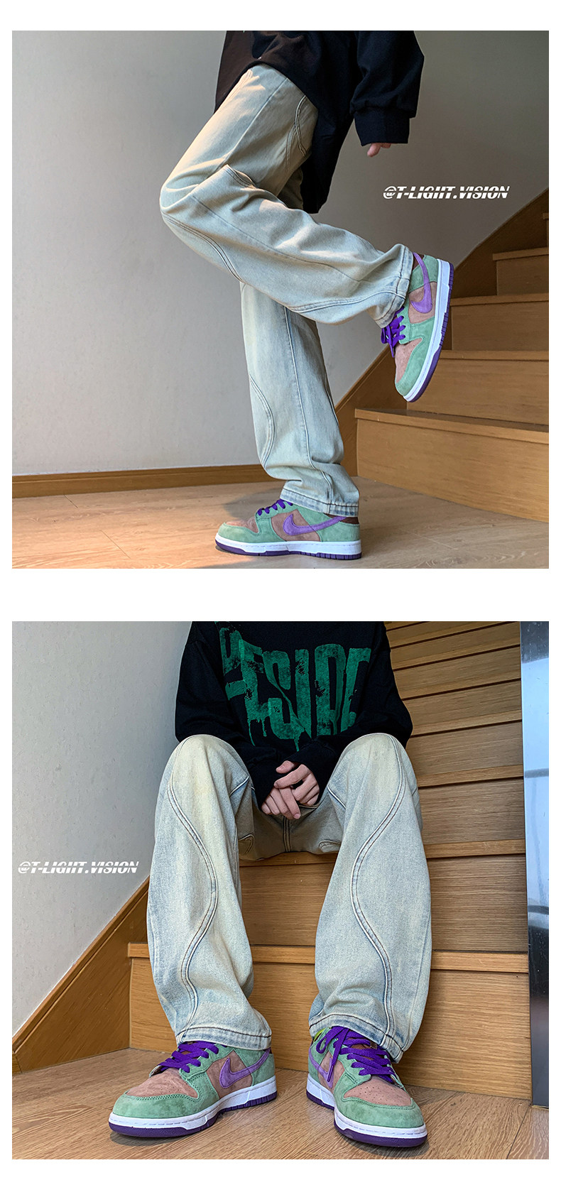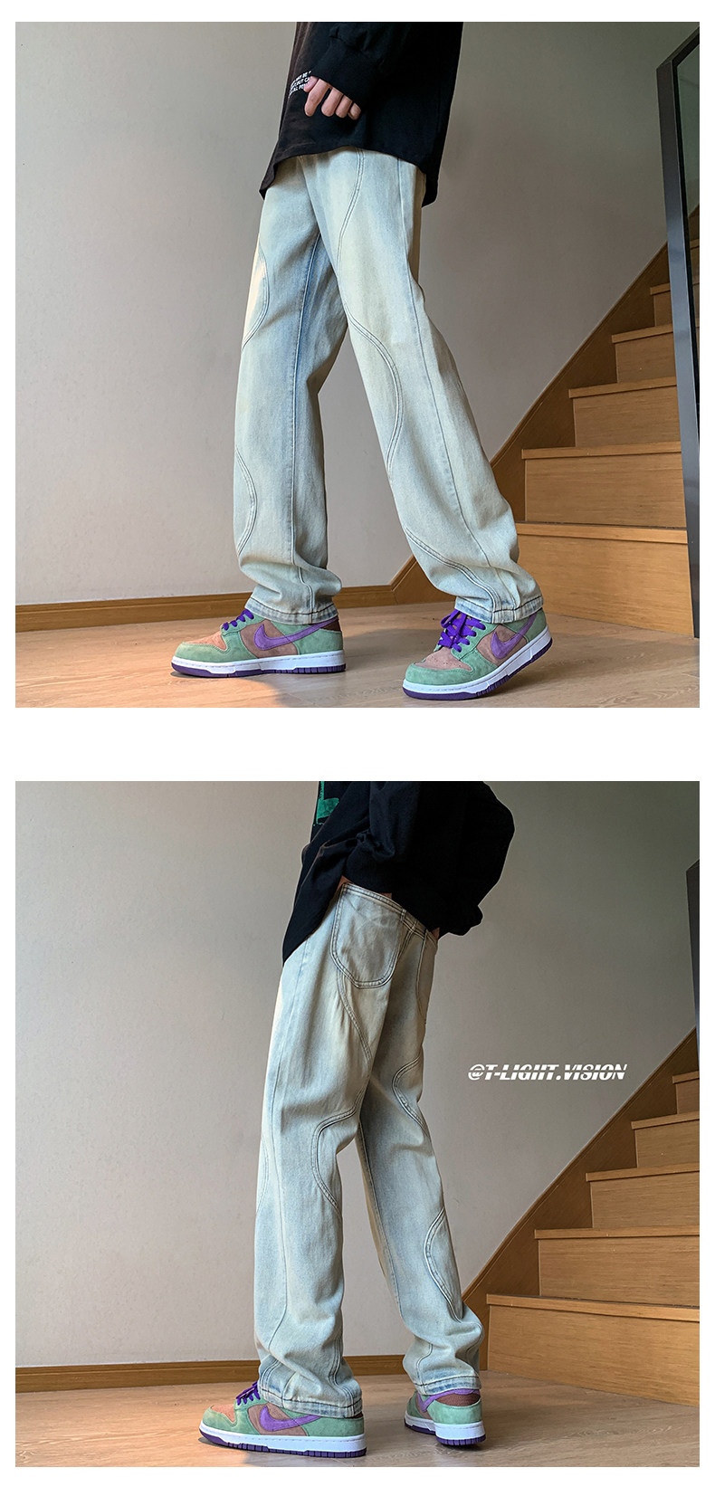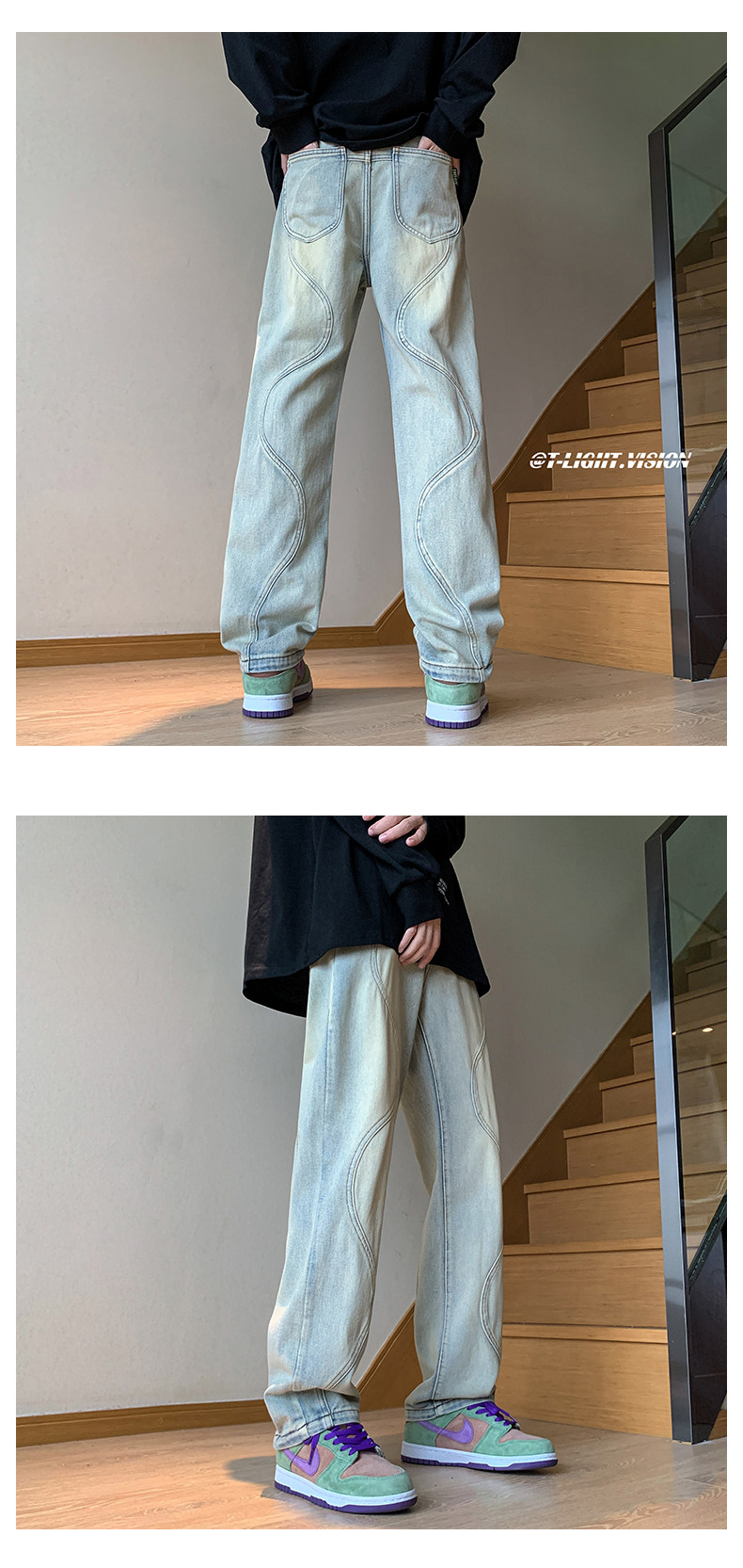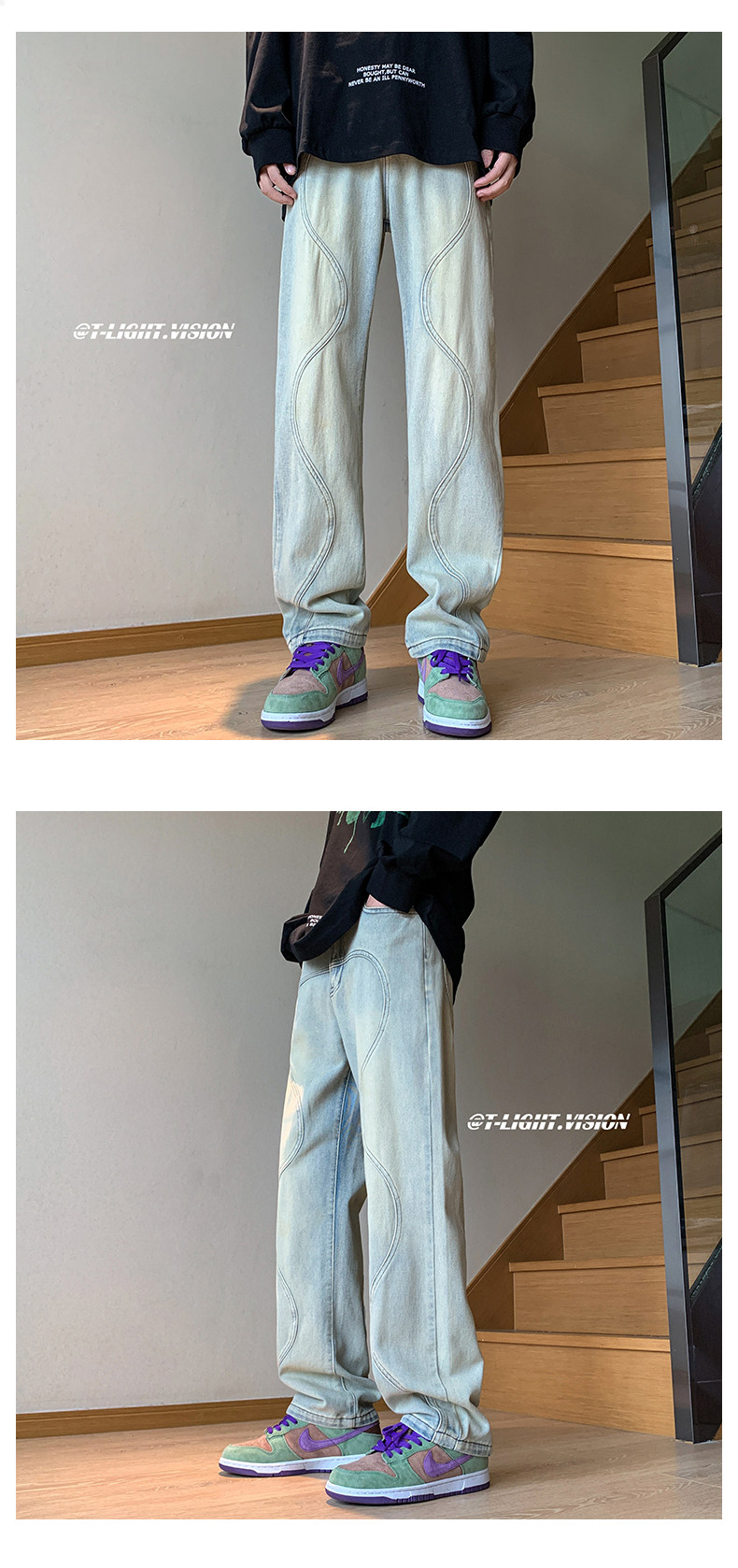 国潮美式vibe裤子高街水洗做旧黑灰色牛仔裤男宽松直筒垂感阔腿裤