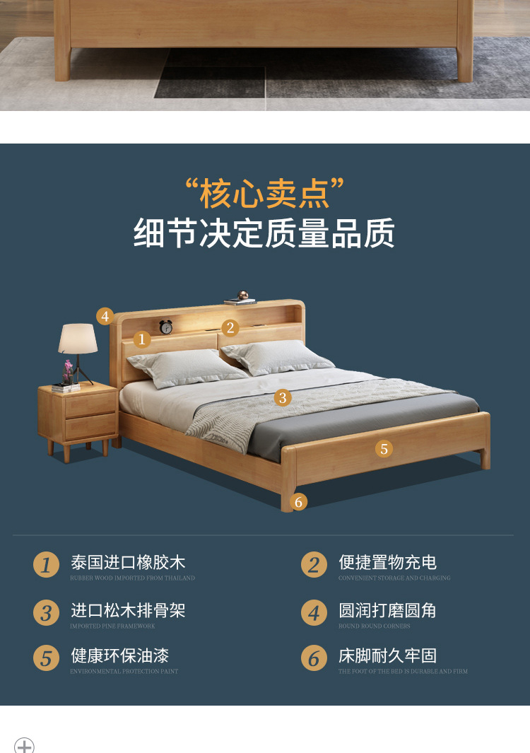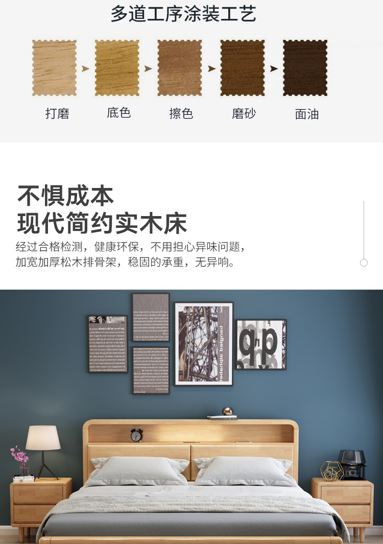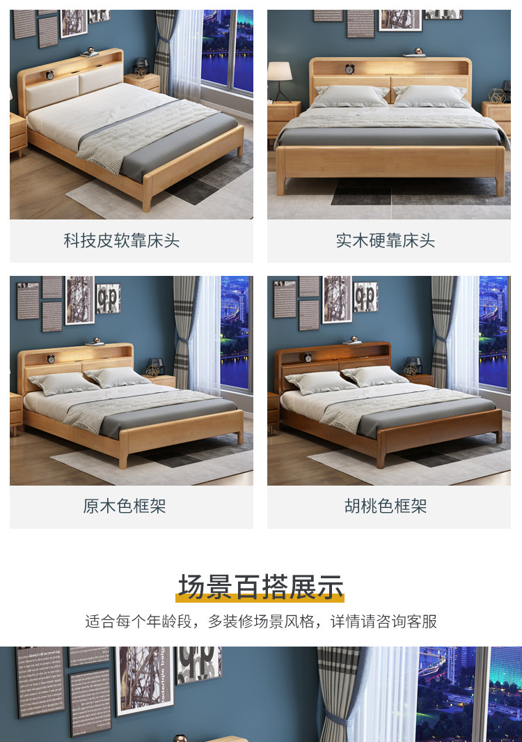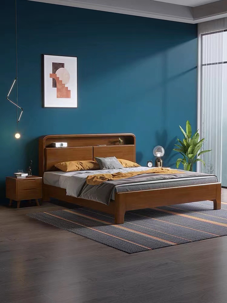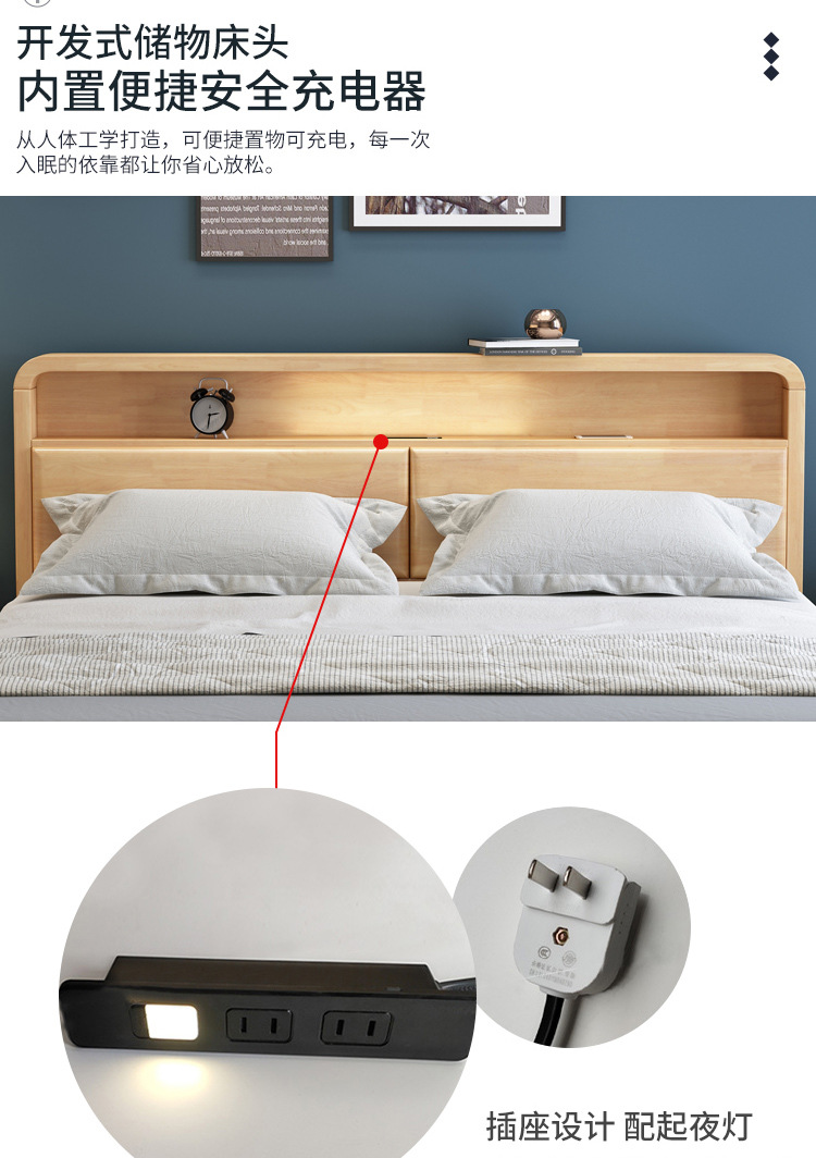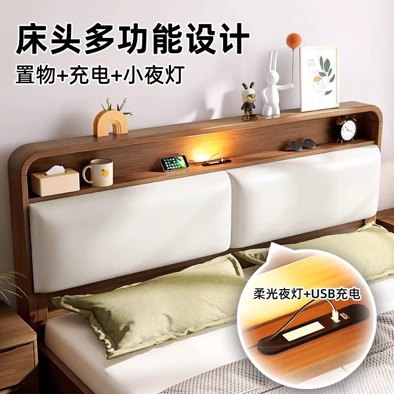 북유럽 현대 간단한 단단한 나무 침대 1.2 m 1.5 m 1.8 m 충전식 야간 조명 침대가있는 부드러운 더블 침대
