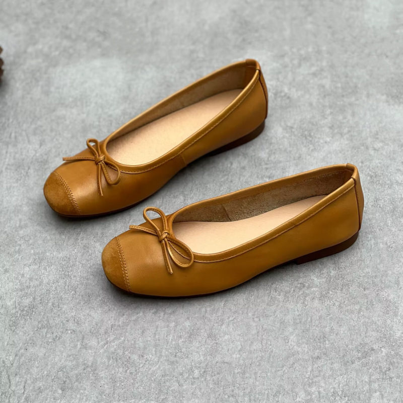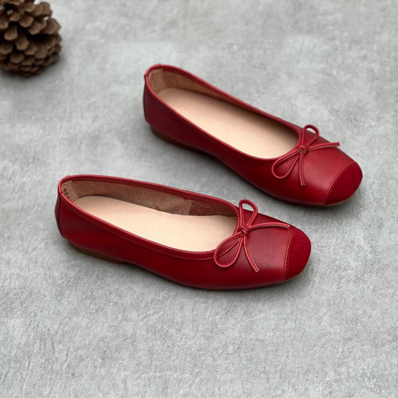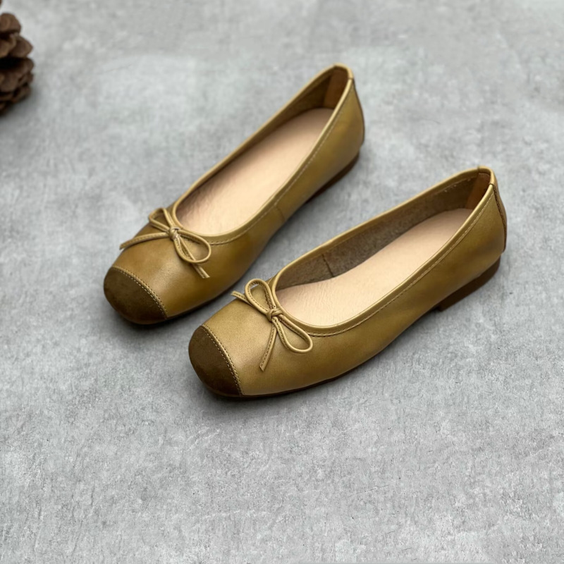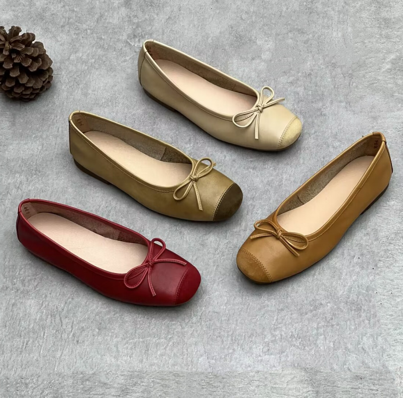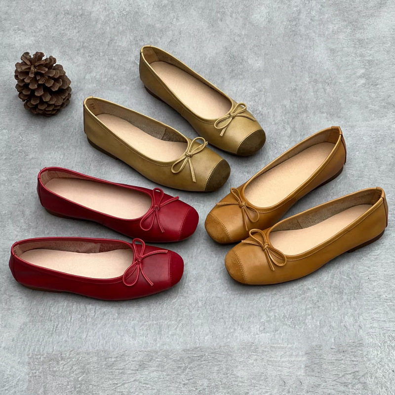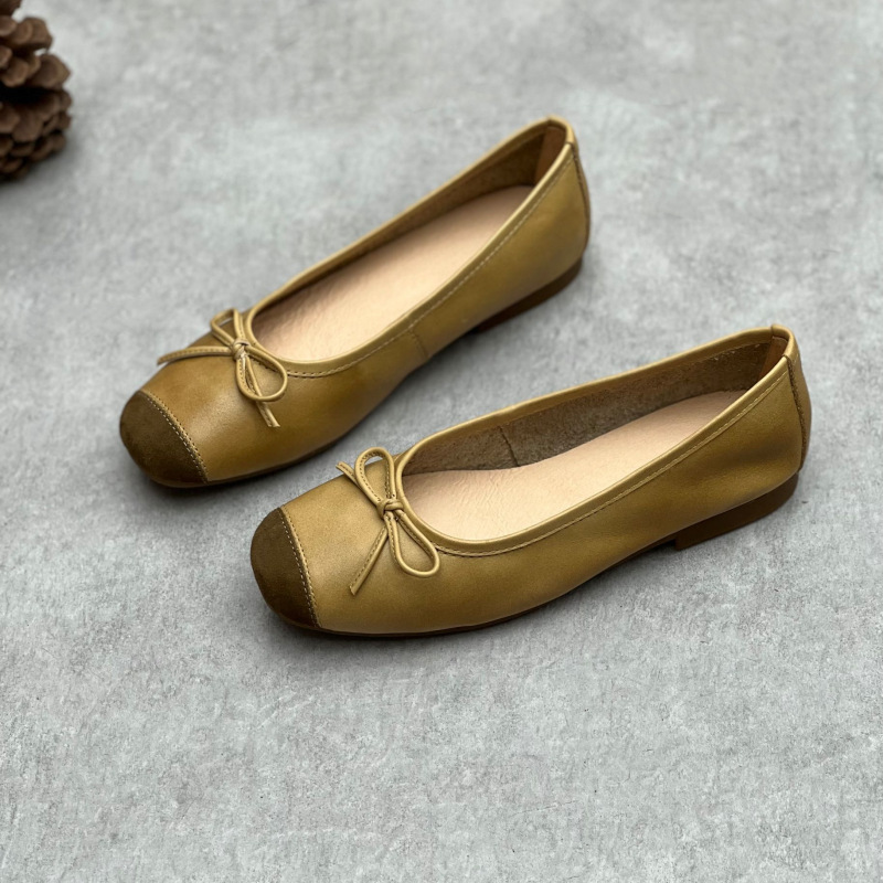 예술적인 수제 천연 가죽 스퀘어토 슈즈 2024 봄 여름 사계절 플랫 굽 얕은 구두 리본 장식 부드러운 소가죽 여성 할머니 신발스토어 가기