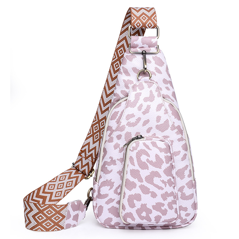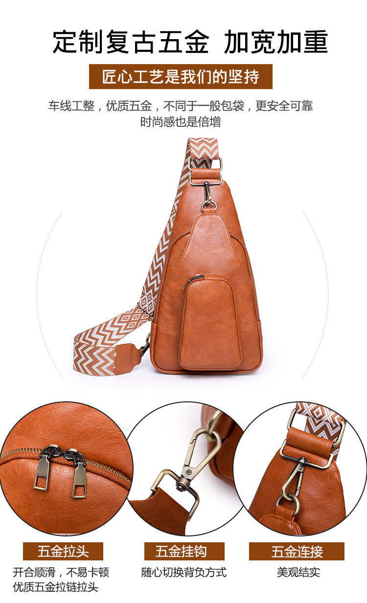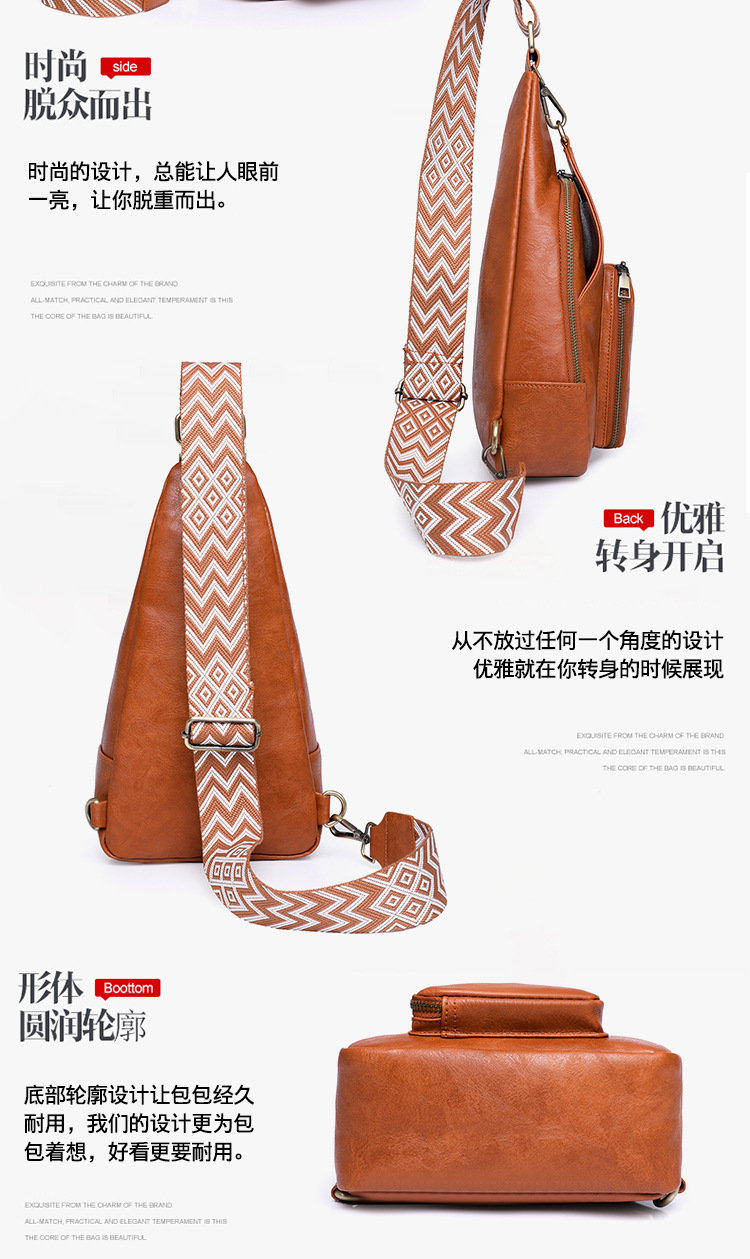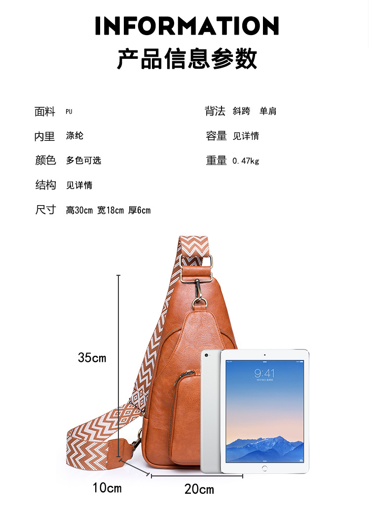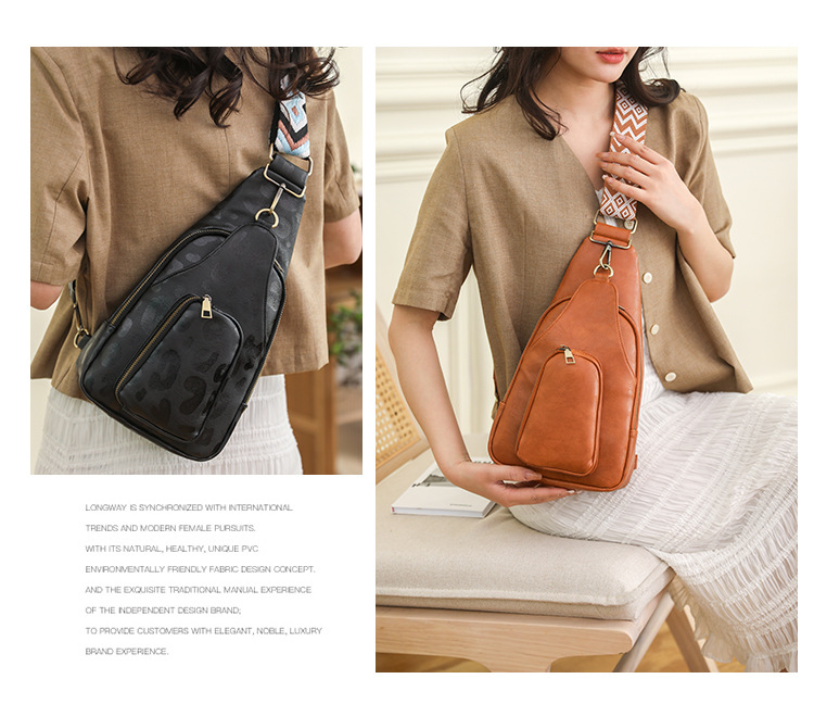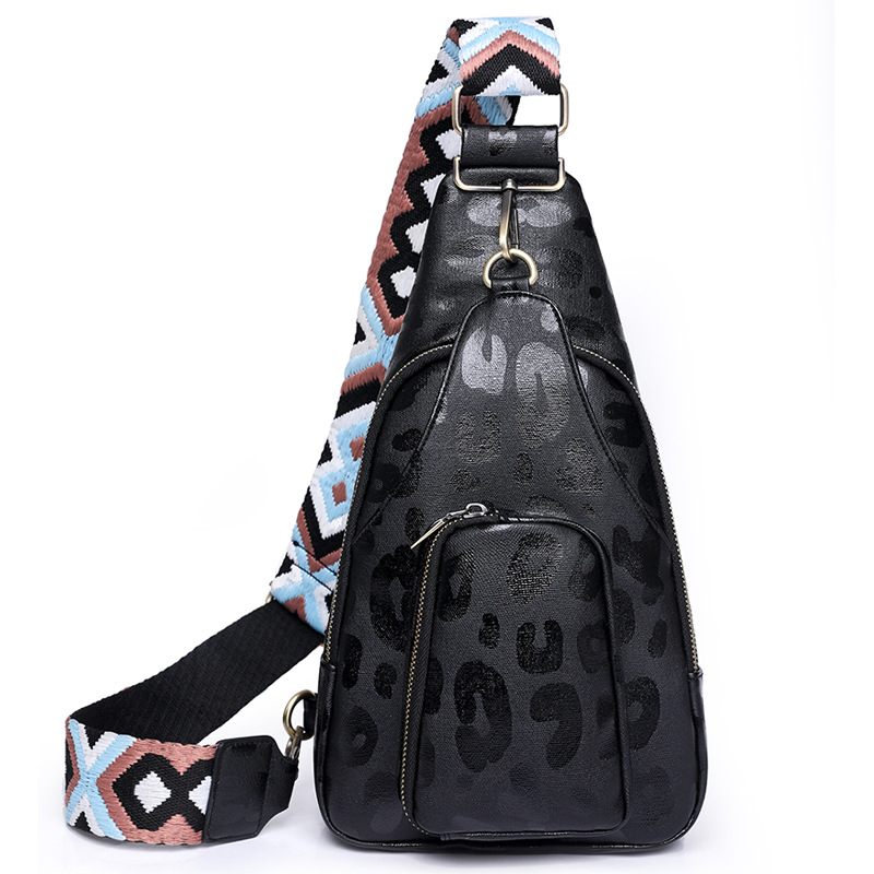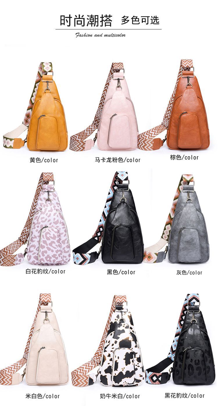 【产品特色】产品为多层加长单肩包胸包;前面侧拉小袋设计方便日常存取零碎物品;产品采用定制加厚PU皮面料,多种特色花纹可选,特别供应黑花豹纹,白花豹纹等新品种面料;产品全部使用轻奢复古风加粗五金配件,搭配5cm宽多种花色编织背带,美观典雅同时实用性强;产品背部左右两侧均设计有五金扣环,日常使用时左右两侧均可实现背负。