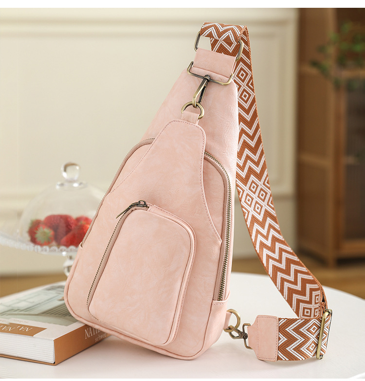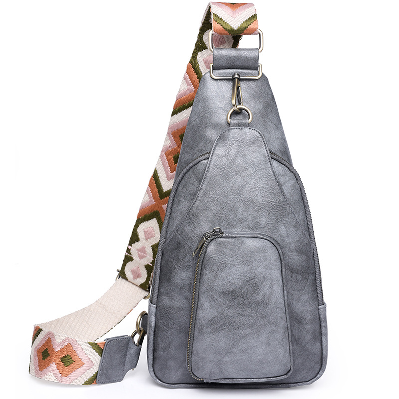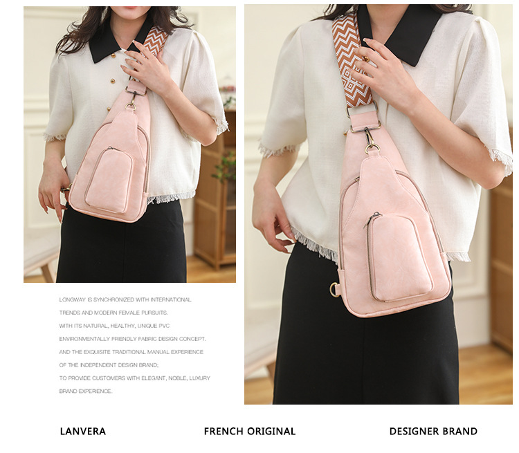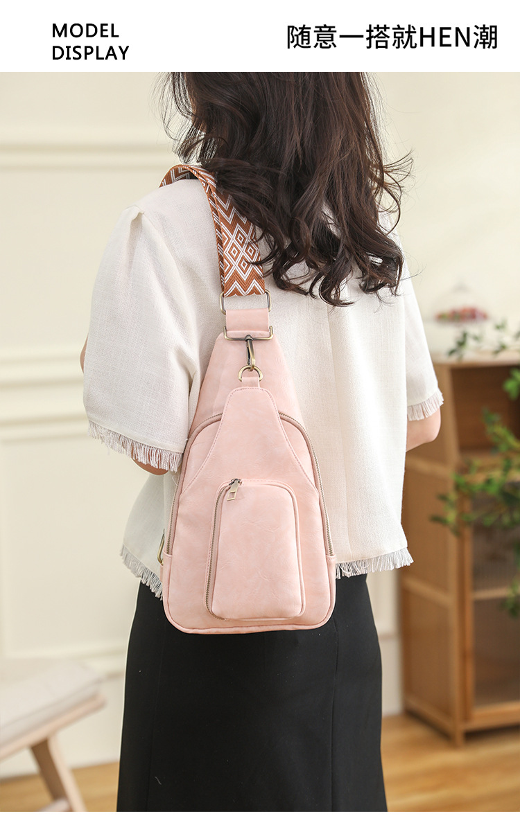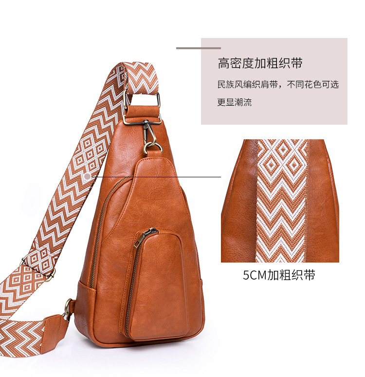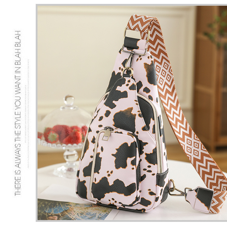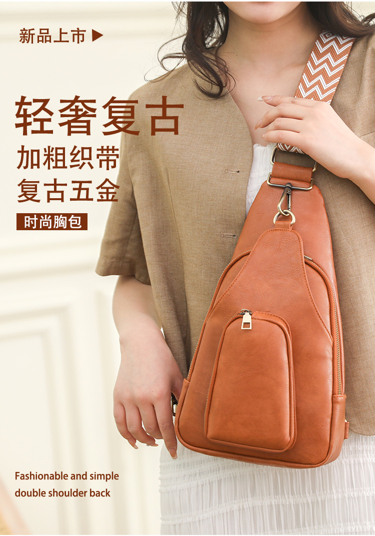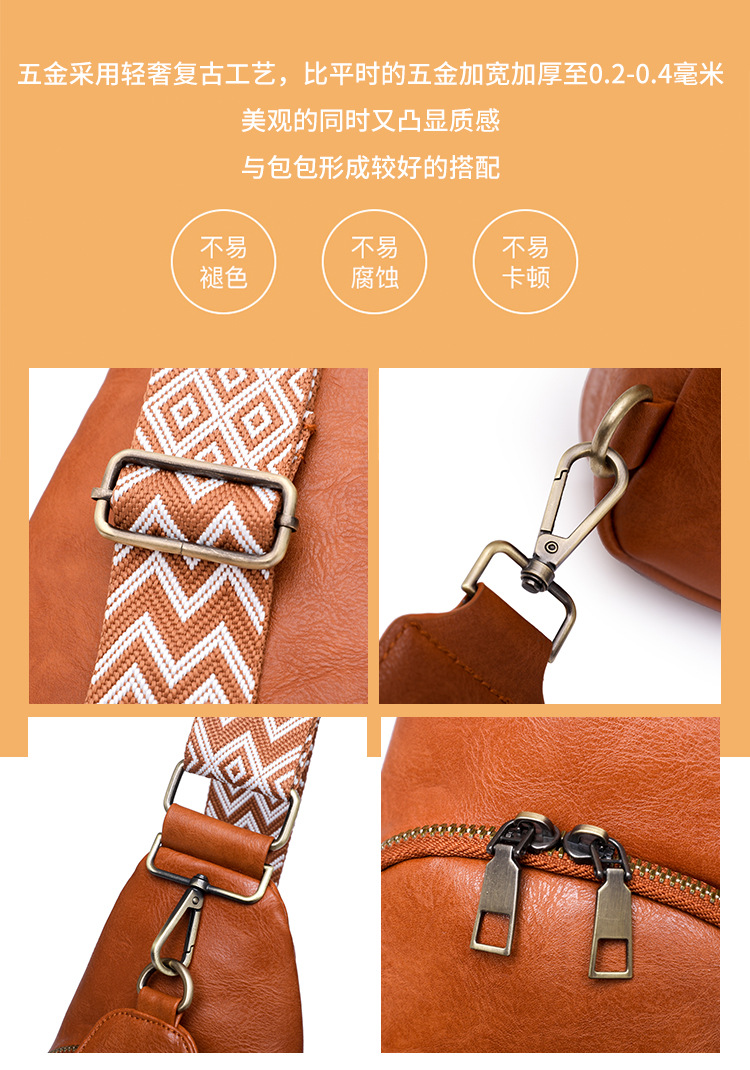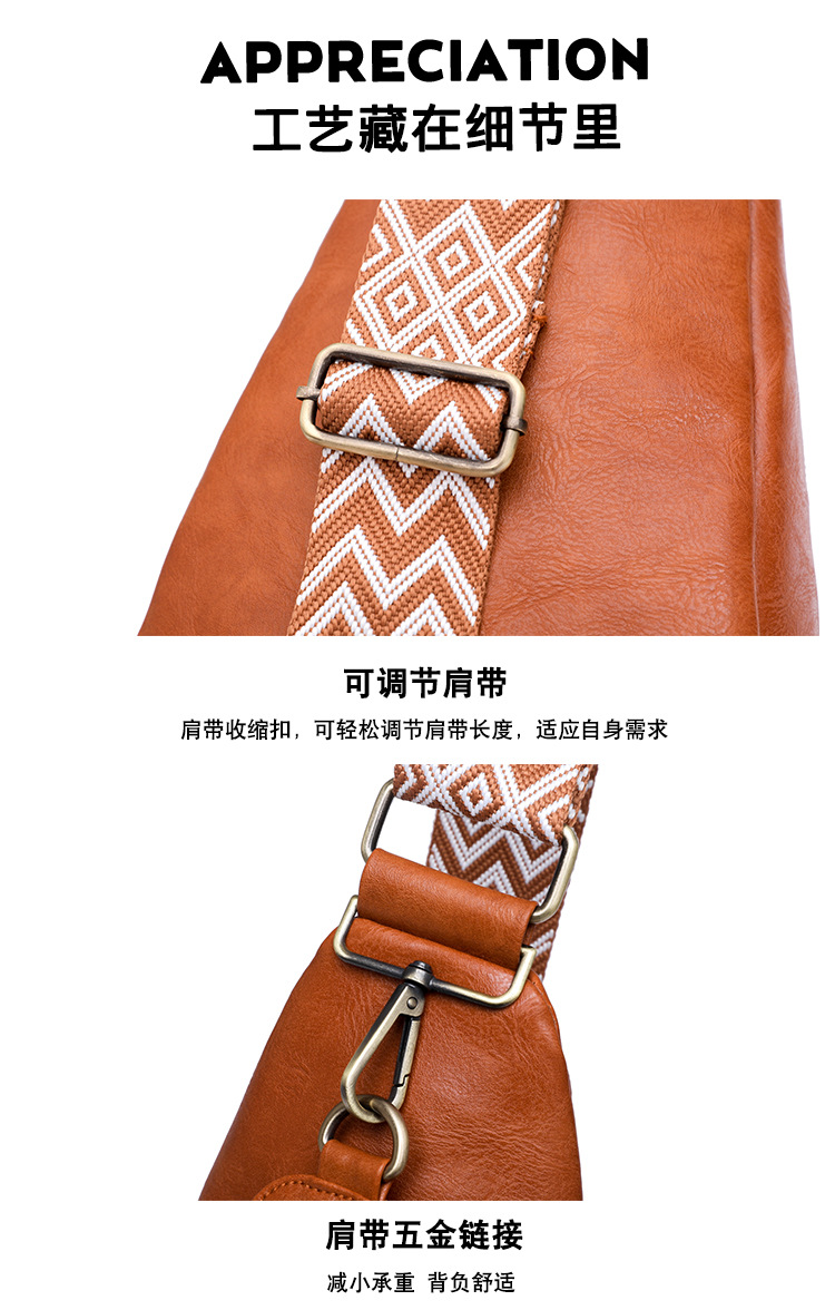 【产品特色】产品为多层加长单肩包胸包;前面侧拉小袋设计方便日常存取零碎物品;产品采用定制加厚PU皮面料,多种特色花纹可选,特别供应黑花豹纹,白花豹纹等新品种面料;产品全部使用轻奢复古风加粗五金配件,搭配5cm宽多种花色编织背带,美观典雅同时实用性强;产品背部左右两侧均设计有五金扣环,日常使用时左右两侧均可实现背负。