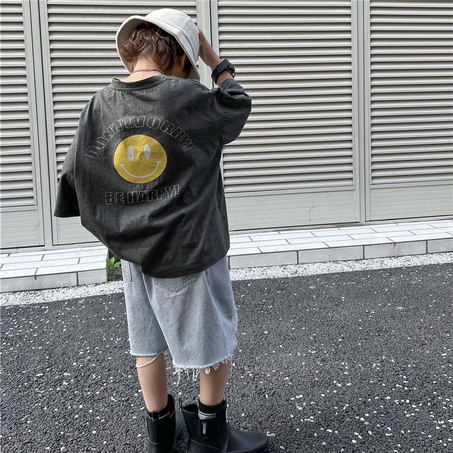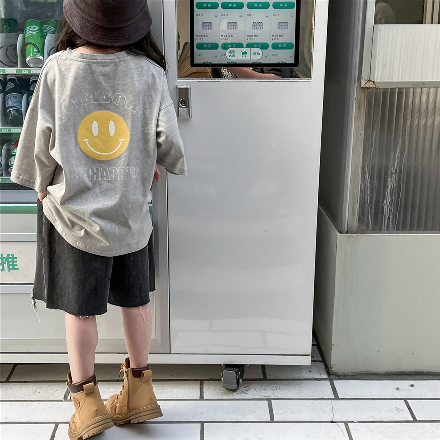2026 봄 여름 어린이 순면 반팔 티셔츠 한국 스타일 암석 무늬 웃는 얼굴 남녀 공용 중대형 어린이용 부드러운 반팔 티셔츠