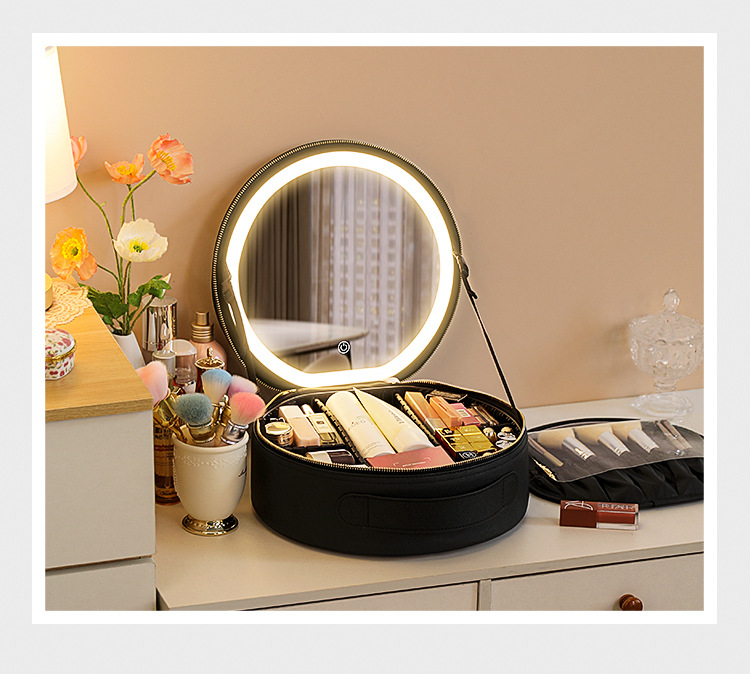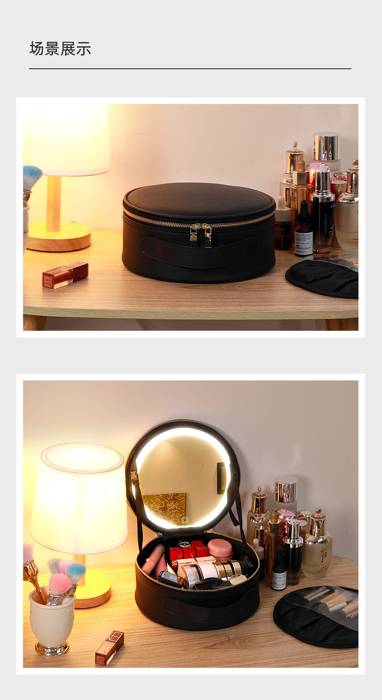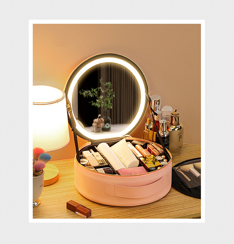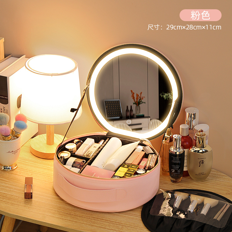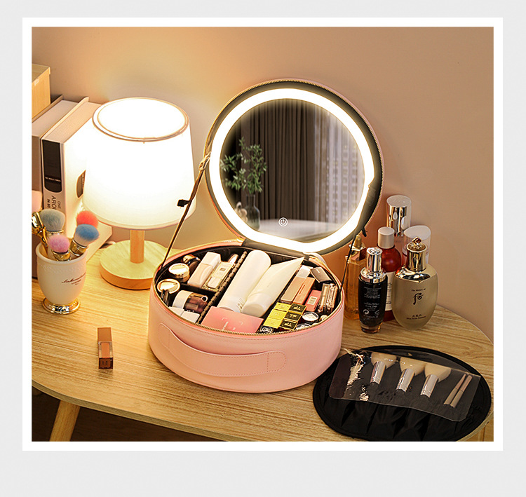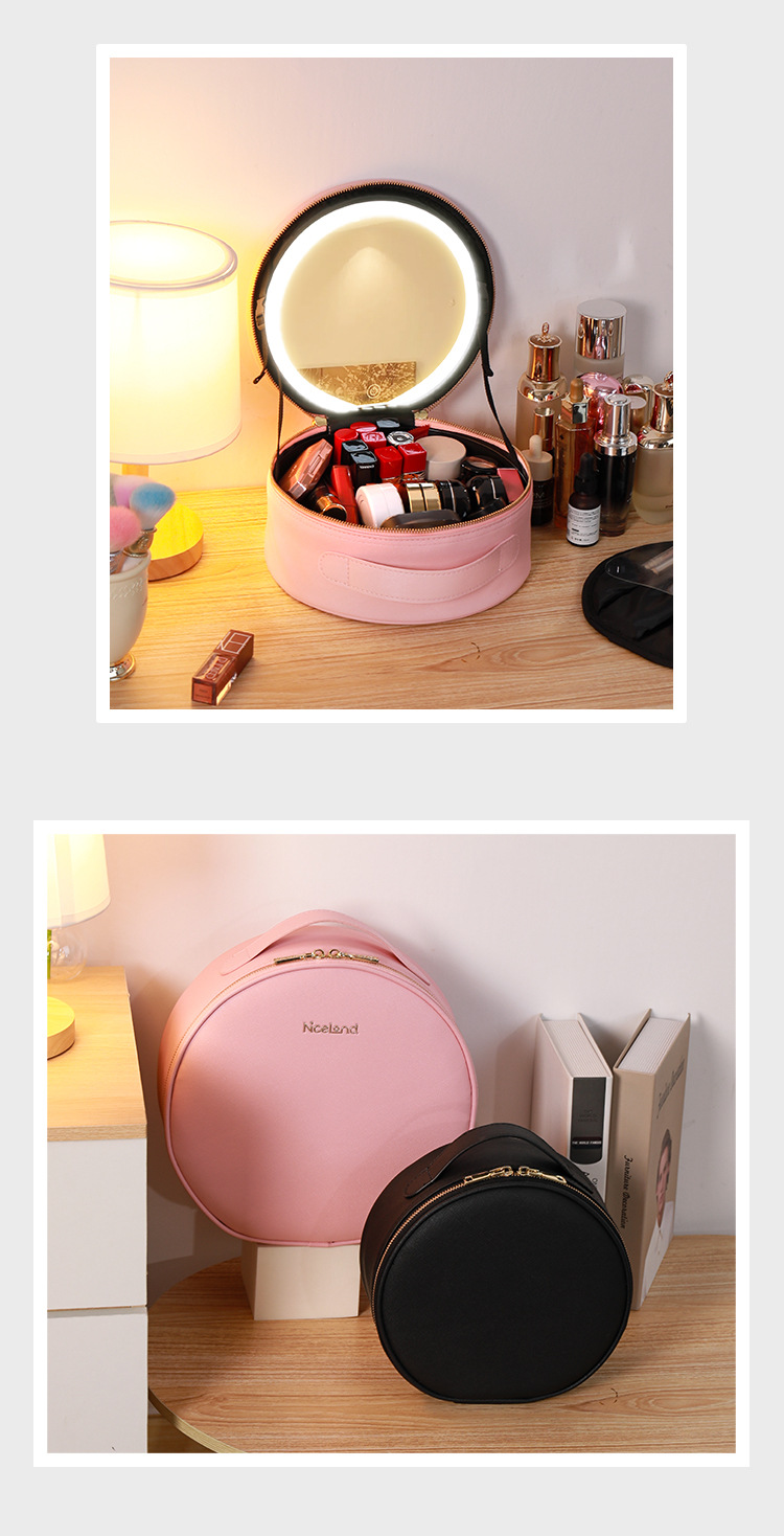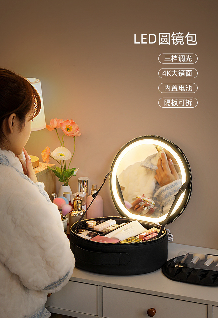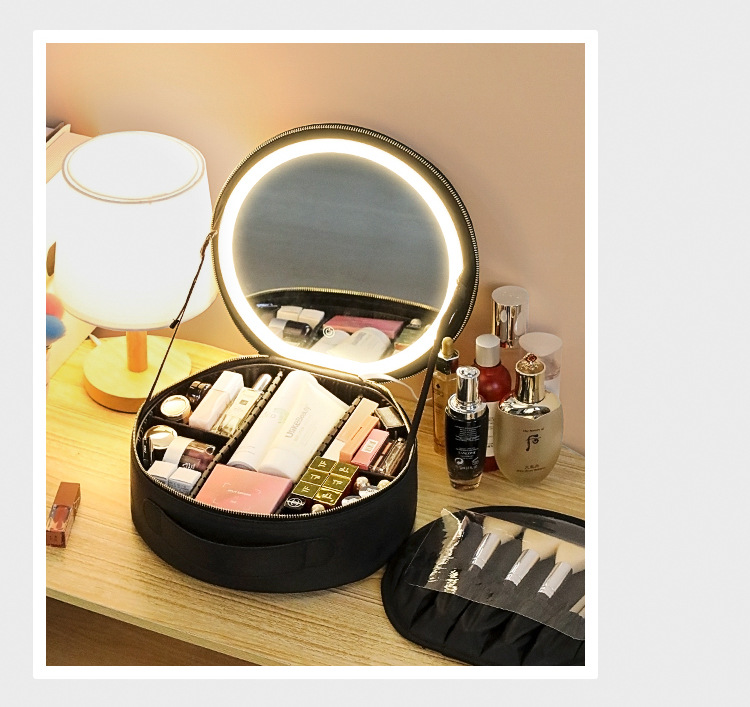 거울 라운드 화장품 가방 메이크업 가방 대용량 여행 휴대용 화장품 보관 가방 Led 빛