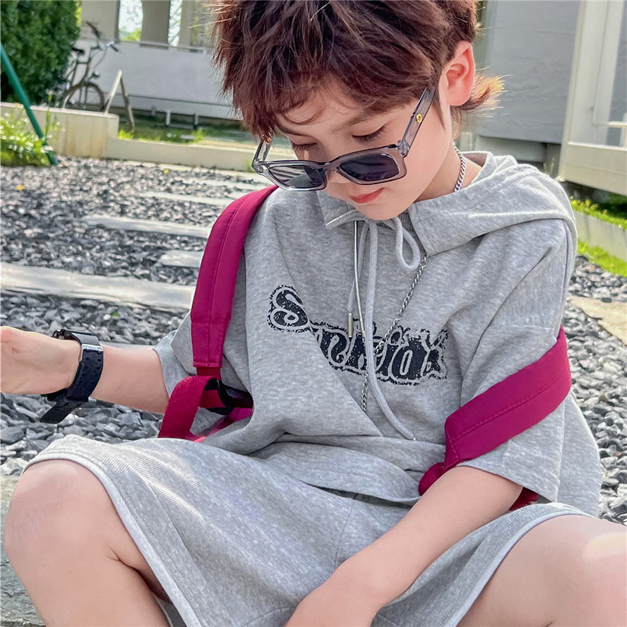 2026 봄/여름 모델 후드 아동 반팔 세트, 심플하고 트렌디한 레터링 패치, 남아 여아 유아 반바지 세트, 스타일리쉬스토어 가기