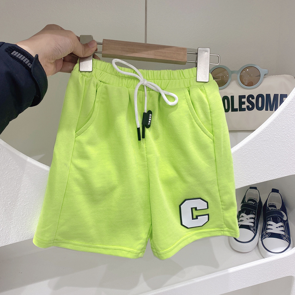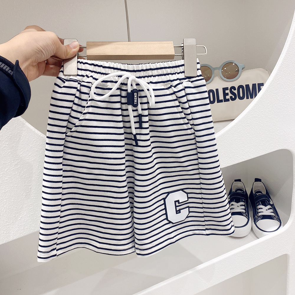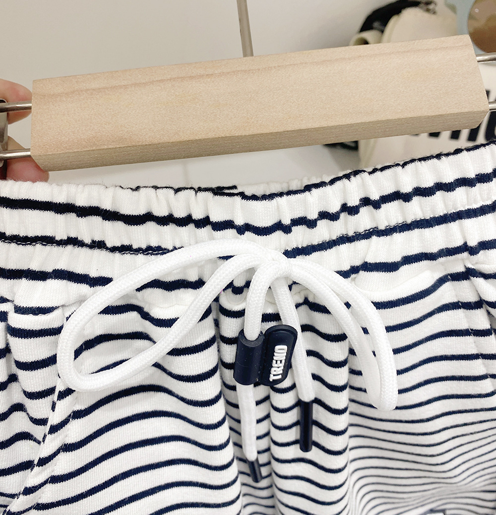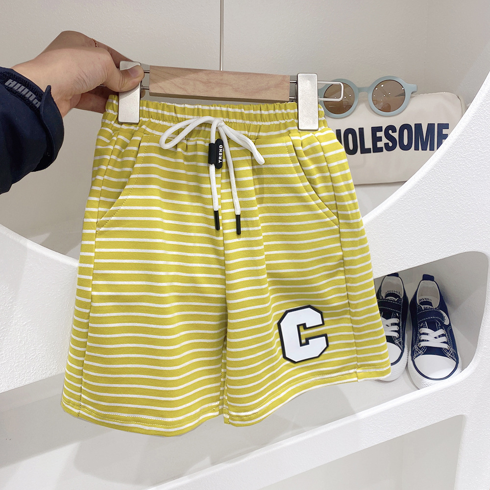 어린이 줄무늬 니트 탄성 스포츠 반바지 2023 여름 새로운 한국 스타일 아동 의류 소년 운동복 중간 바지 도매스토어 가기