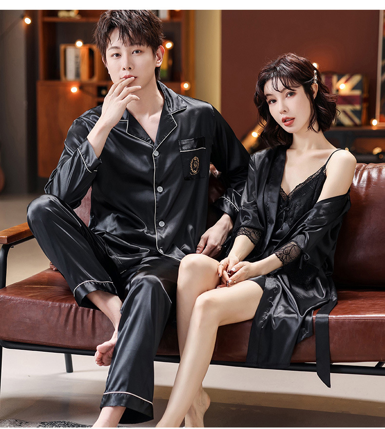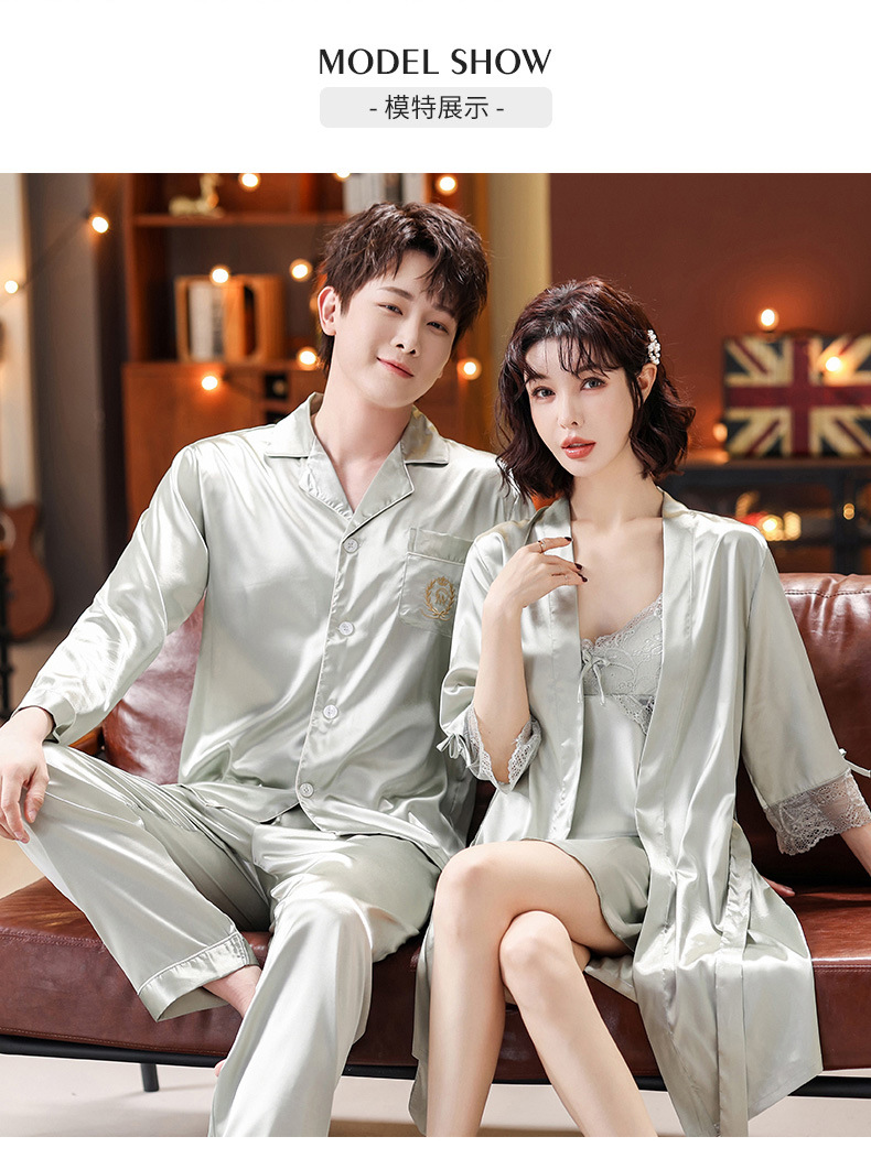 봄과 가을 커플 잠옷 여성용 여름 아이스 실크 얇은 잠옷 남성용 단색 긴팔 홈웨어 투피스 세트스토어 가기