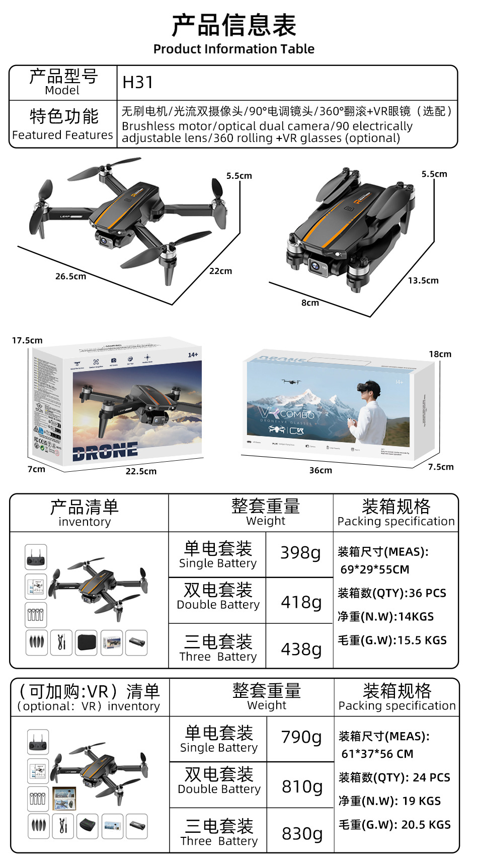 H31 브러시리스 원격 조종 드론 HD 항공 촬영 원격 조종 항공기 VR 안경 영상 전송 쿼드콥터 긴 비행시간스토어 가기