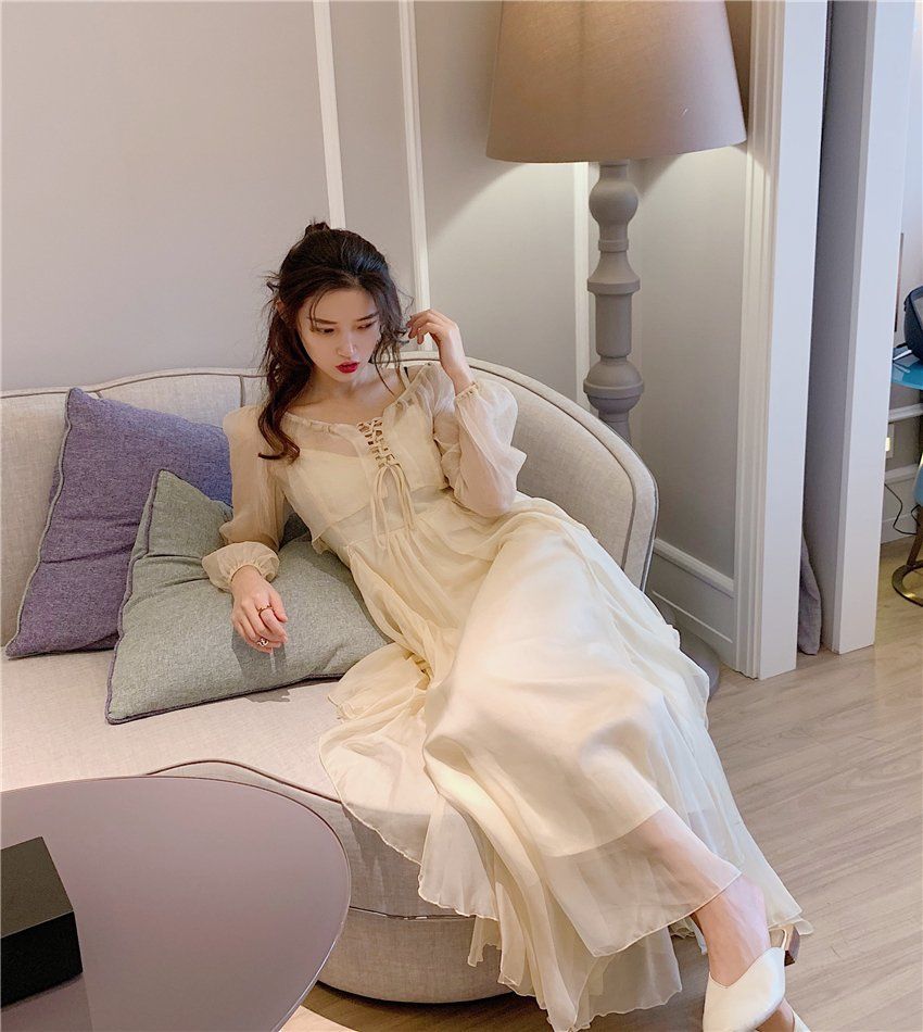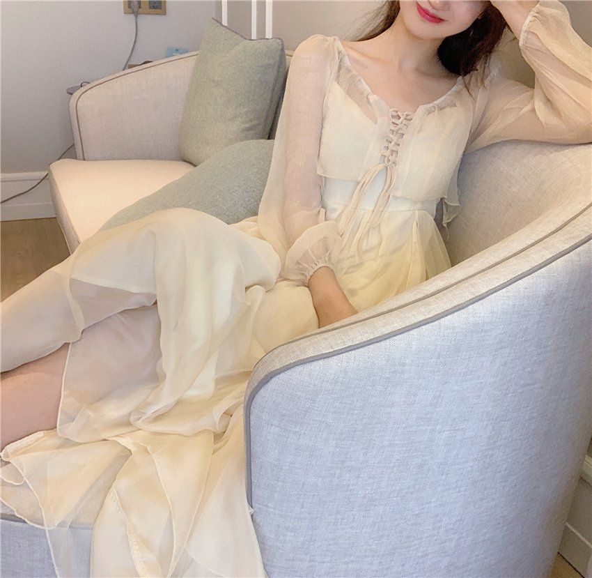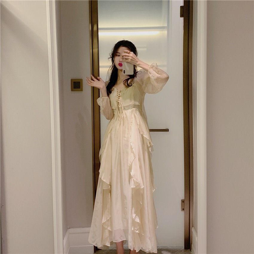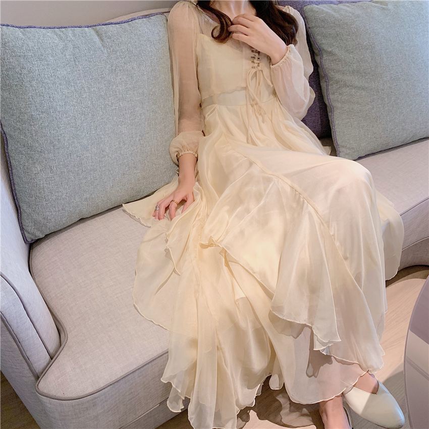 세트 여성의 새로운 프랑스 스타일 첫사랑 Platycodon Grandiflorum 요정 스커트 슈퍼 요정 슬리밍 긴팔 원피스 투피스 여성용 원피스스토어 가기
