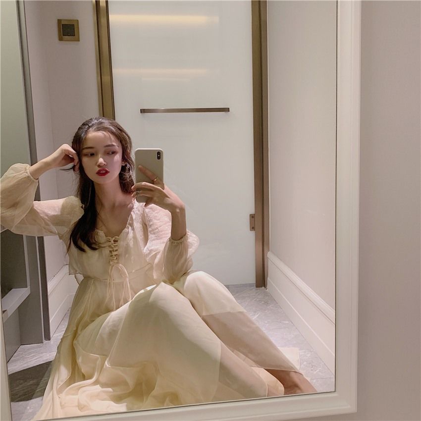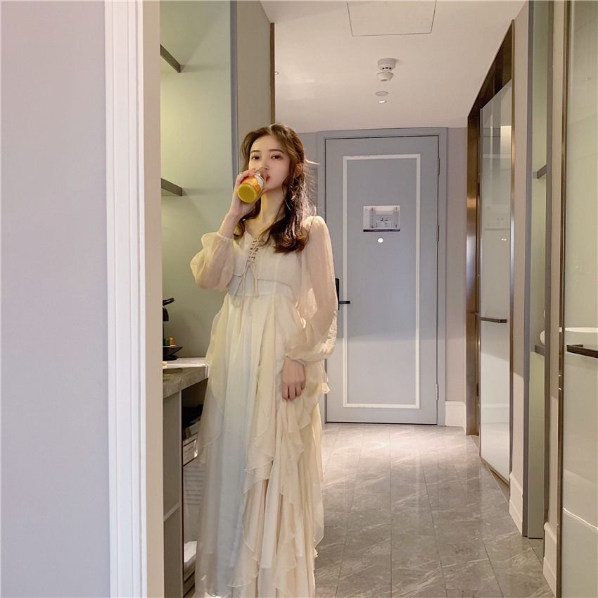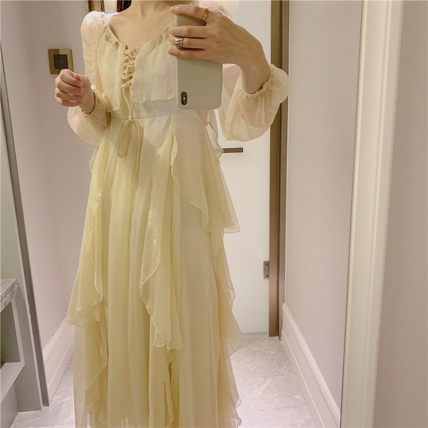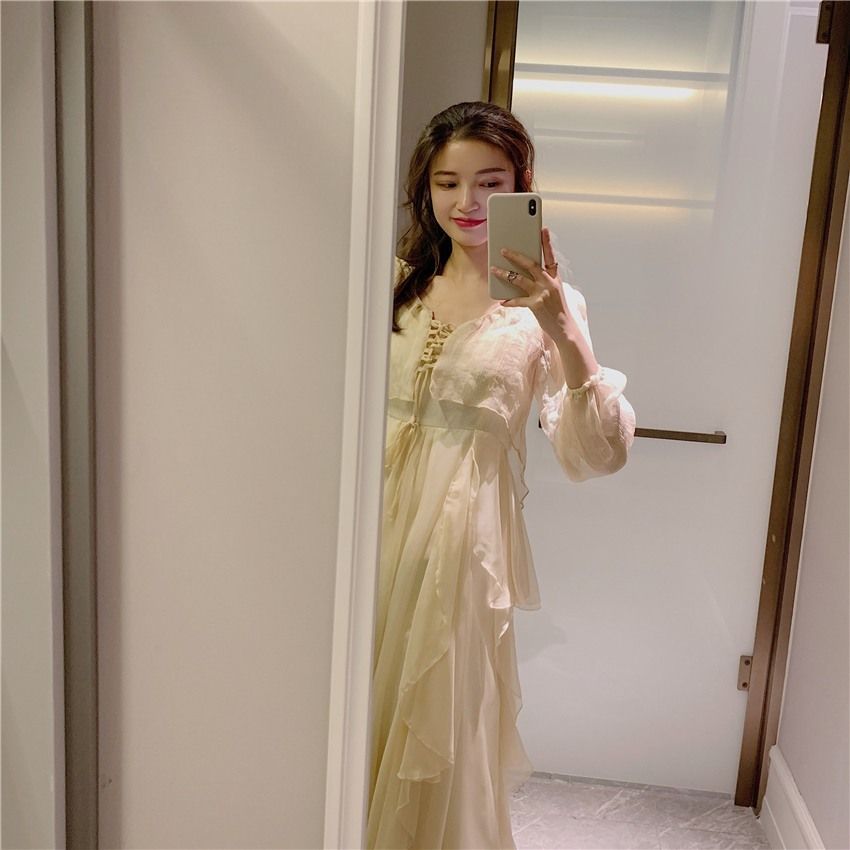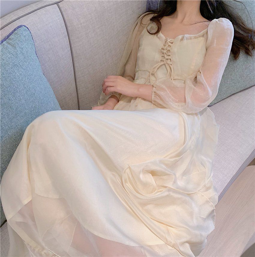 세트 여성의 새로운 프랑스 스타일 첫사랑 Platycodon Grandiflorum 요정 스커트 슈퍼 요정 슬리밍 긴팔 원피스 투피스 여성용 원피스스토어 가기