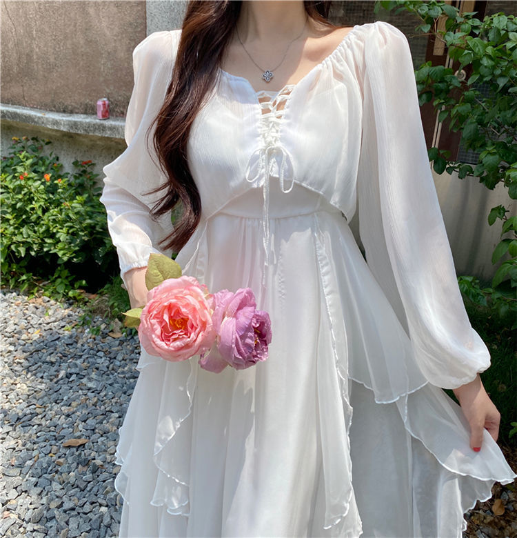 세트 여성의 새로운 프랑스 스타일 첫사랑 Platycodon Grandiflorum 요정 스커트 슈퍼 요정 슬리밍 긴팔 원피스 투피스 여성용 원피스