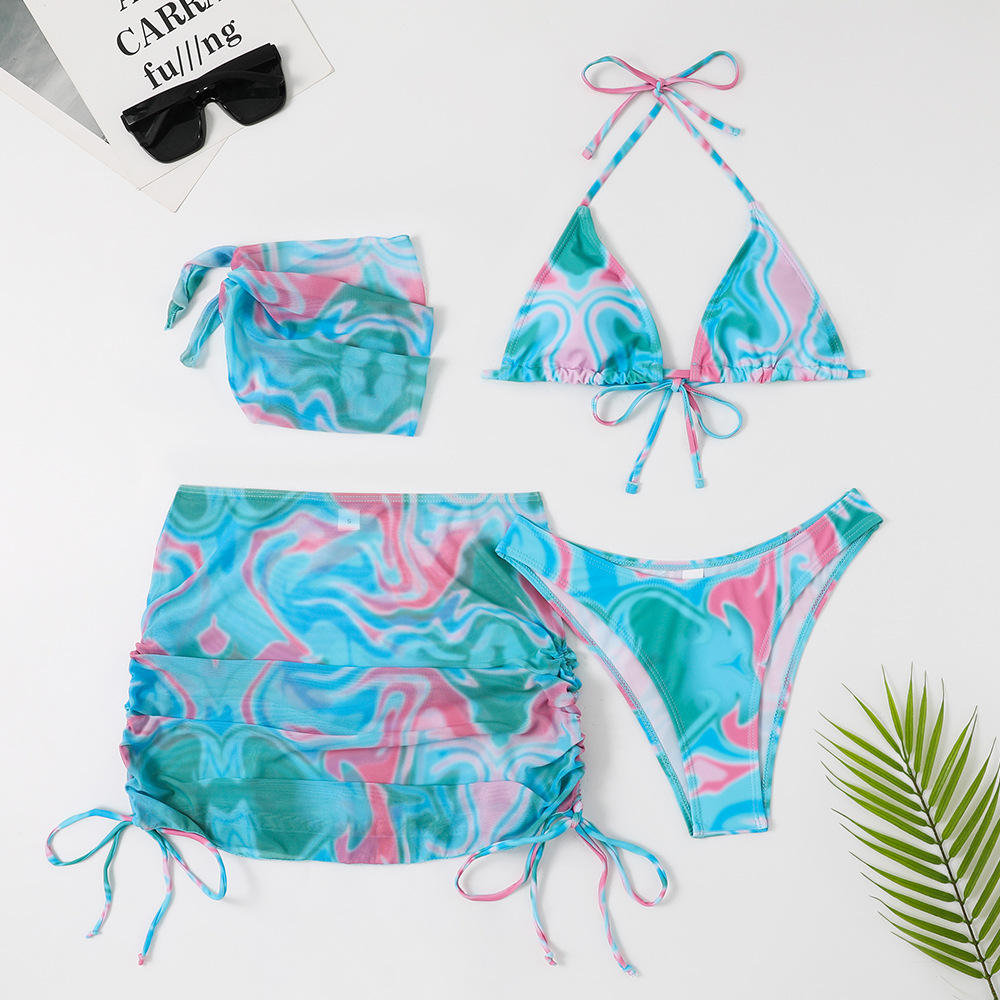 2023 유럽 및 미국 대외 무역 수영복 여성용 스플릿 4 피스 세트 스커트 타이 다이 인 AliExpress 크로스 보더 비키니 수영복