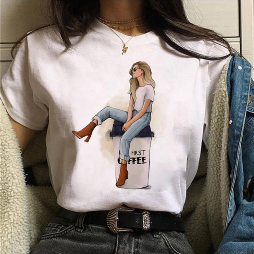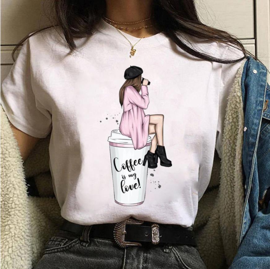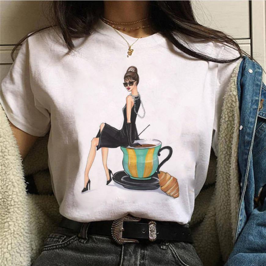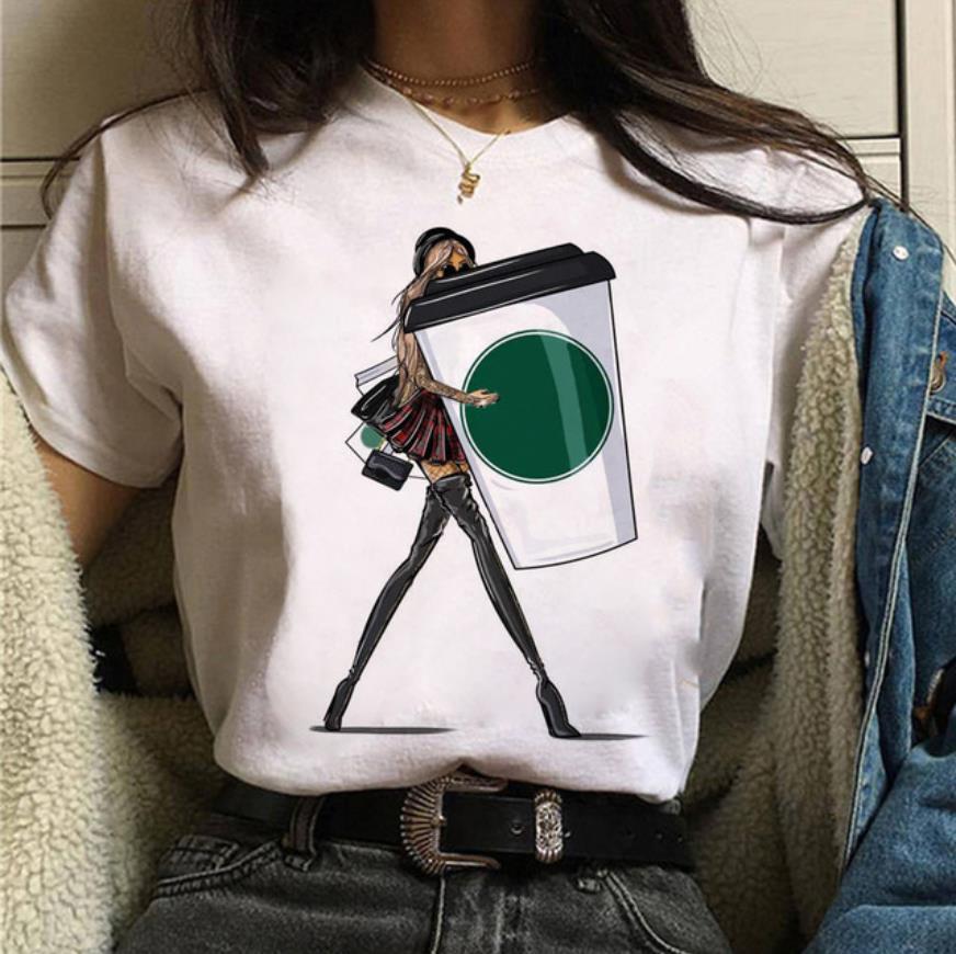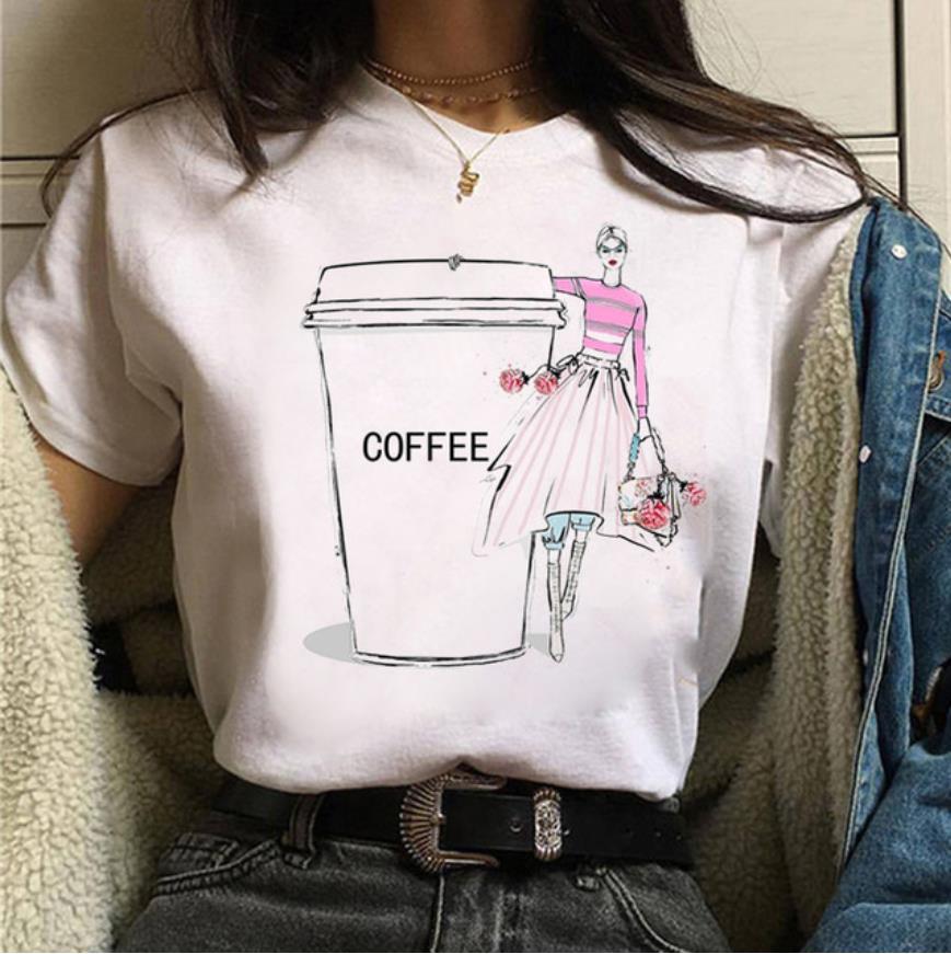 패션 여성 티셔츠 커피 타임과 소녀 프린트 짧은 소매 여성 여름 90 년대 소녀 캐주얼 티셔츠