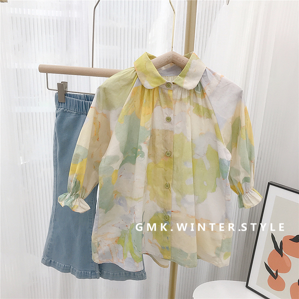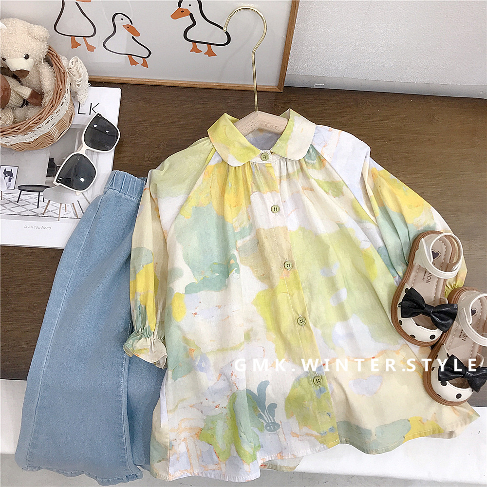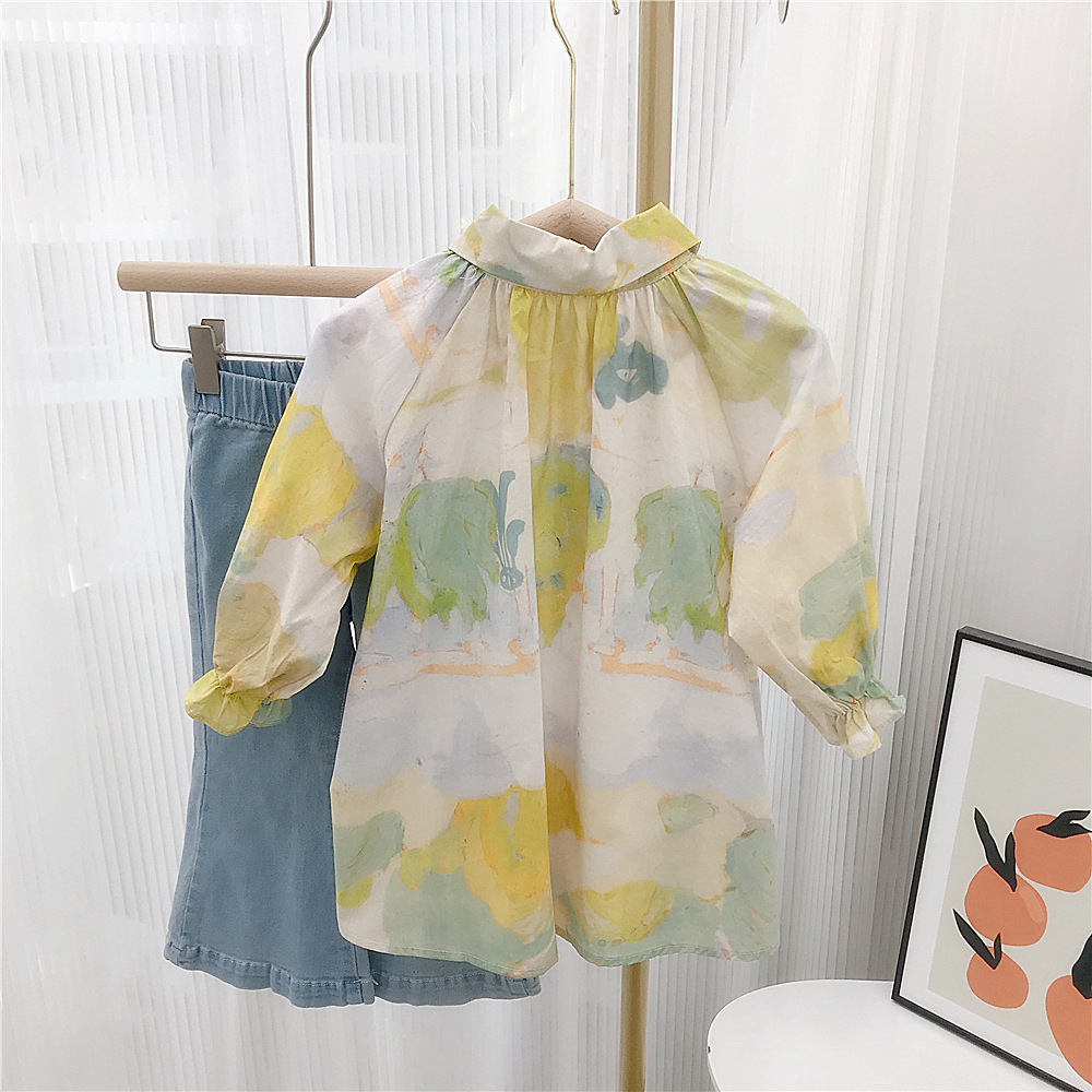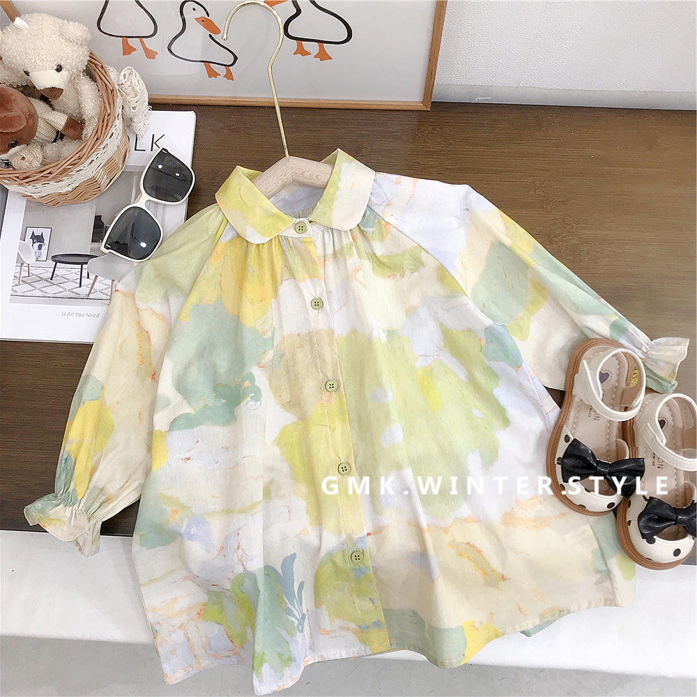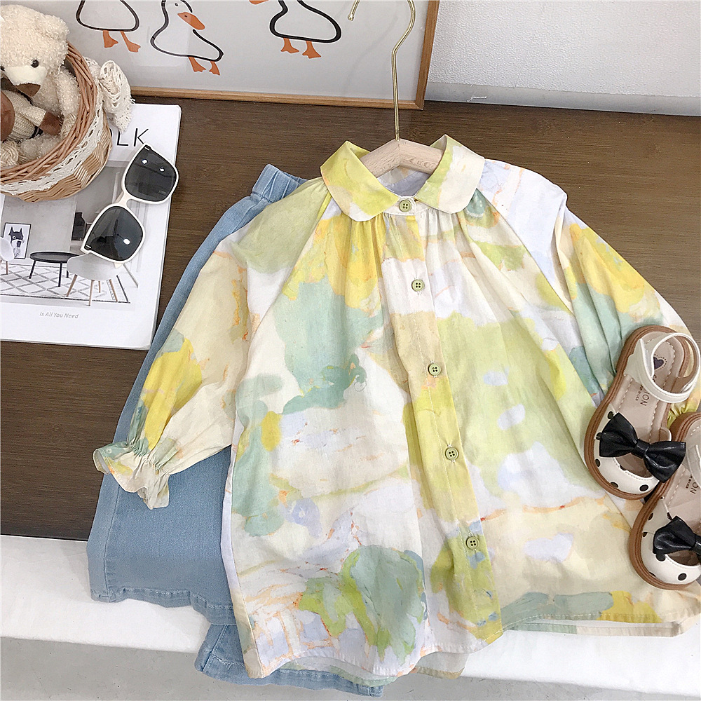 봄 여름 가을 새로운 한국 아동복 여아 중간 길이 셔츠 예술적 타이 염색 프린트 셔츠 스커트 자외선 차단제 의류 해외 무역