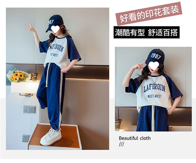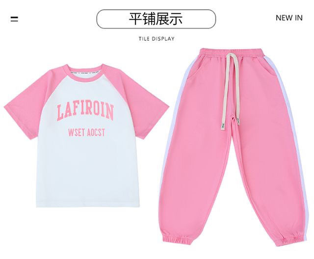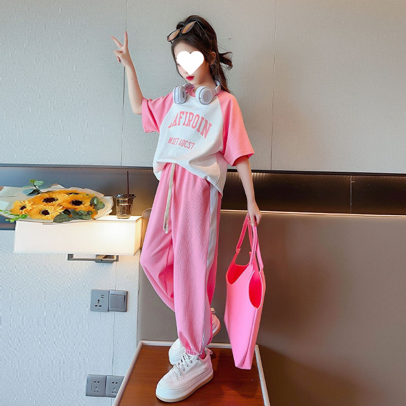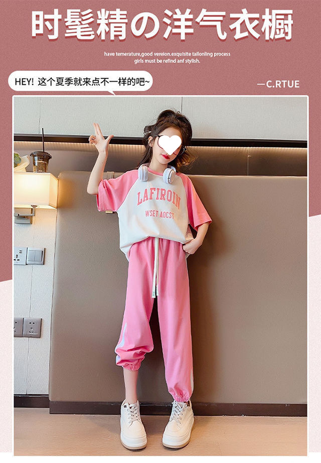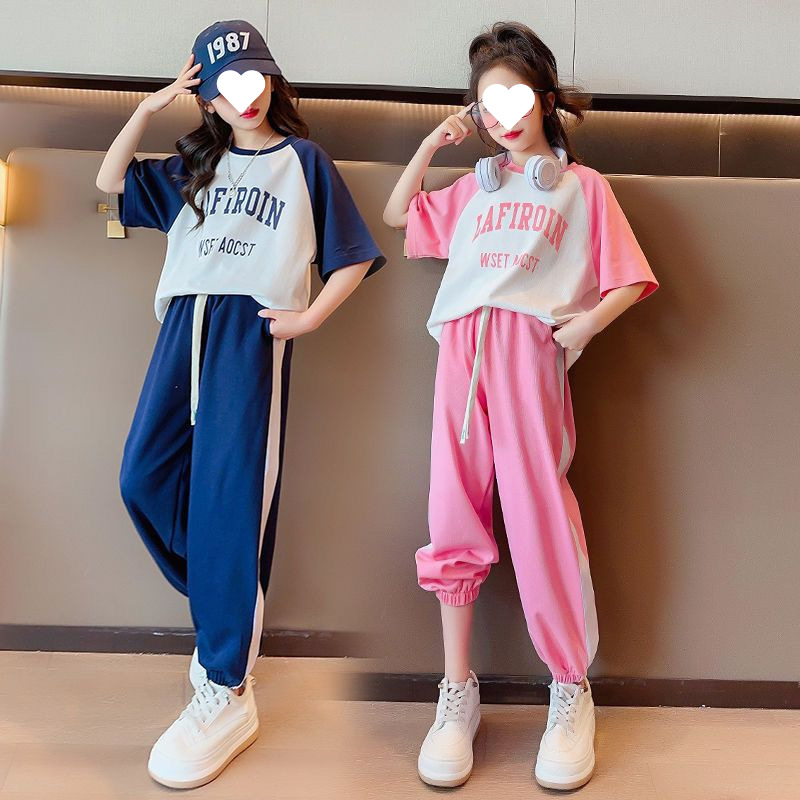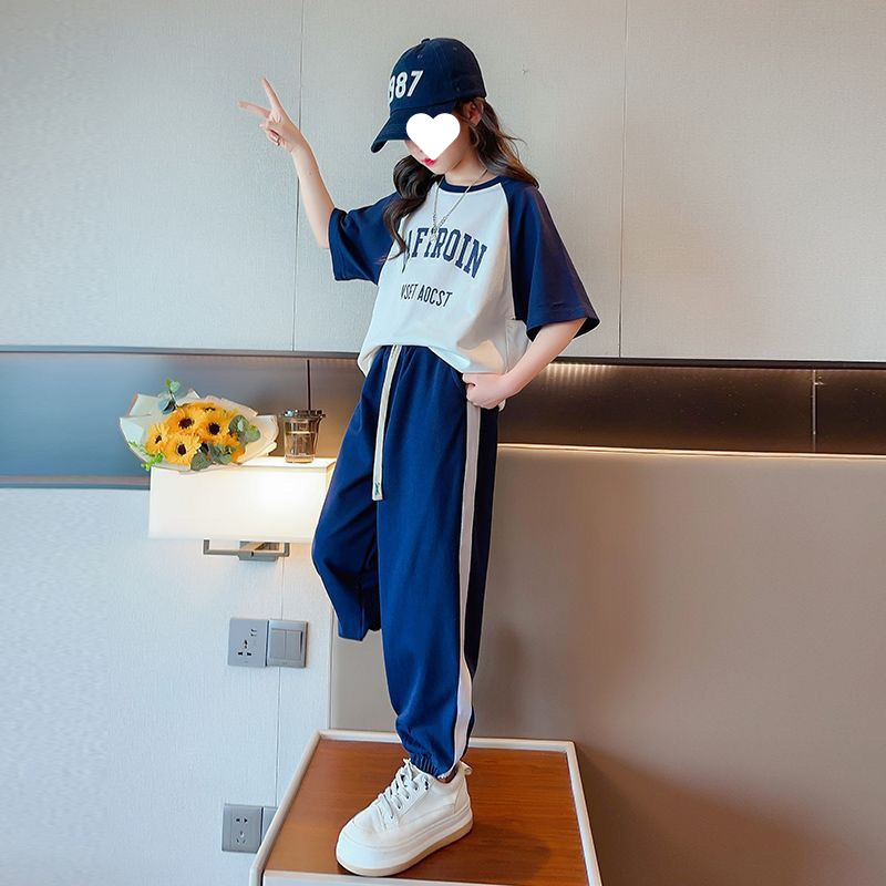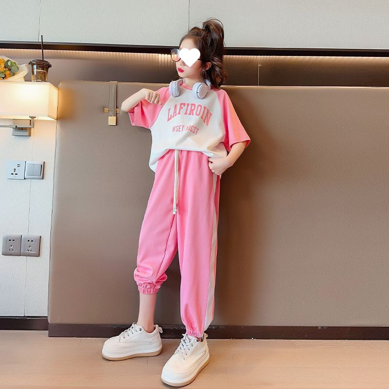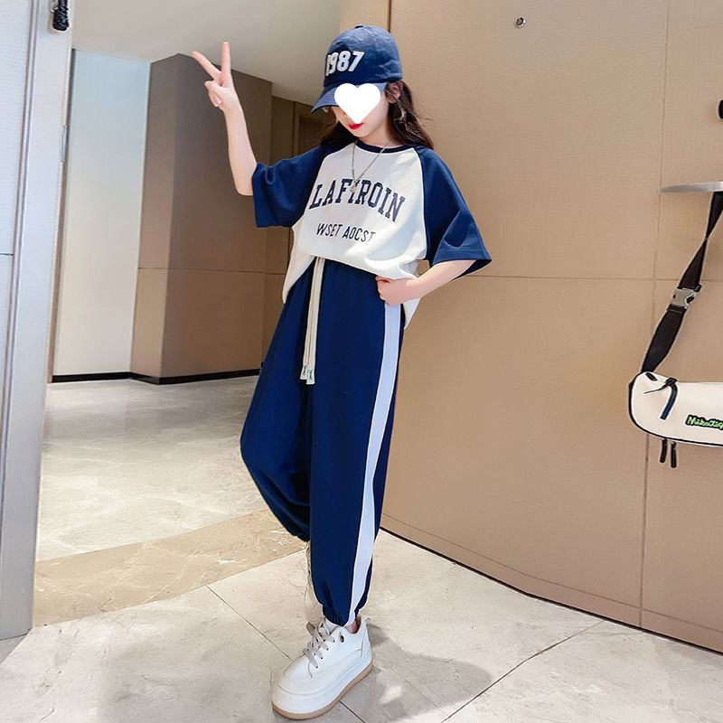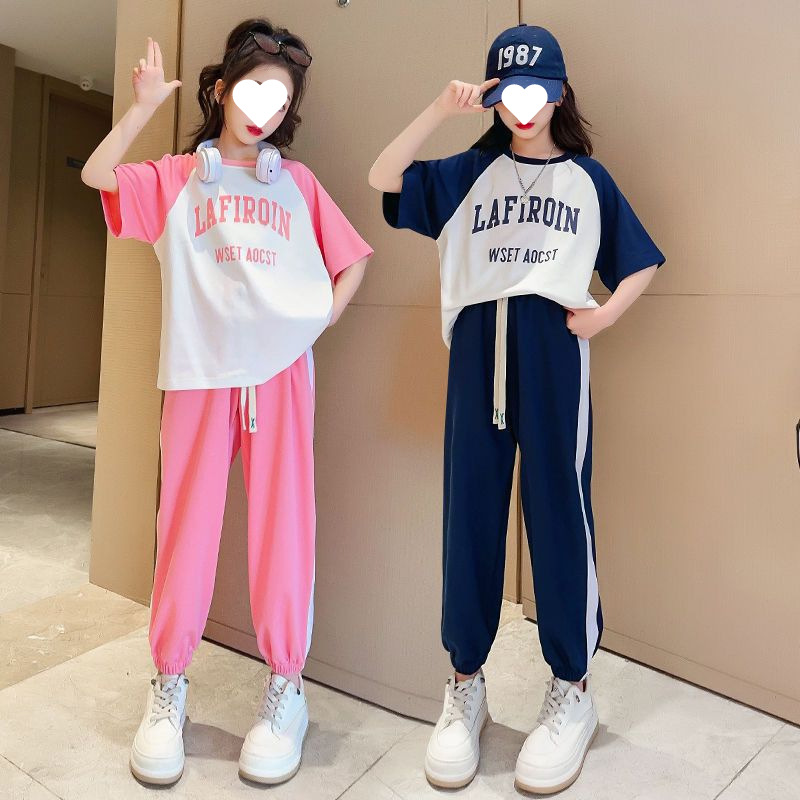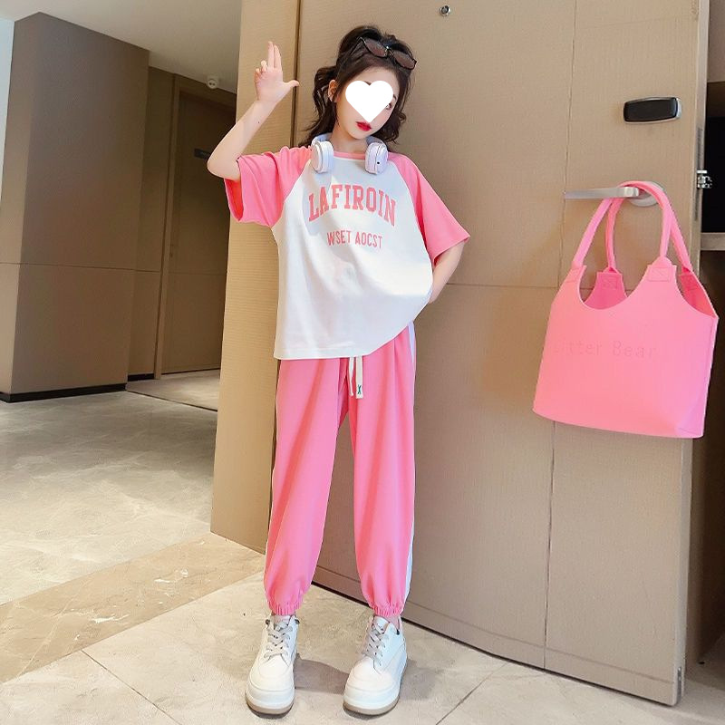여아 여름 원피스 컬러 매칭 캐주얼 세트 2023 새로운 아동 유행 레터 프린트 할란 팬츠 투피스 세트 트렌디스토어 가기
