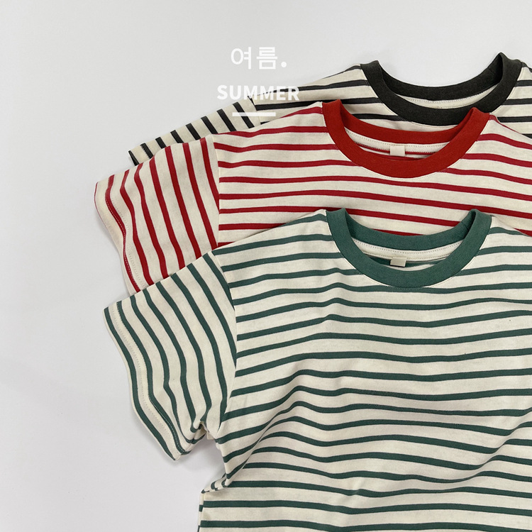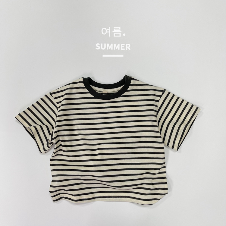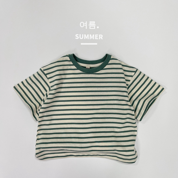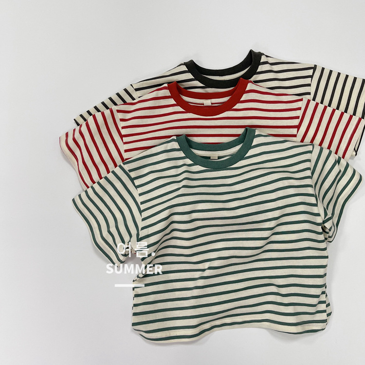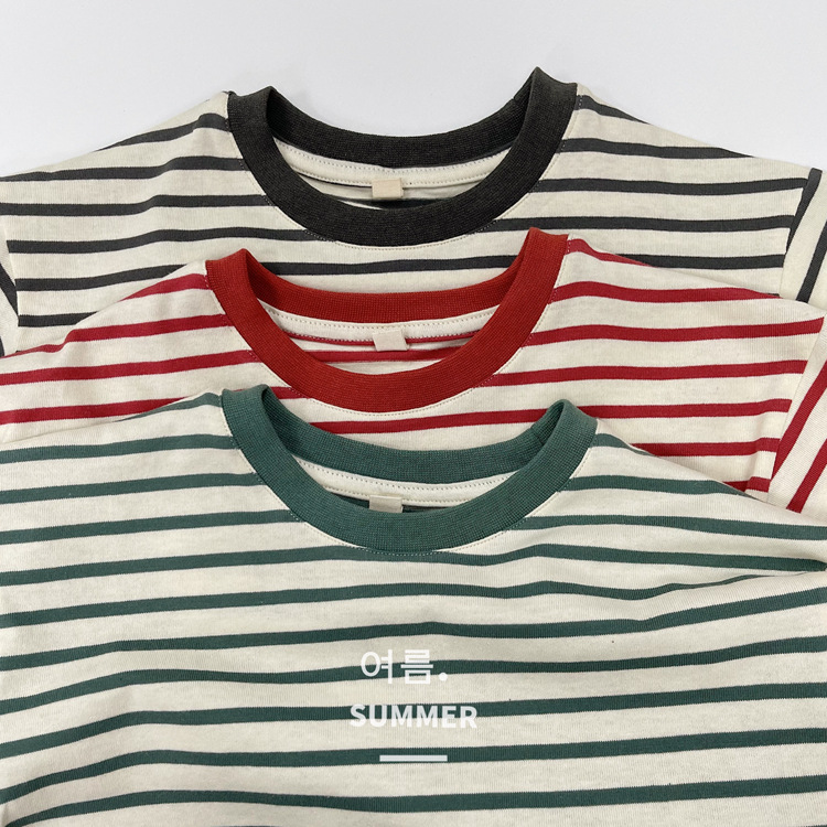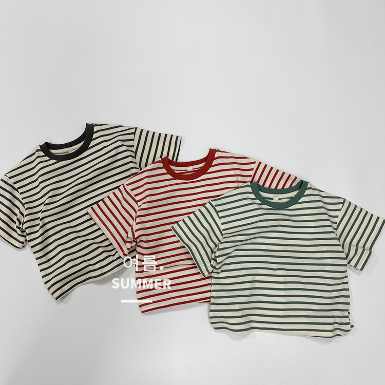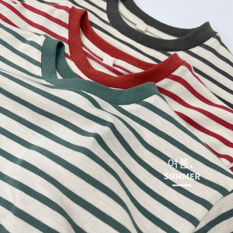 시원한 통기성 스트라이프 한국 스타일 어린이 반팔 티셔츠 여름 새로운 소년 소녀 니트 캐주얼 스트라이프 티셔츠 면스토어 가기