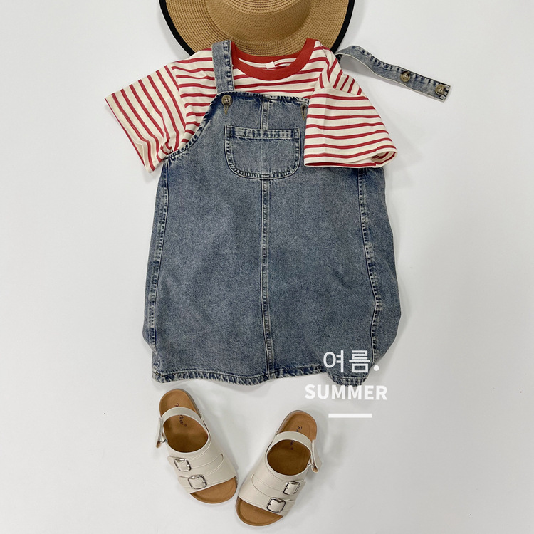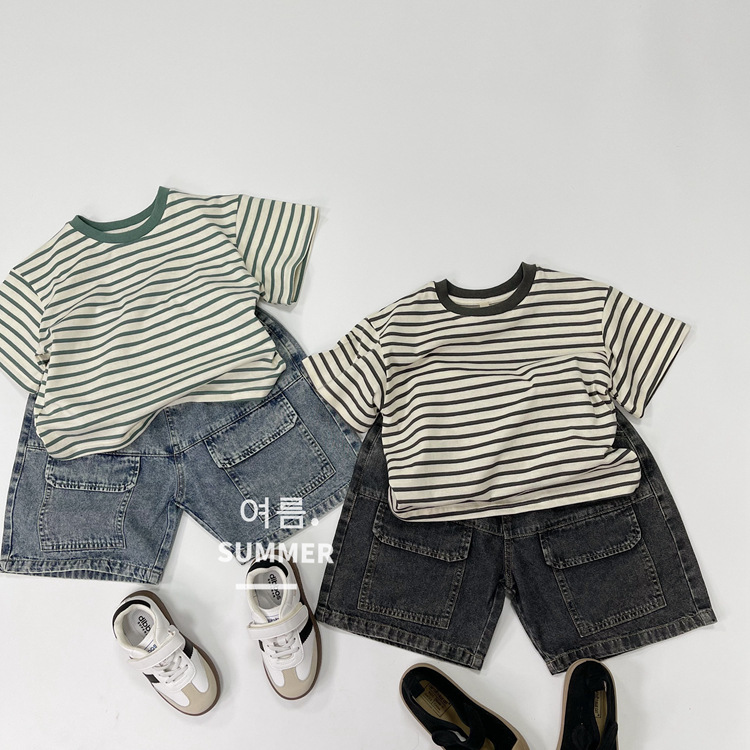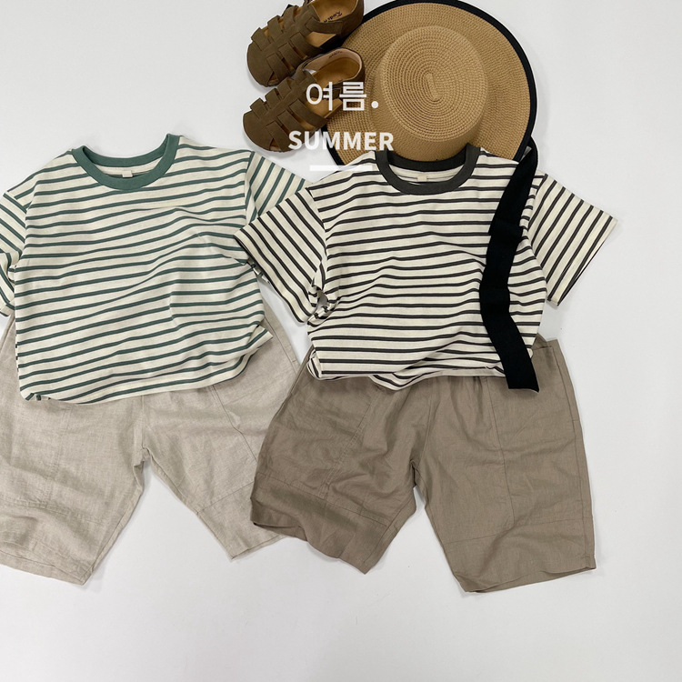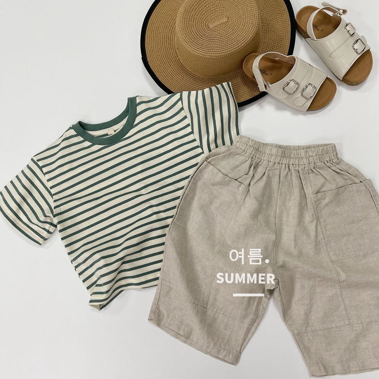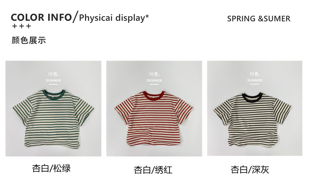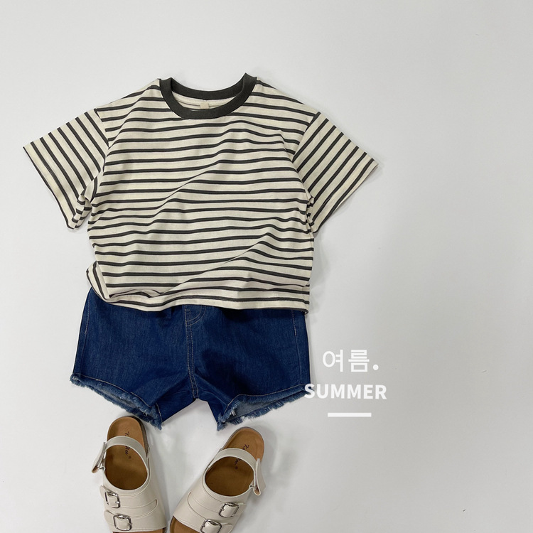 시원한 통기성 스트라이프 한국 스타일 어린이 반팔 티셔츠 여름 새로운 소년 소녀 니트 캐주얼 스트라이프 티셔츠 면스토어 가기