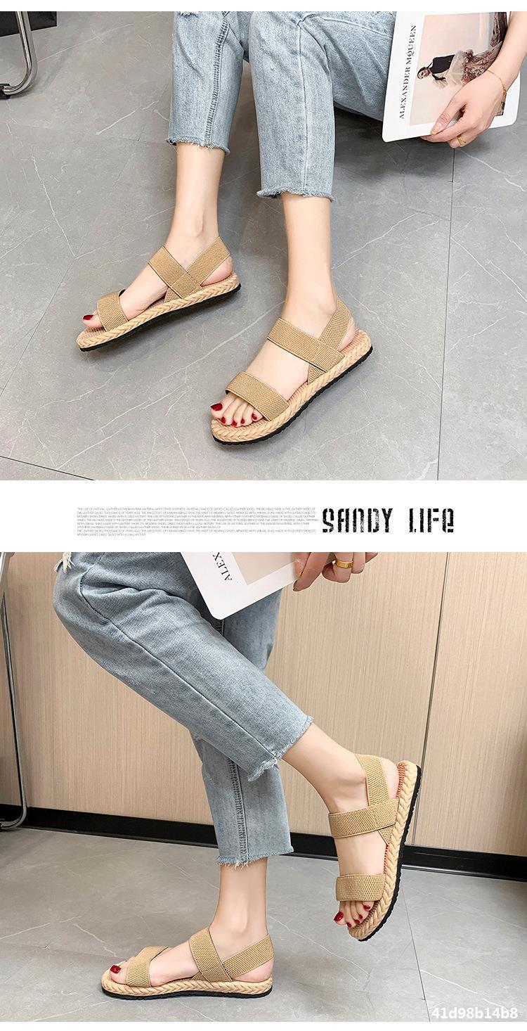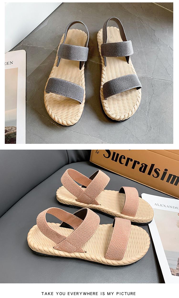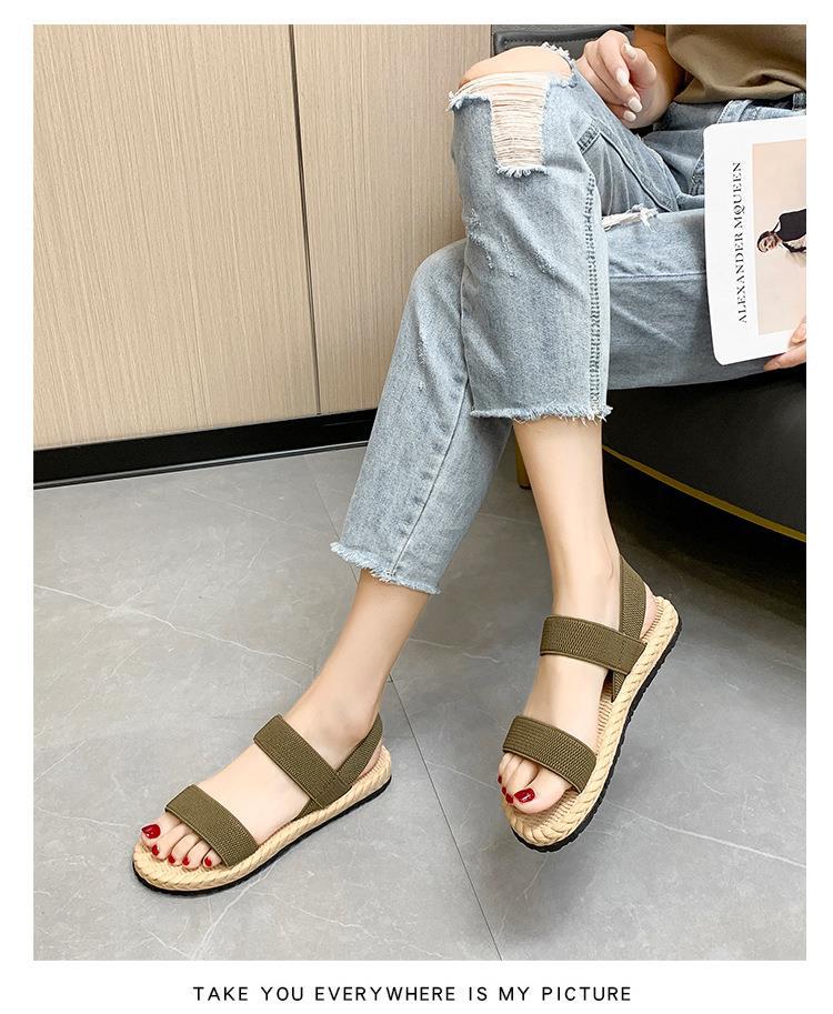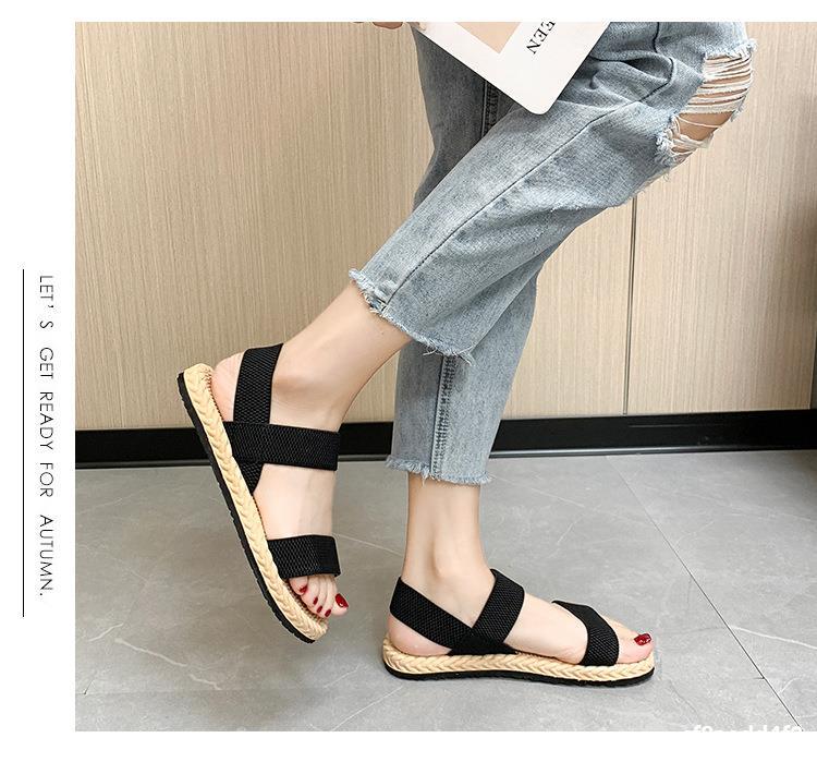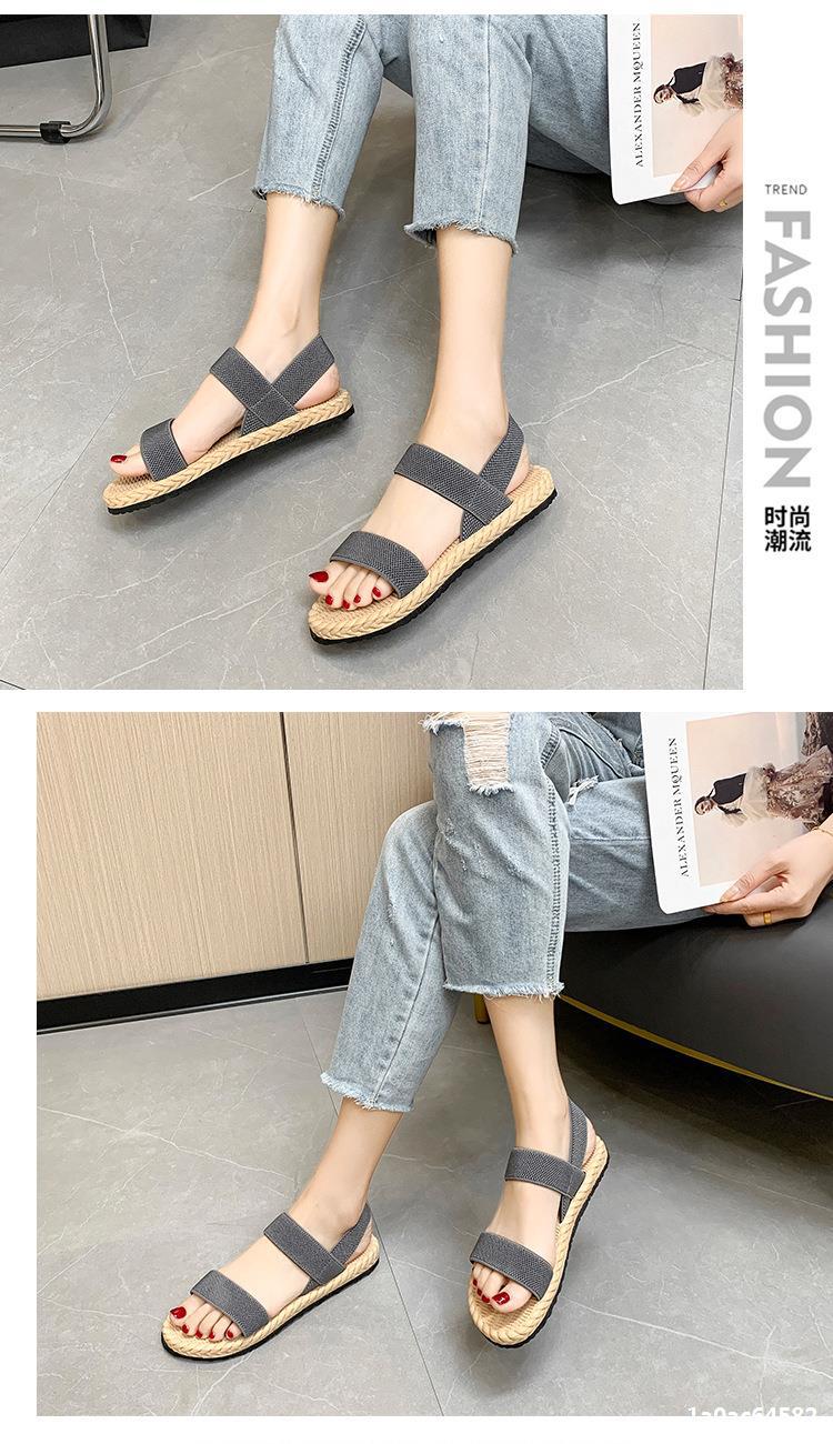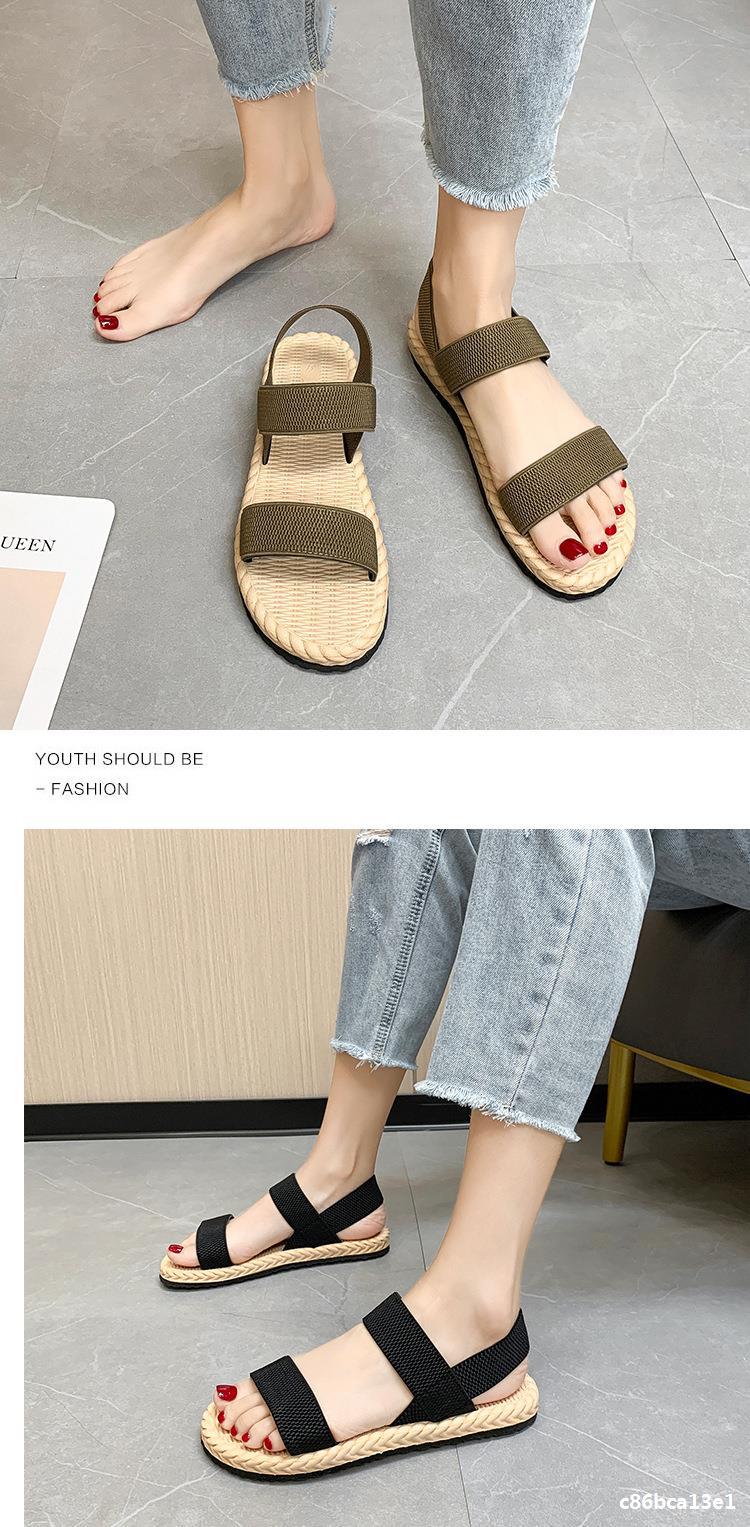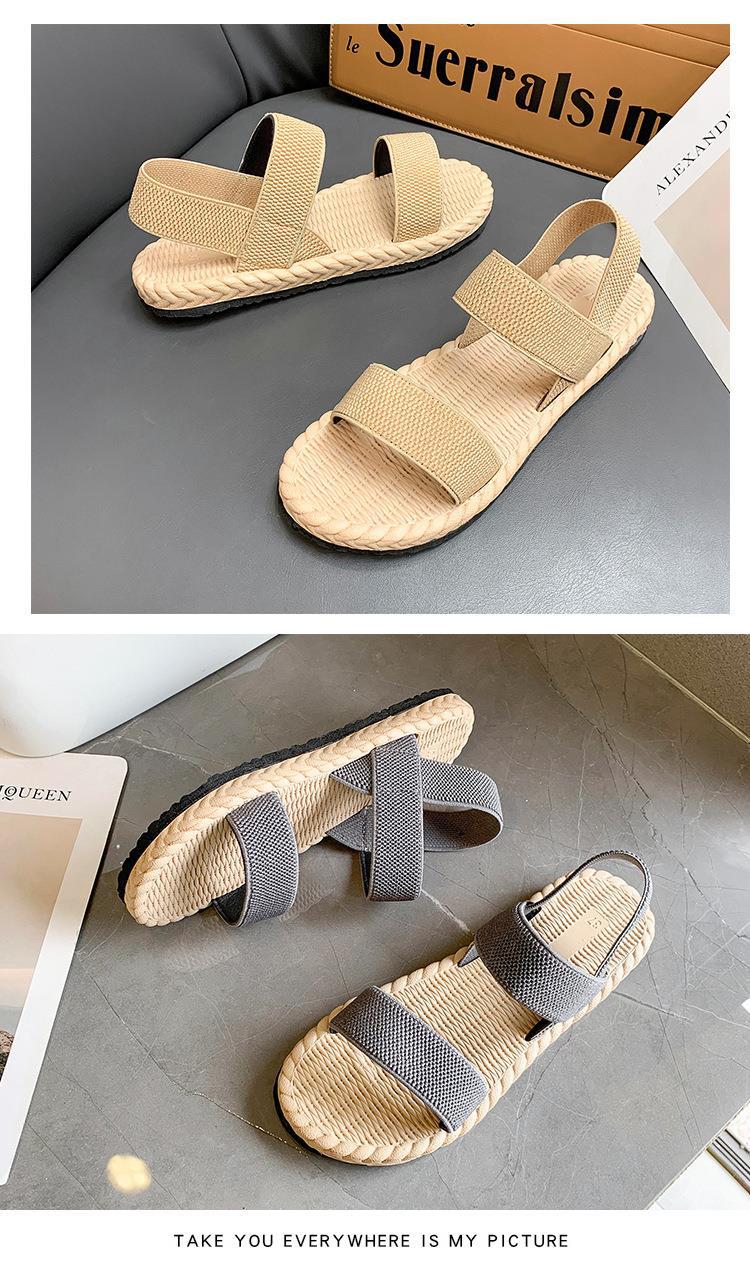 여성용 신축성있는 밴드 크로스 플랫 슈즈 2023 새로운 샌들 여성용 여름 착용 모조 짚 짠 린넨 로마 샌들스토어 가기